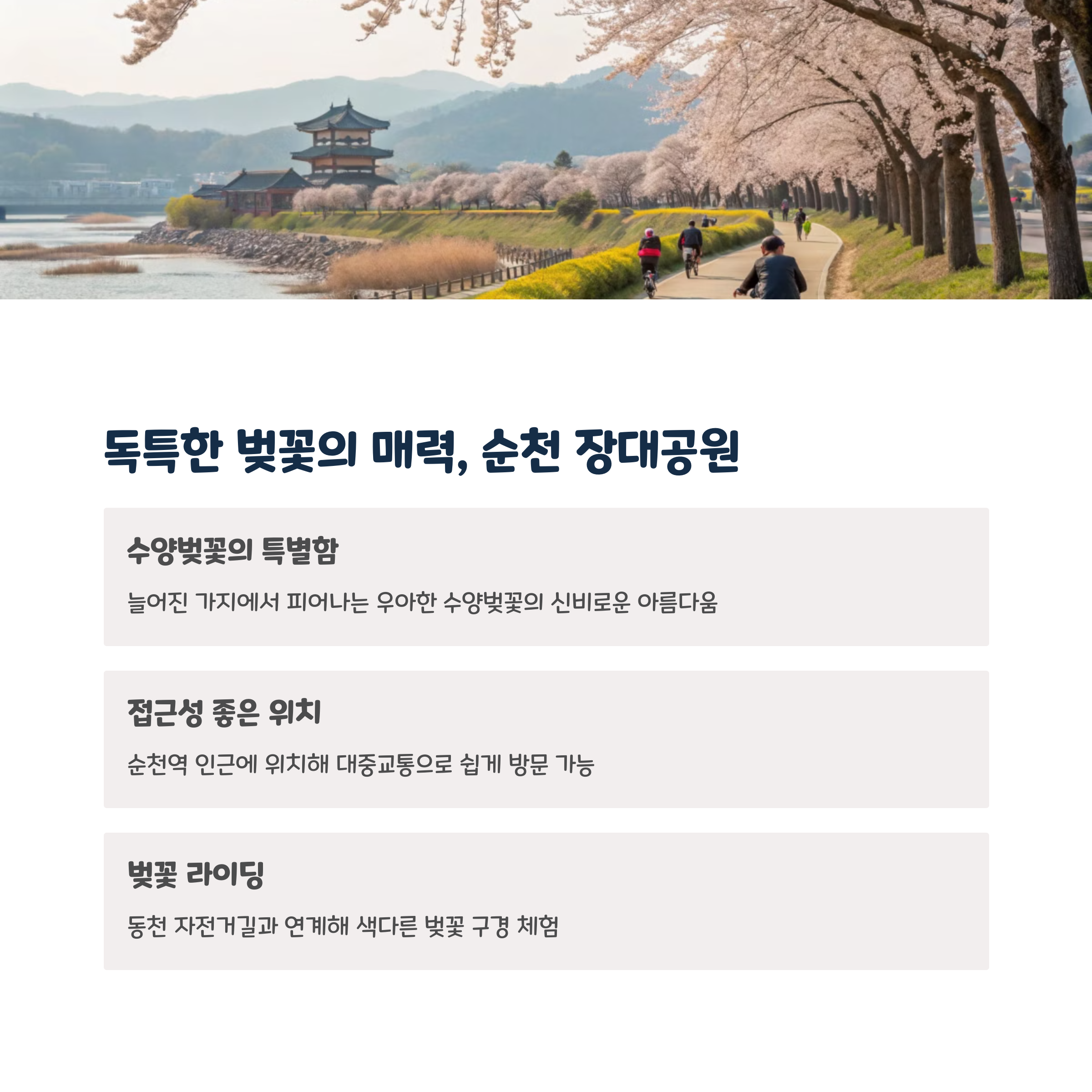 | 순천 장대공원 | 수양벚꽃과 반 벚꽃길이 어우러진 특별한 공간 |