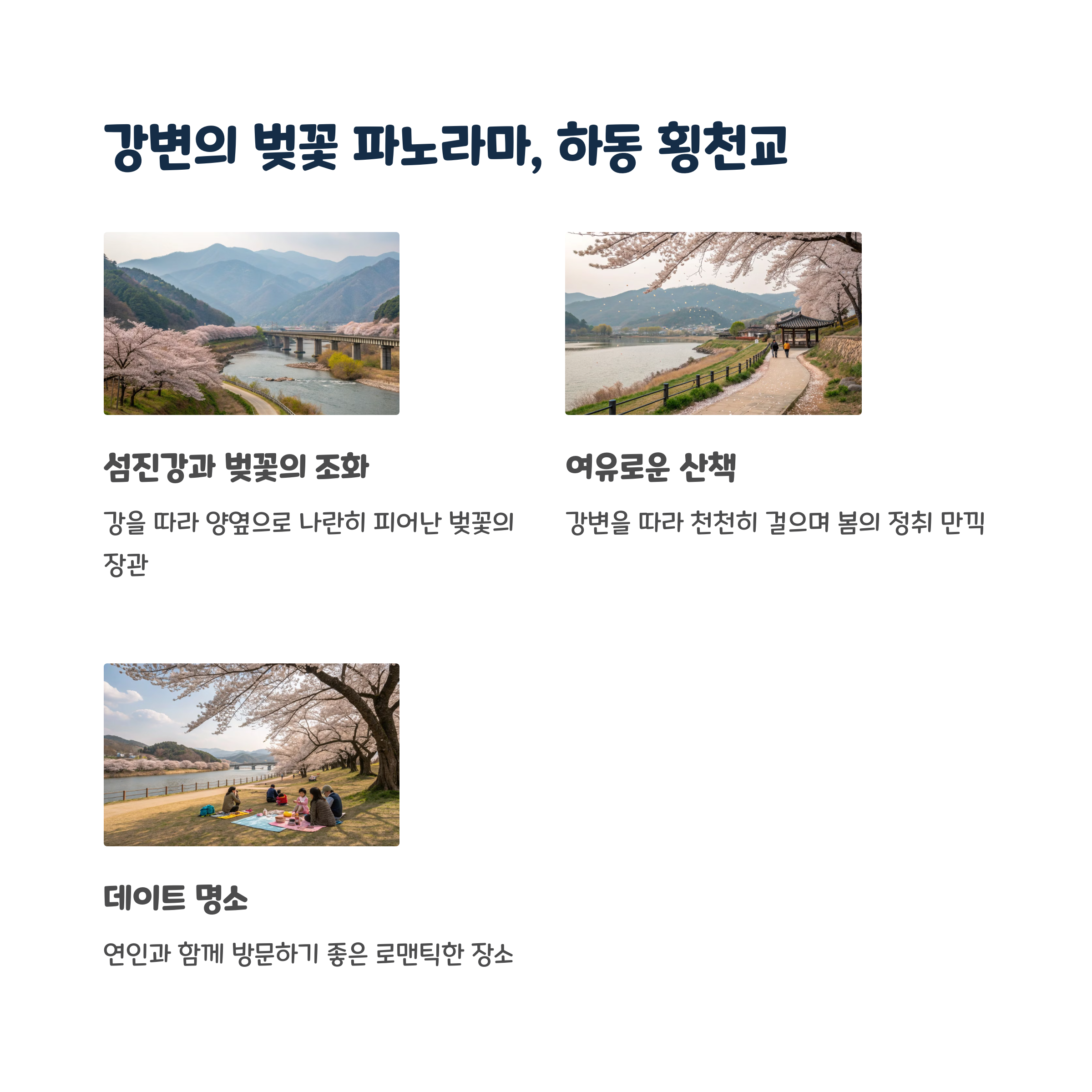 | 하동 횡천교 | 강변을 따라 펼쳐진 벚꽃길을 여유롭게 거닐 수 있는 곳 |