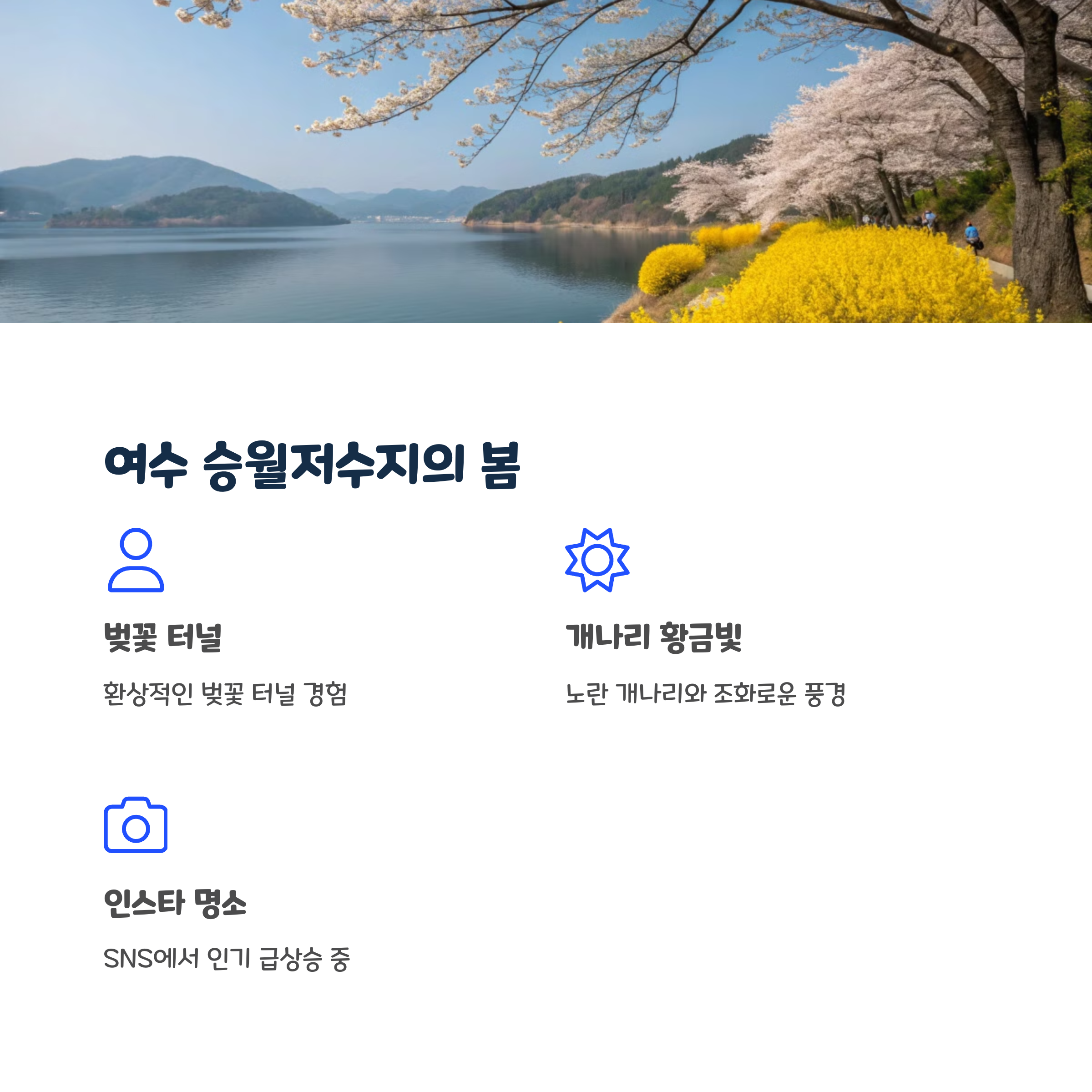 여수에서 가장 유명한 벚꽃 명소 중 하나인 승월저수지는 벚꽃 터널과 개나리가 함께 어우러진 아름다운 풍경을 제공합니다. 저수지를 따라 걸으며 벚꽃이 흩날리는 장관을 감상할 수 있으며, 최근 SNS에서도 많은 여행객들에게 인기를 얻고 있는 곳입니다. 또한 근처에 다양한 카페와 포토 스팟이 마련되어 있어, 인생 사진을 남기기에도 좋은 장소입니다.