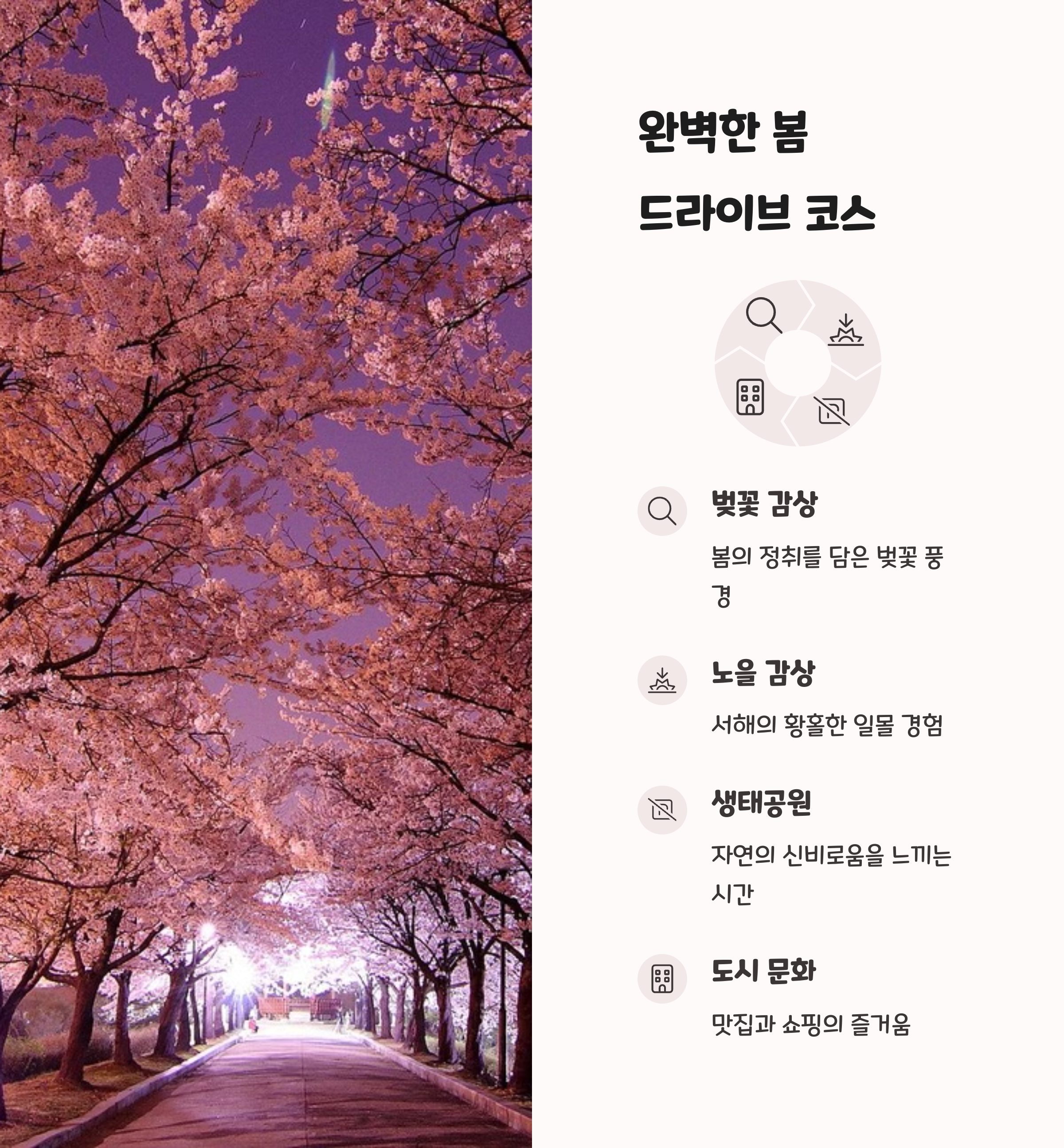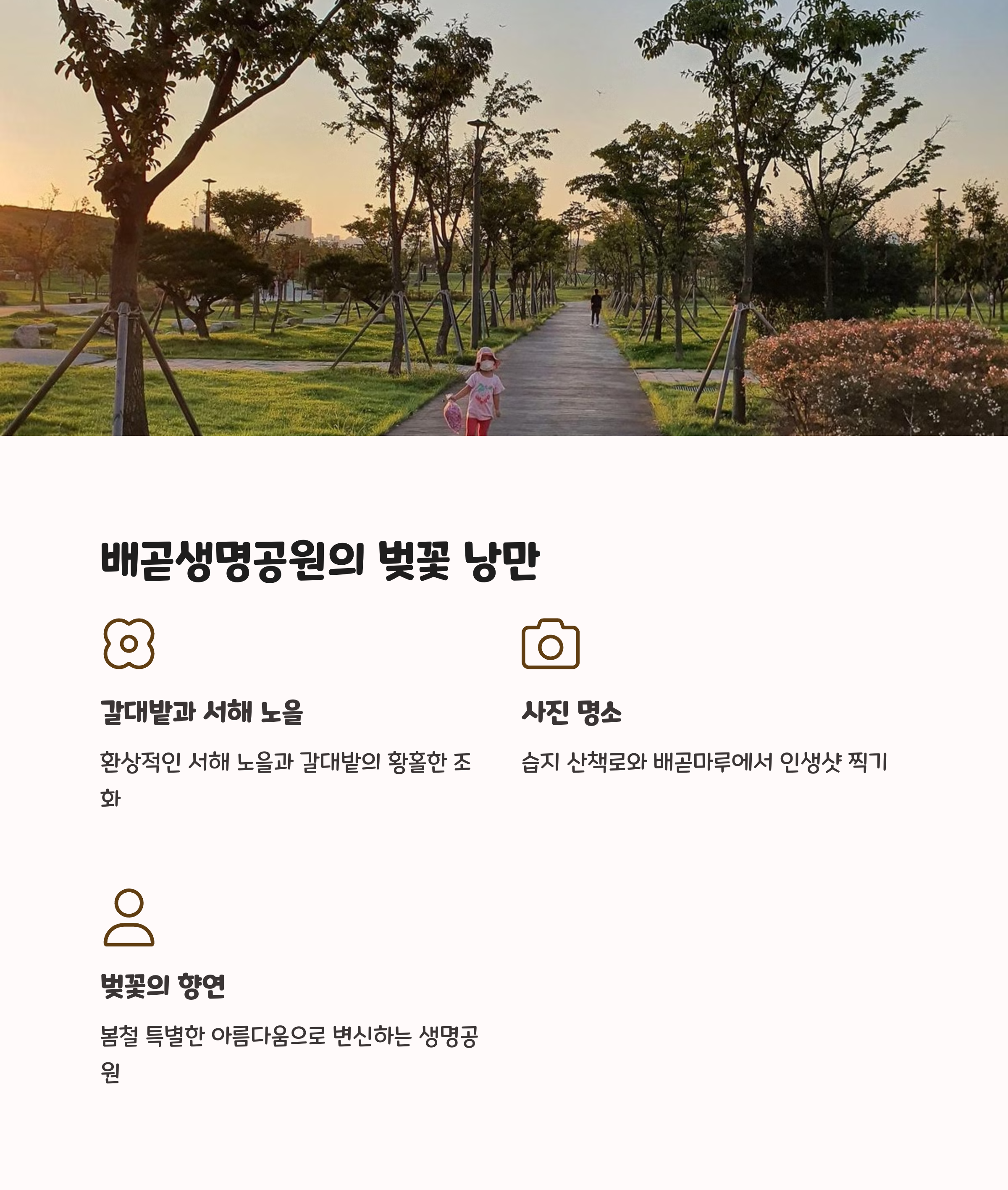 | 갈대와 바다, 벚꽃 조화의 산책 명소 | 벚꽃터널과 체험학습 코스로 인기 | 일몰과 쇼핑을 함께 즐기는 핫플레이스 |