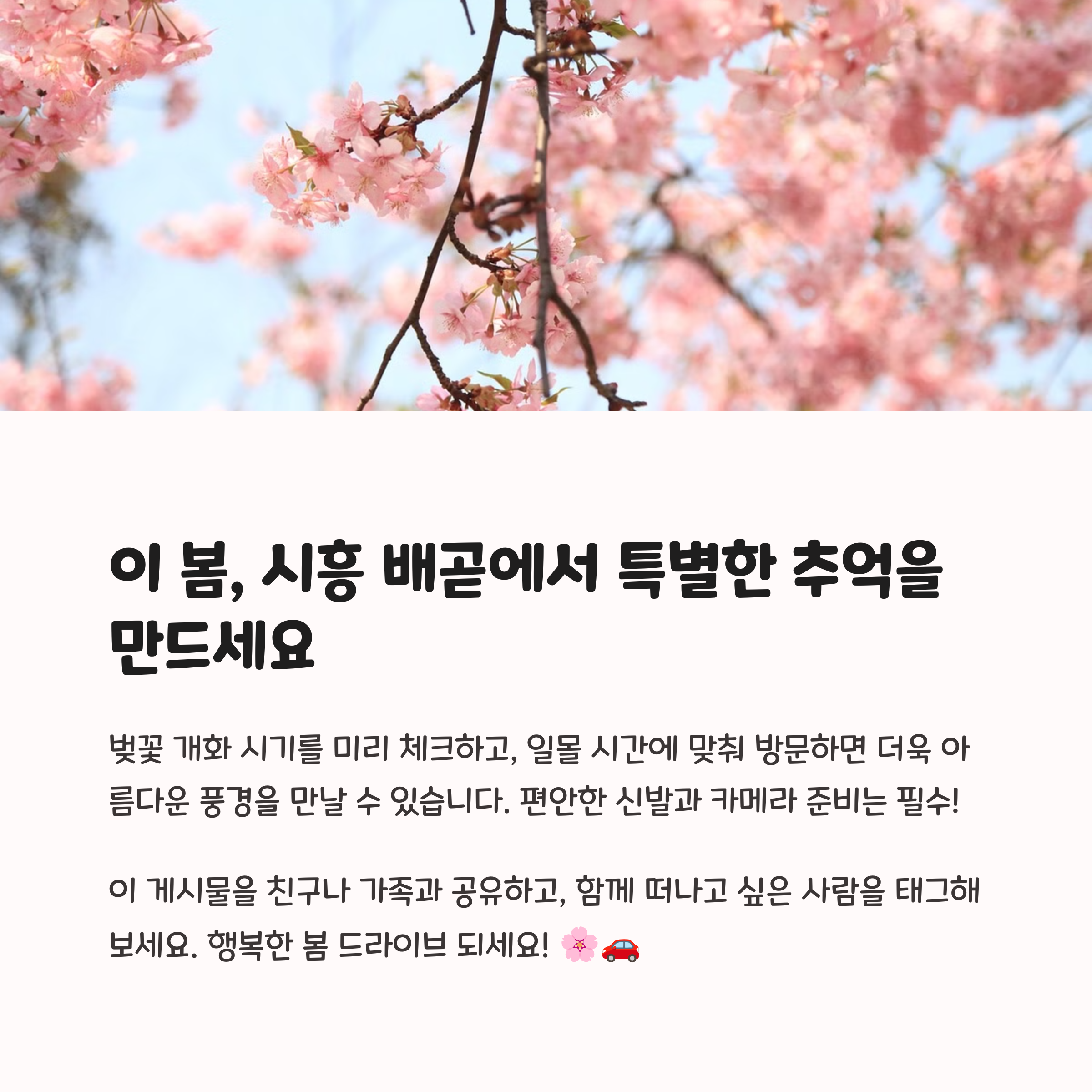 배곧 드라이브 코스에 대한 여러분의 경험이나 숨겨진 벚꽃 명소가 있다면 댓글로 공유해주세요. 다양한 이야기가 이 글을 읽는 많은 분들에게 큰 도움이 될 거예요.