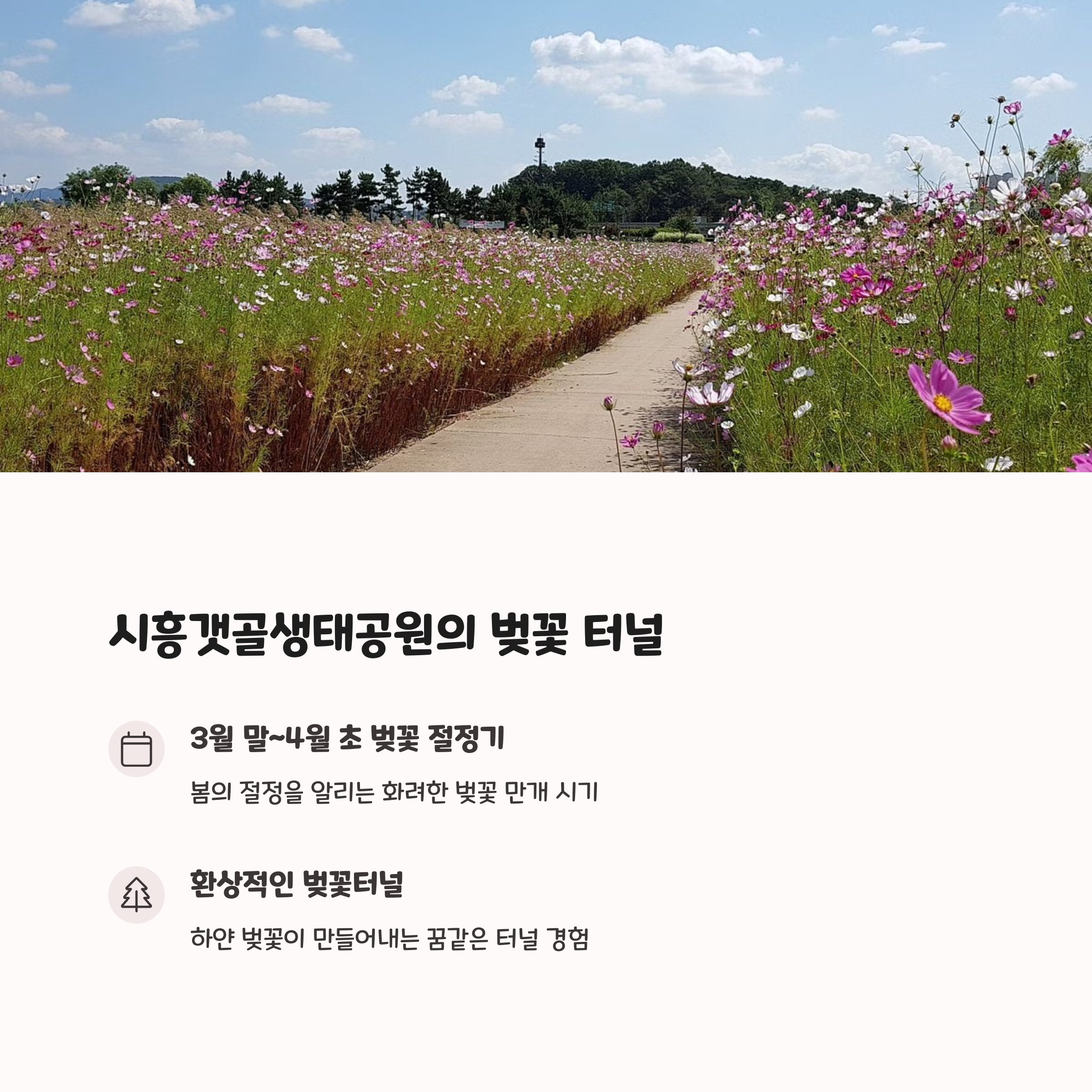| 벚꽃 개화 시기 | 3월 말부터 4월 초, 배곧 전역에서 개화 |