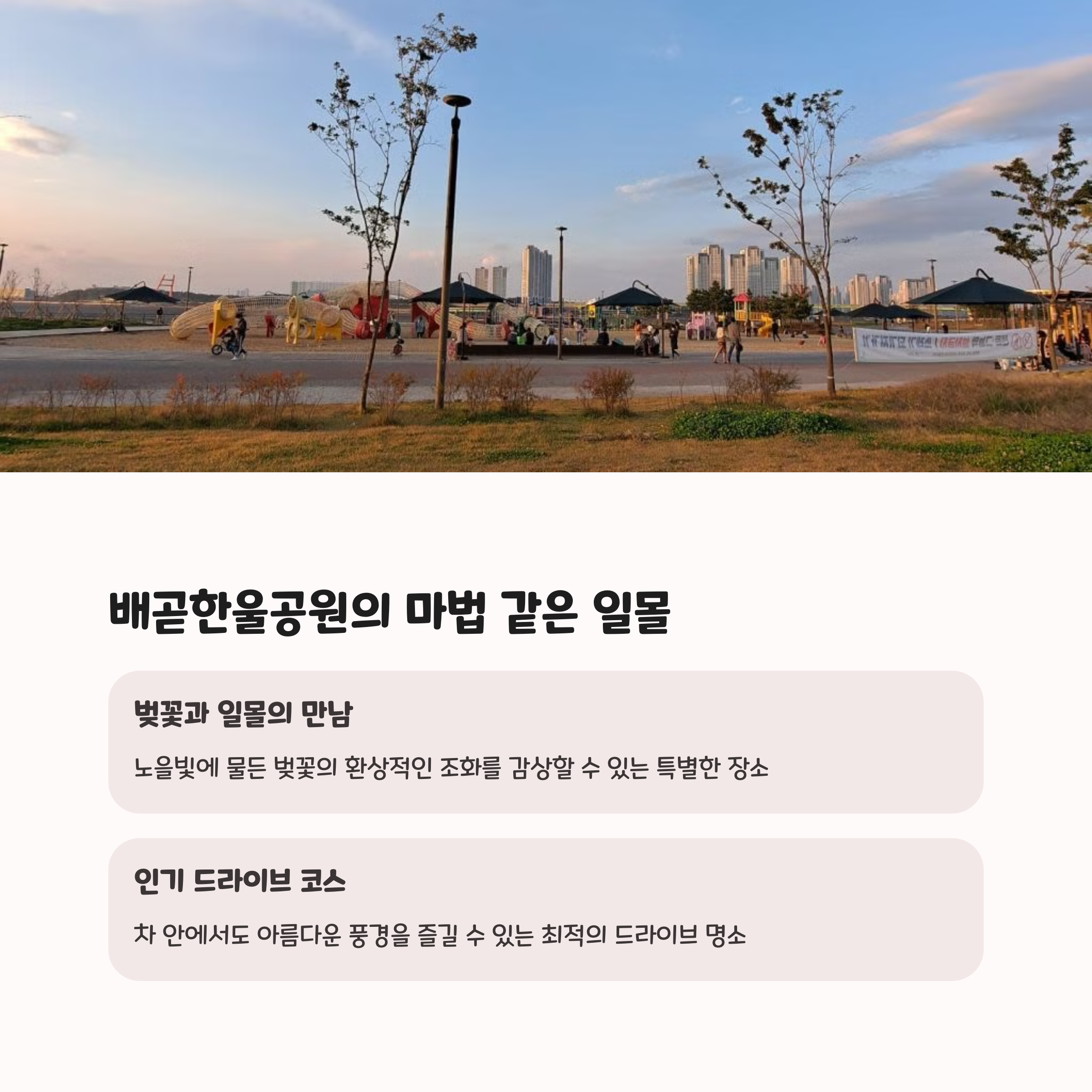 드라이브의 마지막 코스로 추천하는 배곧한울공원은 일몰과 벚꽃이 어우러지는 풍경으로 유명합니다. 해 질 무렵 이곳을 지나면 황금빛 햇살 사이로 벚꽃이 흩날리며 감성 가득한 장면을 연출해 줍니다. 근처에는 시흥 프리미엄 아울렛과 다양한 맛집이 있어 쇼핑과 식사까지 한 번에 해결할 수 있는 장점이 있습니다. 자연과 도시가 어우러진 드라이브의 마무리 코스로 안성맞춤입니다.