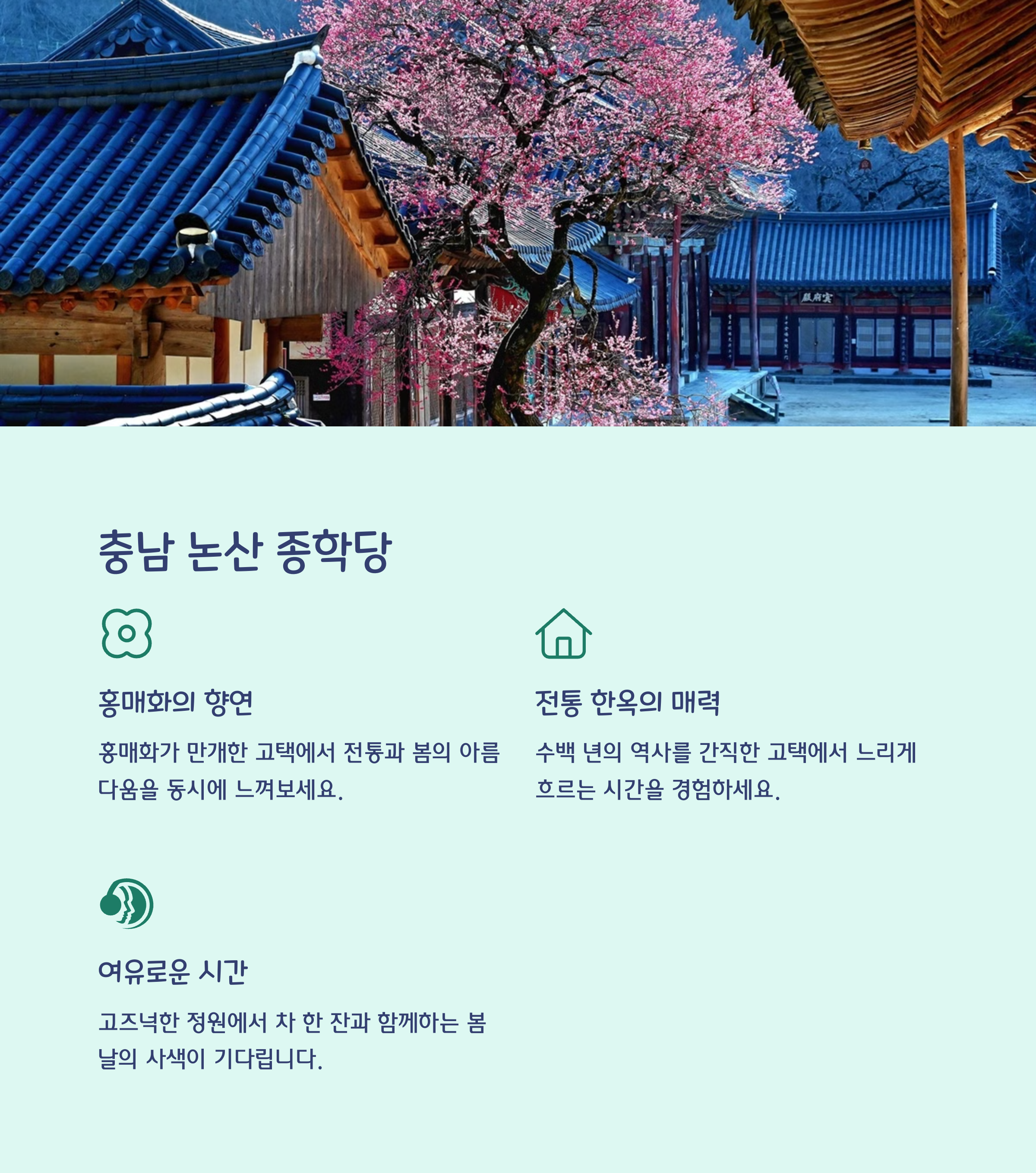 하동 쌍계사는 지리산 자락에 위치해 고요하고 평화로운 분위기를 자랑합니다. 사찰 특유의 차분한 분위기와 봄의 생동감이 조화를 이루며 산책길, 계곡 소리까지 어우러져 힐링 그 자체를 경험할 수 있습니다. 충남 논산 종학당은 한옥 고택에서 홍매화가 흐드러지는 풍경을 감상할 수 있어 인생사진을 남기기에도 좋은 봄 명소입니다.