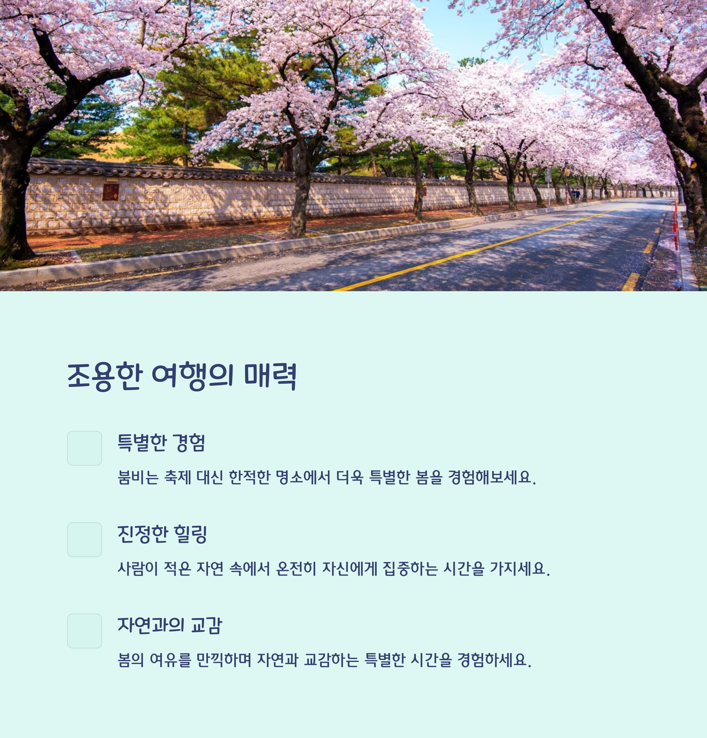 벚꽃 명소 대신 다녀온 조용한 봄 여행지가 있다면 댓글로 공유해주세요. 여러분의 추천이 또 다른 누군가에게 소중한 봄을 선물할 수 있습니다.