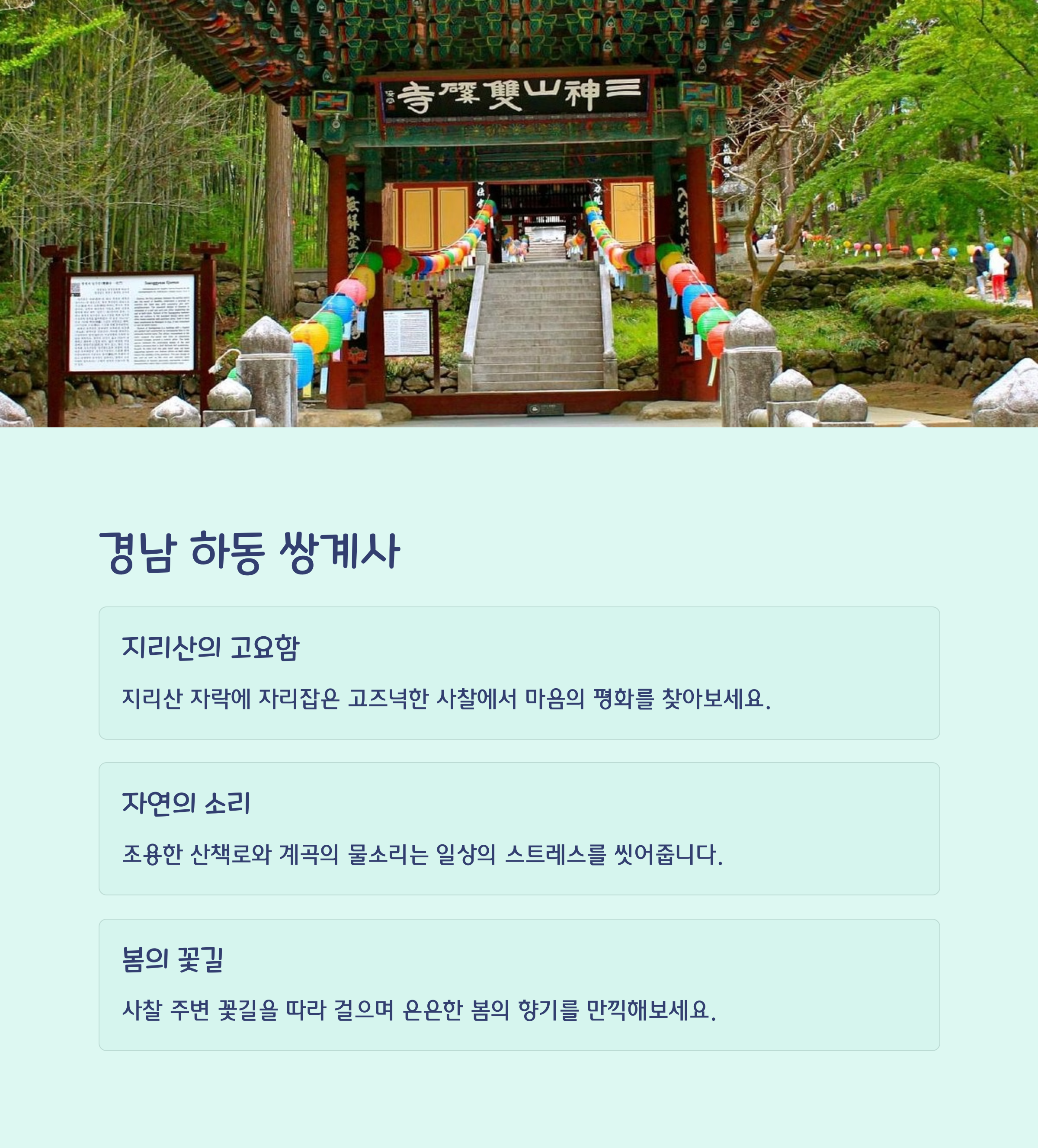 | 봄철 사찰 여행지 | 하동 쌍계사, 조용한 산길과 계곡 산책로 조성 |