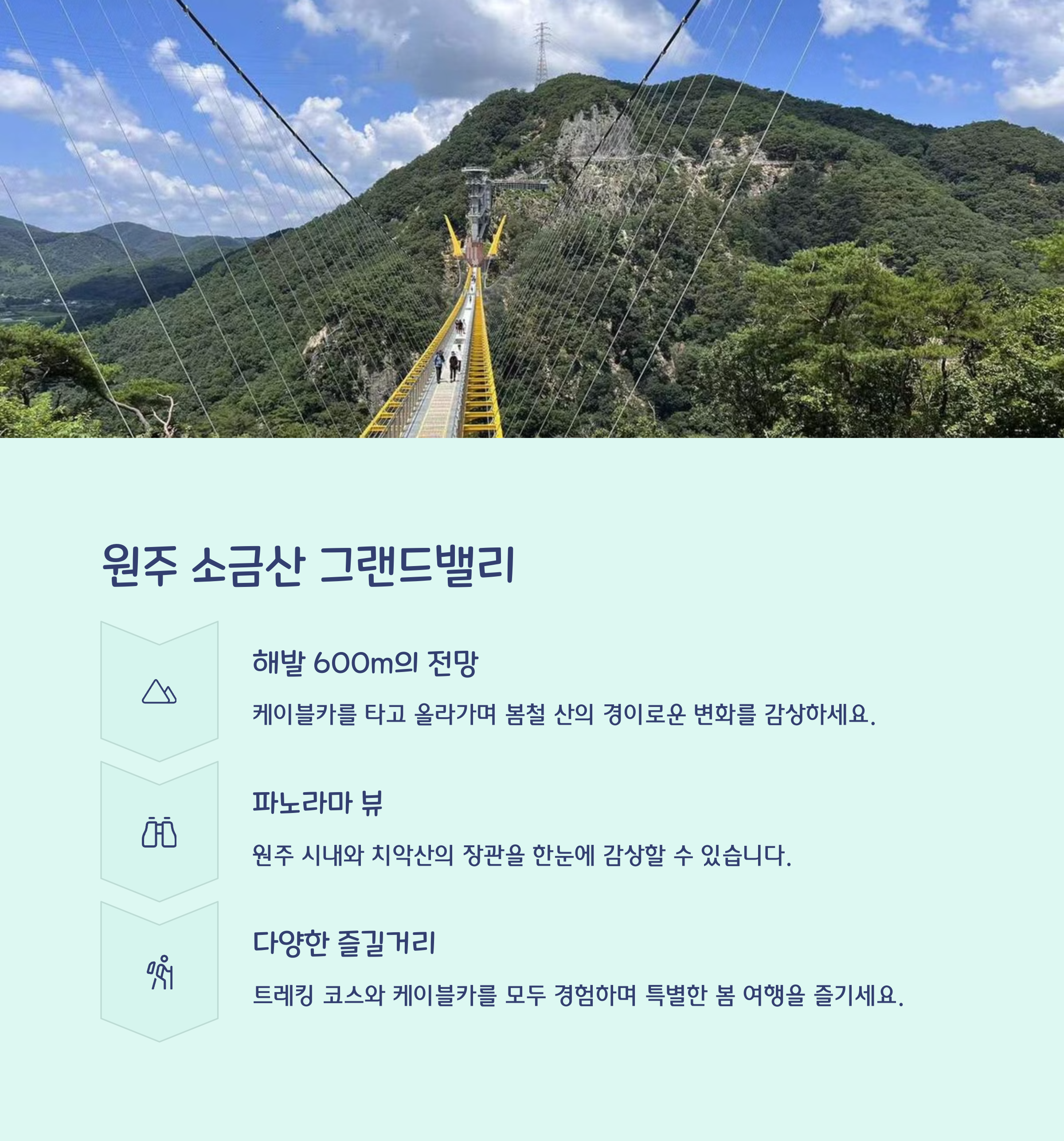 원주 소금산 그랜드밸리는 케이블카를 타고 절경을 감상할 수 있는 힐링 여행지입니다. 다리가 후들거릴 정도로 스릴 있는 소금산 출렁다리와 전망 좋은 스카이워크는 봄바람을 느끼기에 딱 좋은 장소입니다. 비교적 넓은 공간에 자연 그대로가 살아 있어, 가족 여행자들에게도 부담 없이 추천할 수 있습니다.