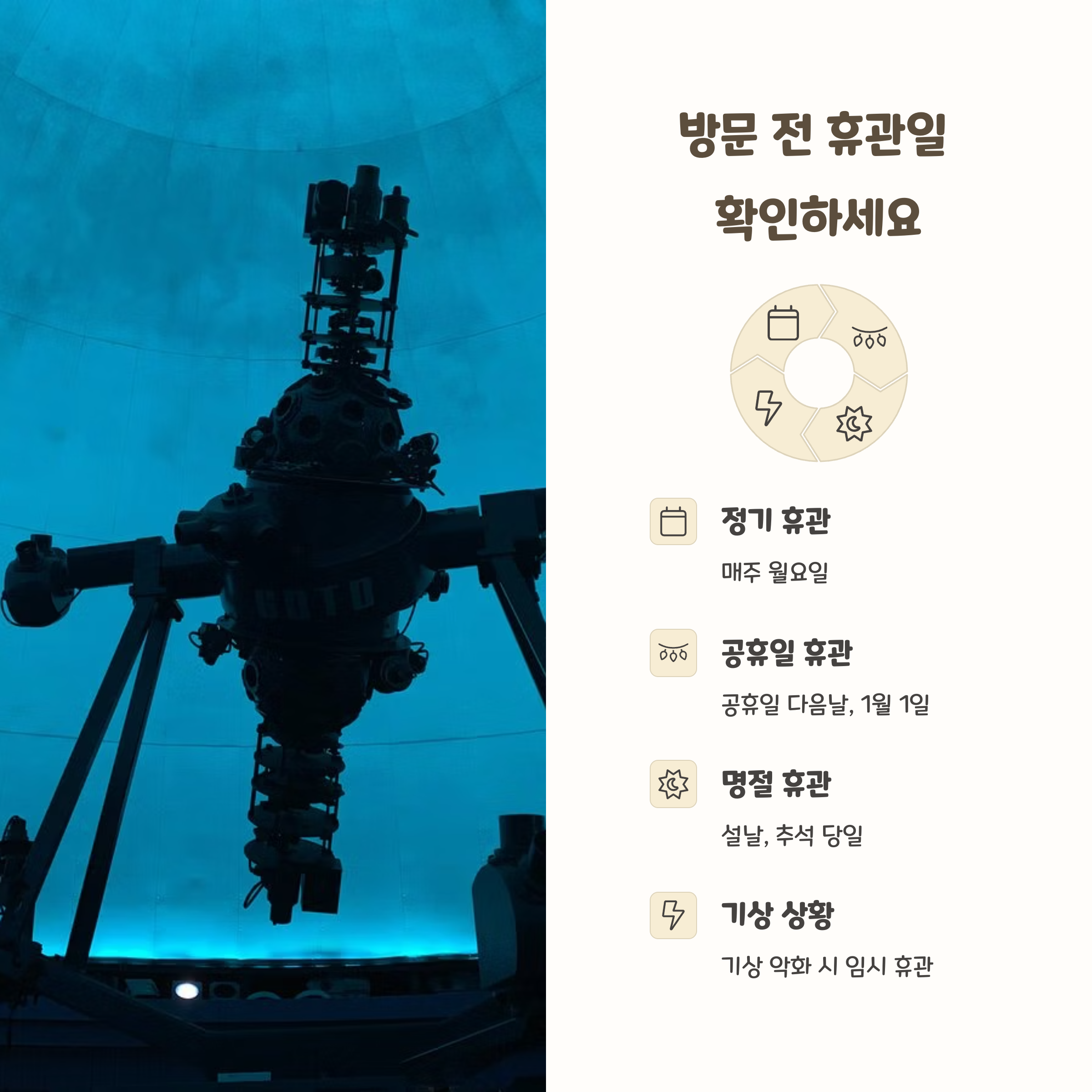 월요일, 공휴일 다음날, 1월 1일, 설·추석 당일은 휴관이며, 셔틀버스를 이용해야만 진입할 수 있으므로 차량은 천문대 입구 주차장에 두고 탑승해야 합니다. 밤하늘을 감상하는 별 관측 외에도 야경 사진 명소, 계절별 별자리 체험, 전문 해설사의 천문 강의 등이 함께 진행됩니다. 청명한 날씨만 맞으면 별빛과 함께하는 밤하늘 여행을 누구나 쉽게 경험할 수 있는 곳입니다.