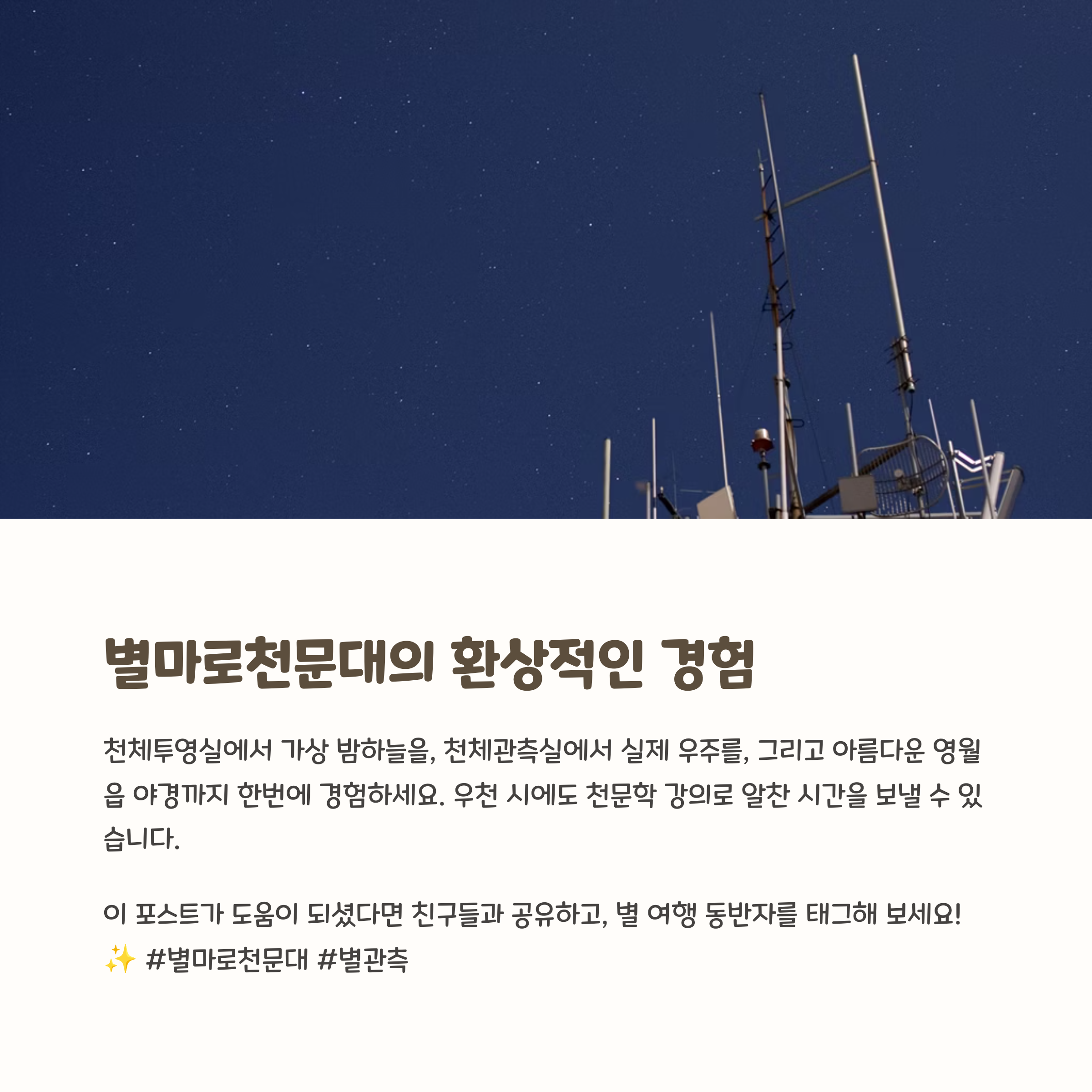 | 맑은 날씨, 기상 확인 필수 | 홈페이지 사전 예약 필수, 인원 제한 있음 | 천체투영관, 야경 감상, 천문 해설까지 포함 |