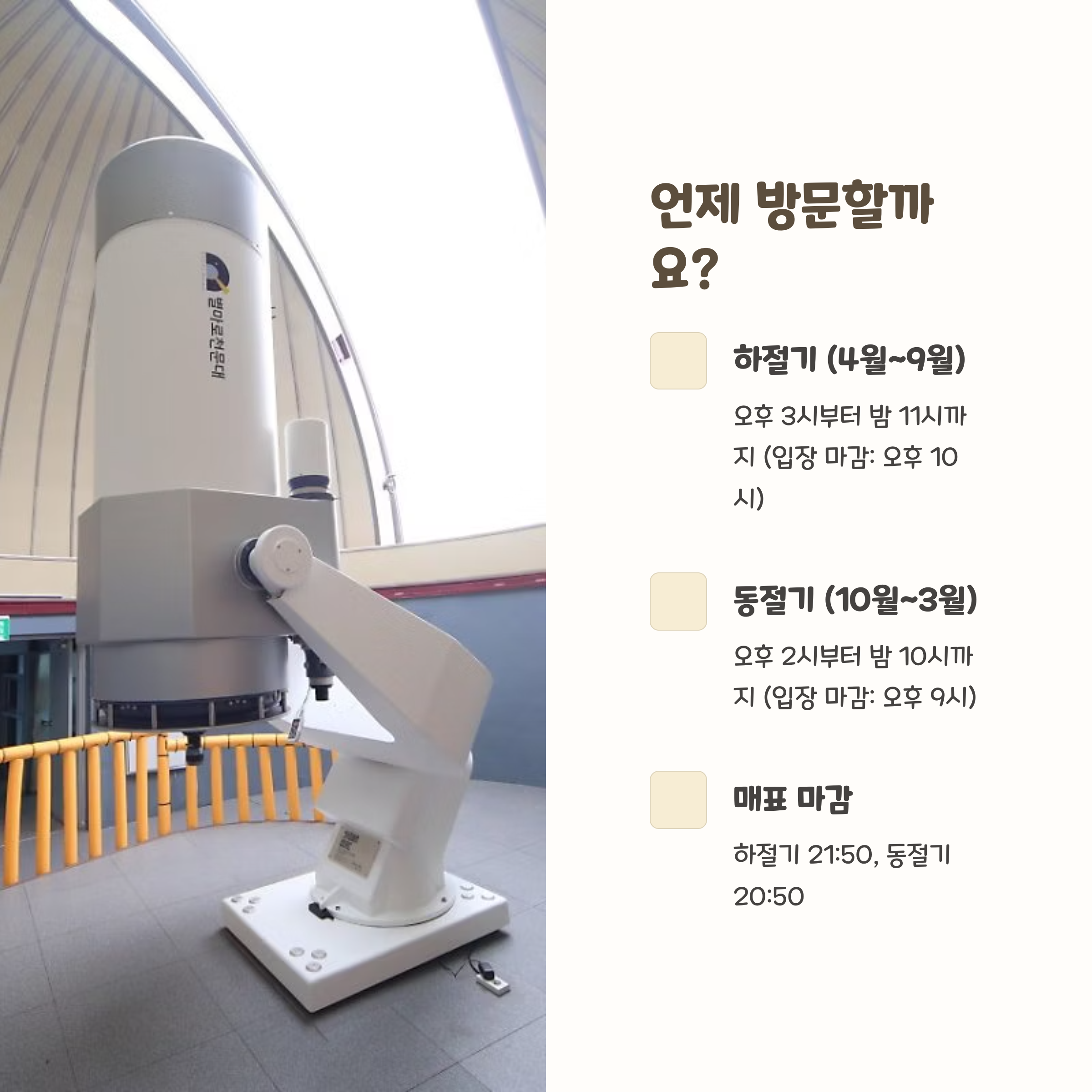 | 일몰 후 1시간부터 폐장 전까지 관측 적기 | 달빛이 없어 별이 더욱 선명하게 보이는 시기 | 개인 차량 진입 제한, 입구 주차 후 셔틀 운행 |