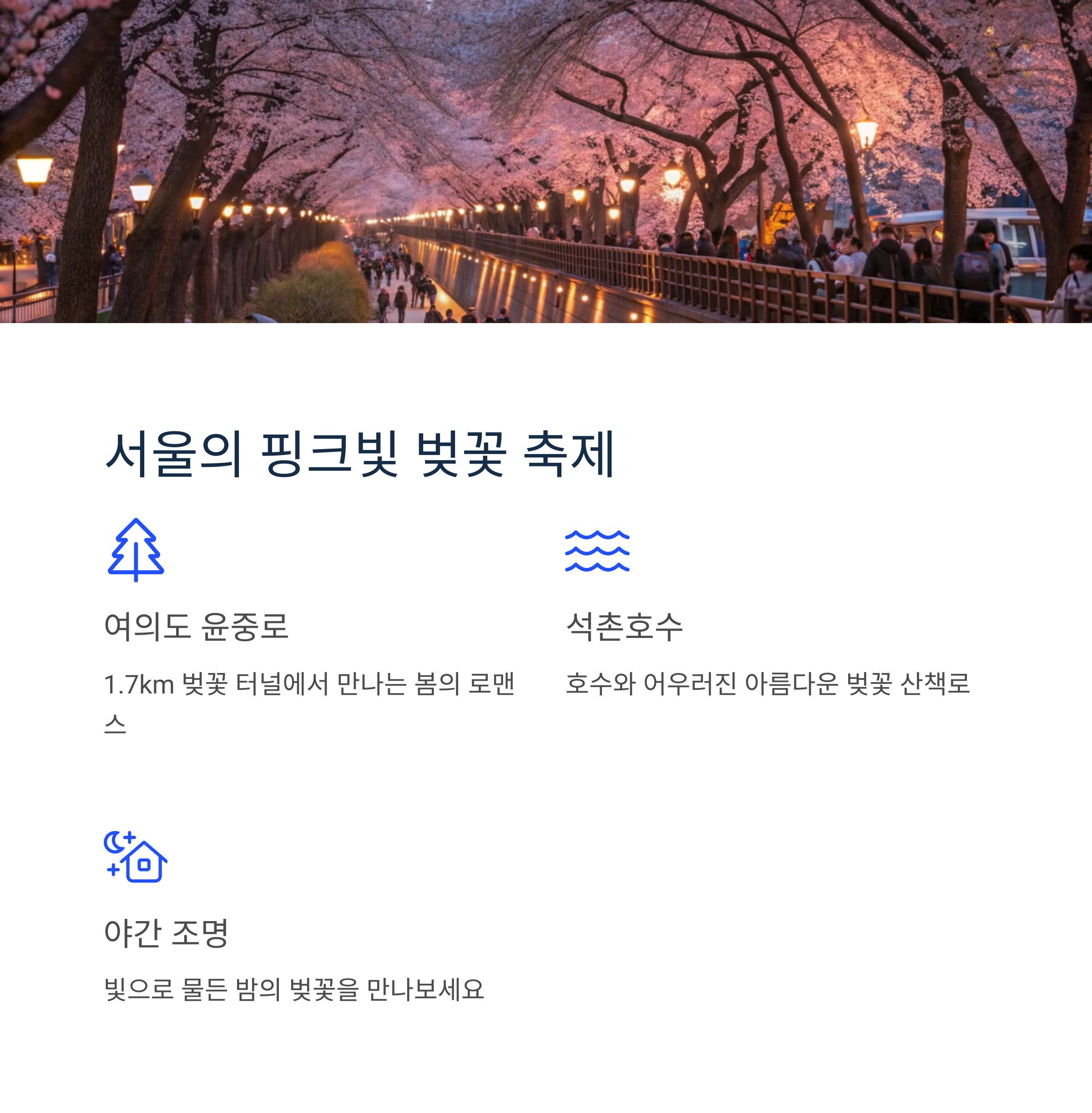 | 서울 추천 명소 | 여의도 윤중로, 석촌호수 벚꽃축제 |