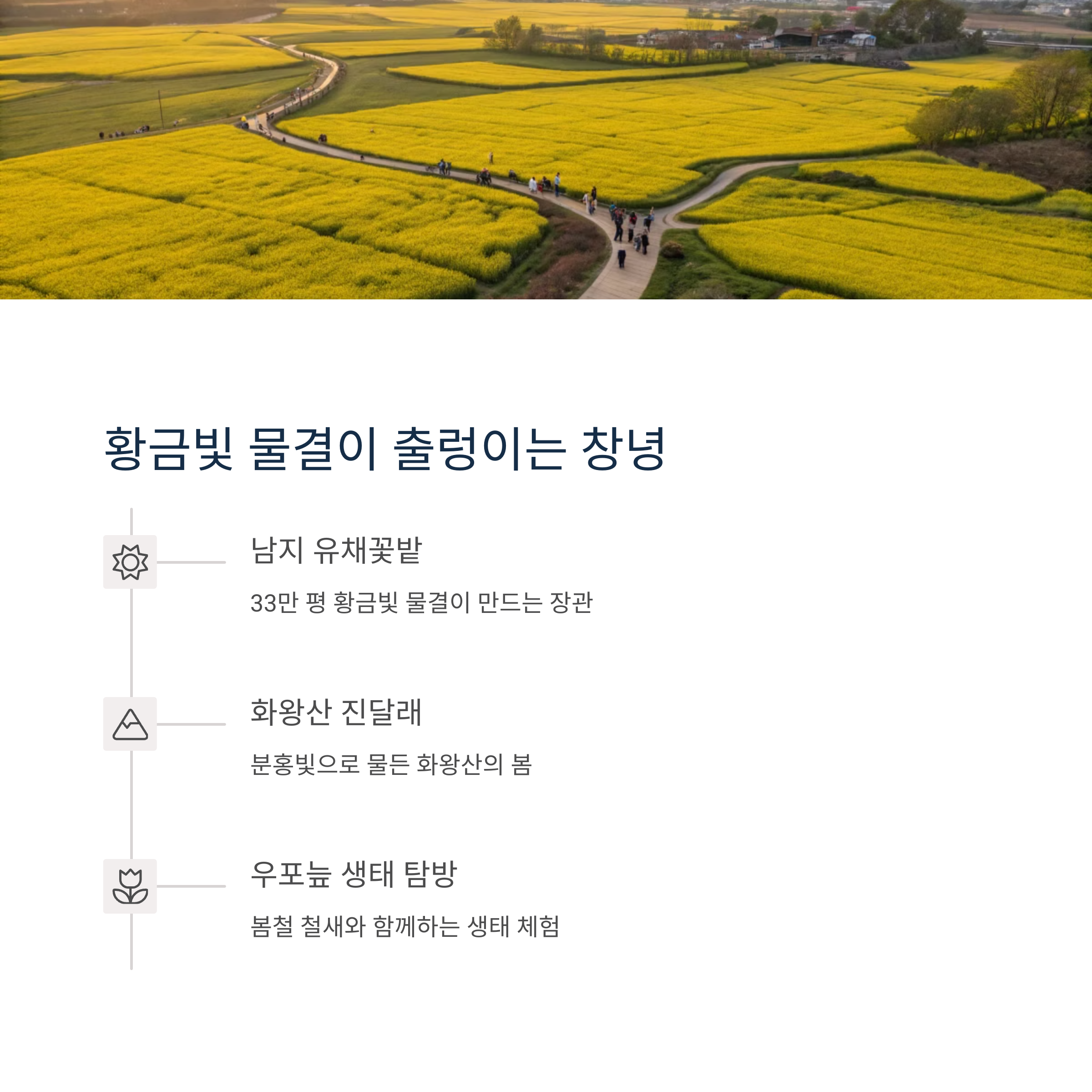 제주도에서는 유채꽃이 절정을 이루는데, 송악산 유채꽃길을 따라 걷다 보면 바다와 함께 어우러진 아름다운 풍경을 만날 수 있습니다. 창녕 남지 유채꽃밭도 유채꽃의 향연을 즐기기에 좋습니다.
