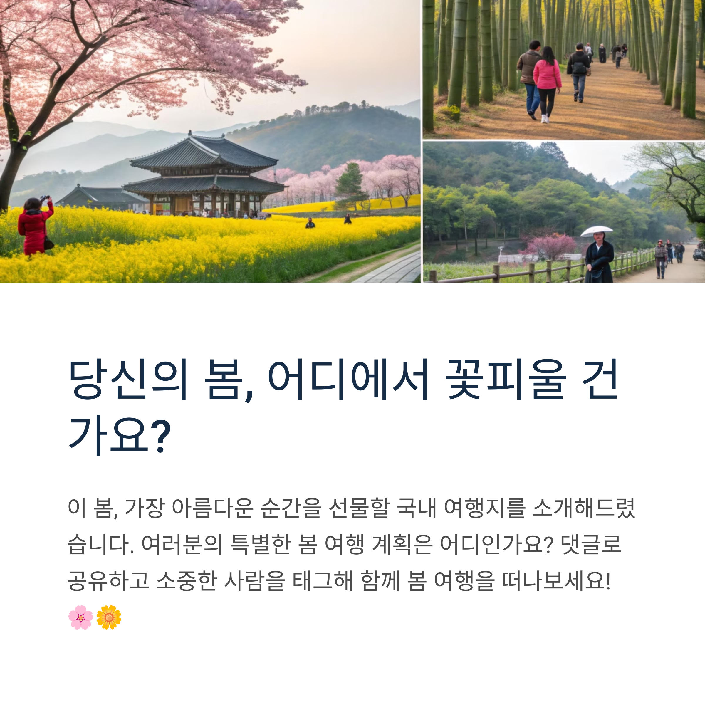 여러분은 이번 봄, 어디로 떠나고 싶으신가요? 추천 여행지나 다녀온 경험을 댓글로 공유해 주세요!