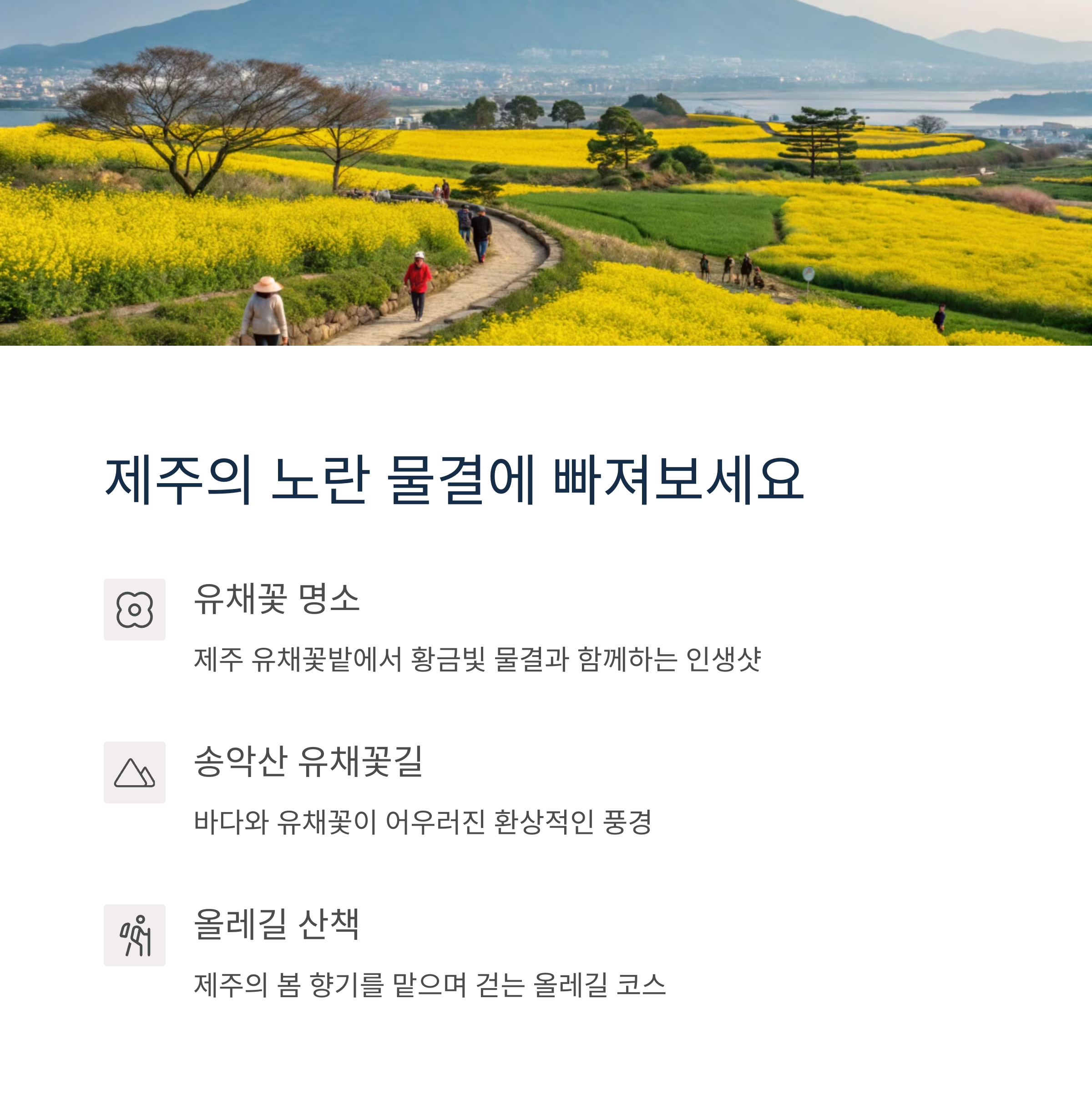 | 제주도 추천 명소 | 유채꽃밭, 송악산 유채꽃길 |