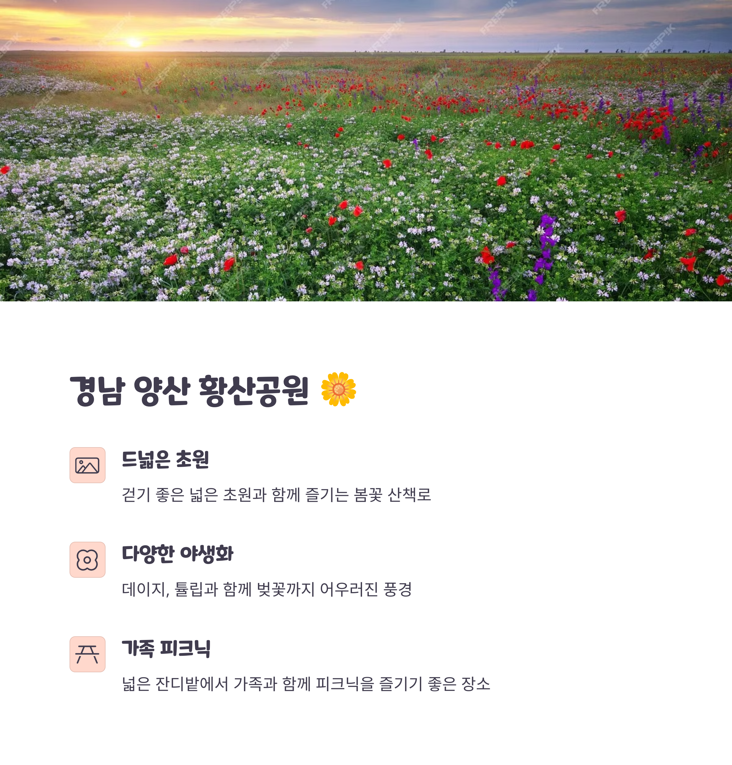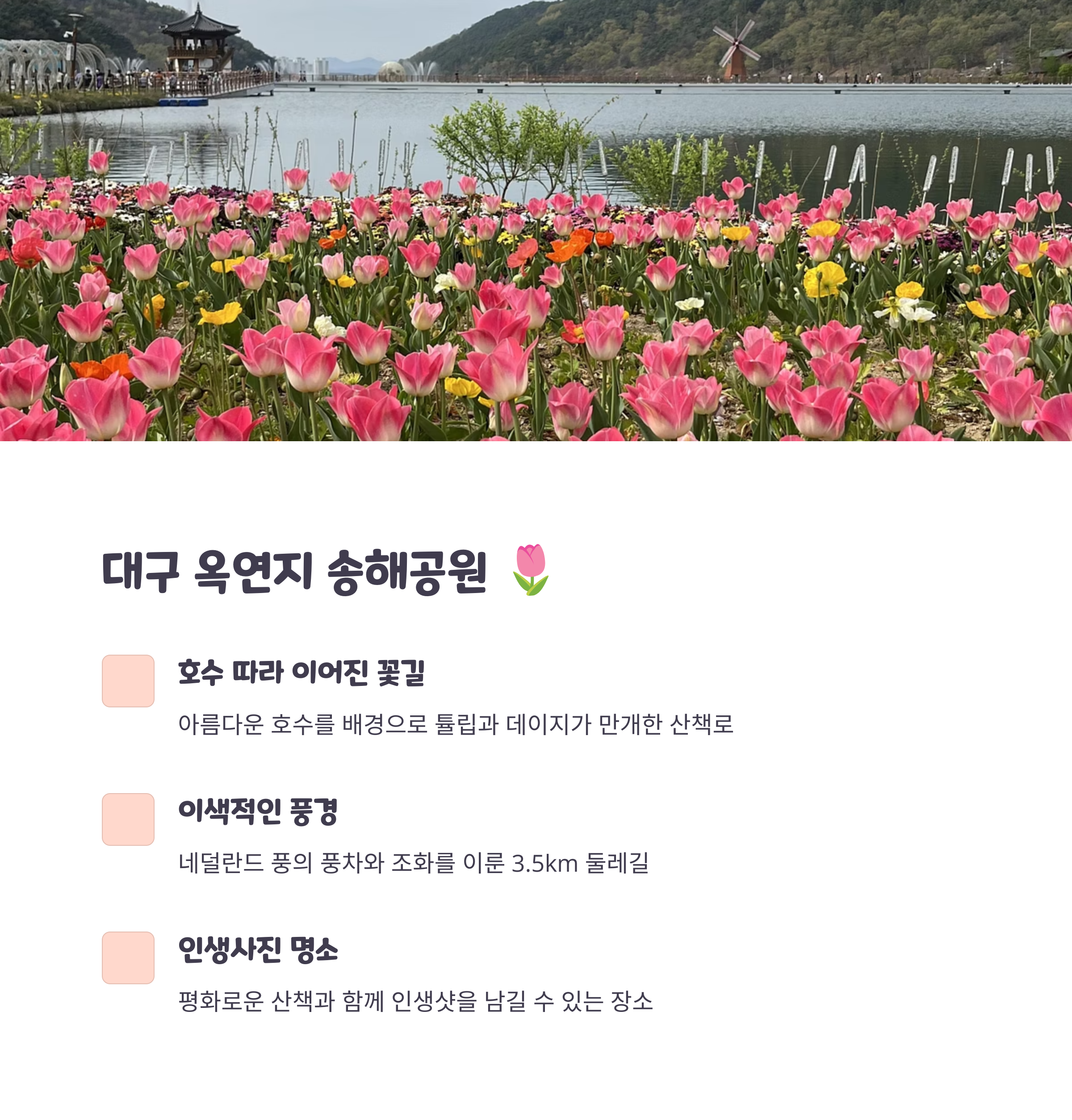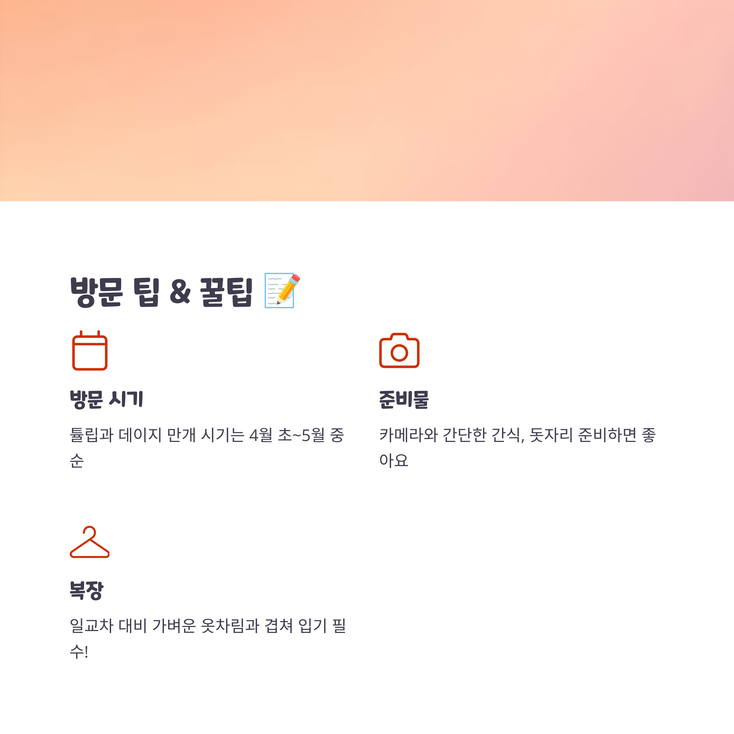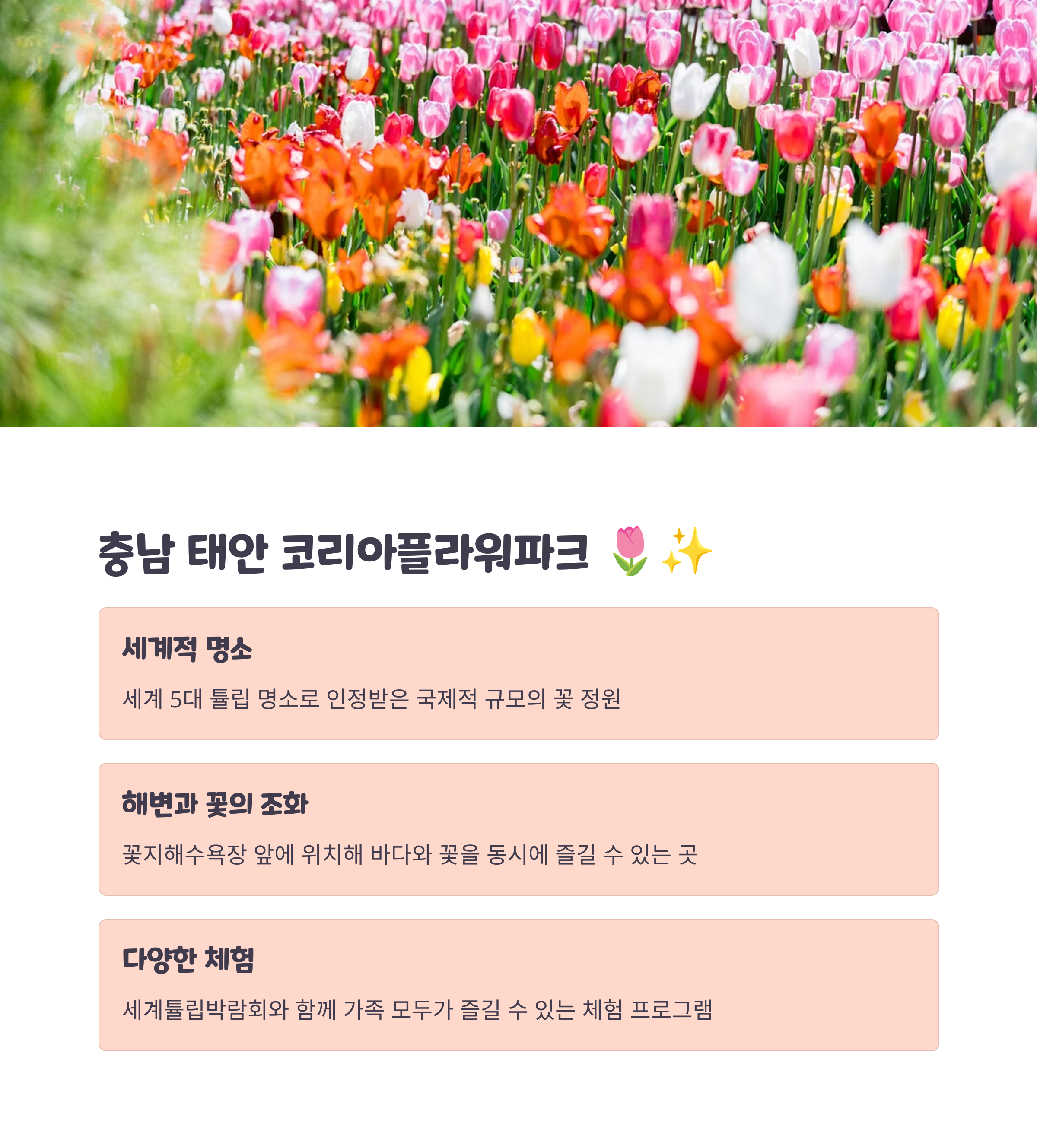 | 전국 튤립 명소 | 평택 바람새마을, 태안 플라워파크 등 다양한 드라이브 코스로 추천됩니다. |