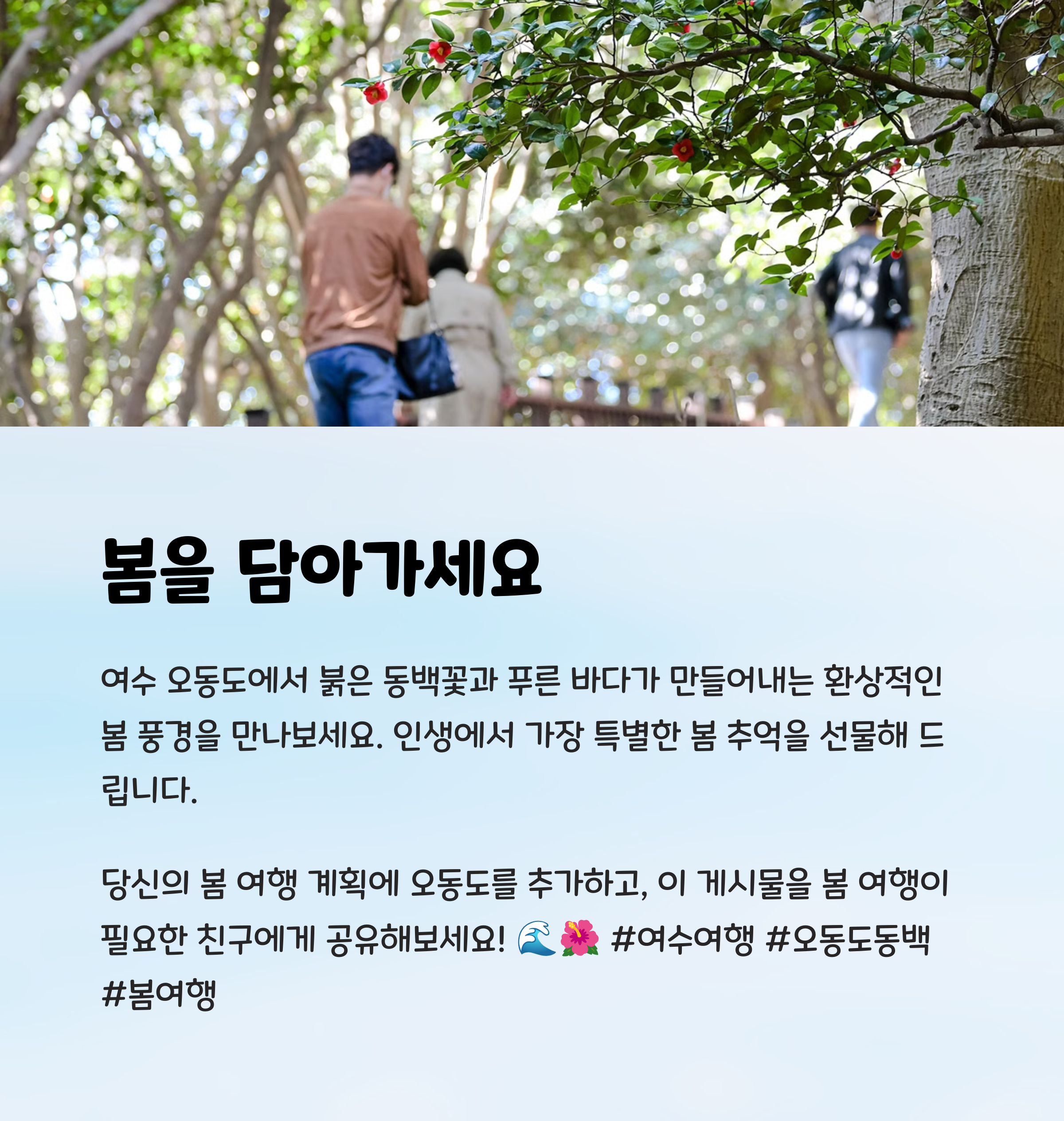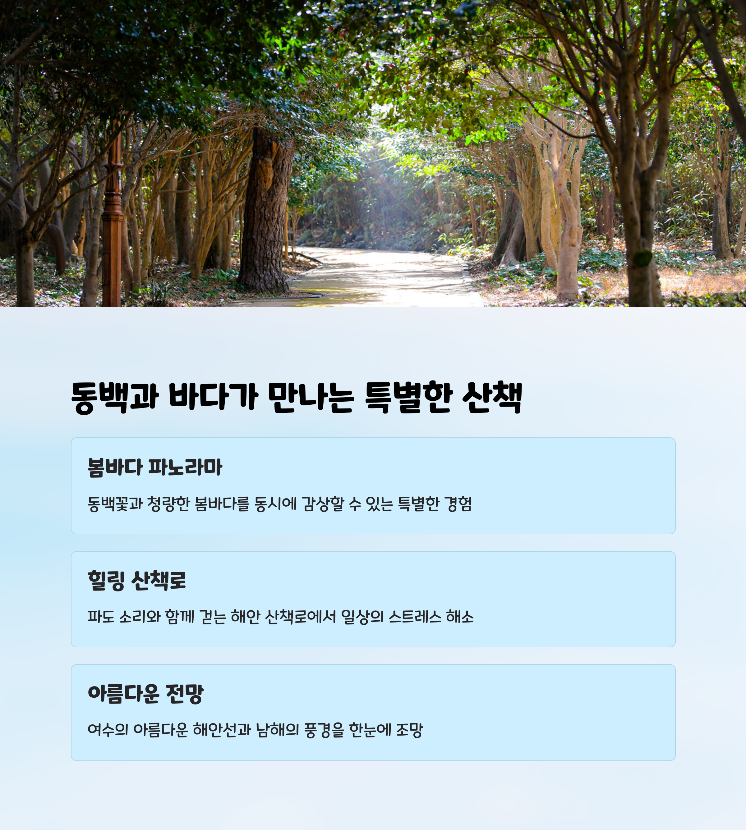 오동도는 입장료가 무료인 점도 매력적이며, 근처에는 여수 해양공원, 돌산대교, 여수 밤바다 등 다양한 여행 포인트와 연계해 당일치기 또는 1박 2일 여행지로 적합합니다. 붉은 동백, 푸른 바다, 맑은 하늘, 이 세 가지가 모두 어우러지는 오동도에서 3월~4월 사이의 봄을 온전히 누려보세요.