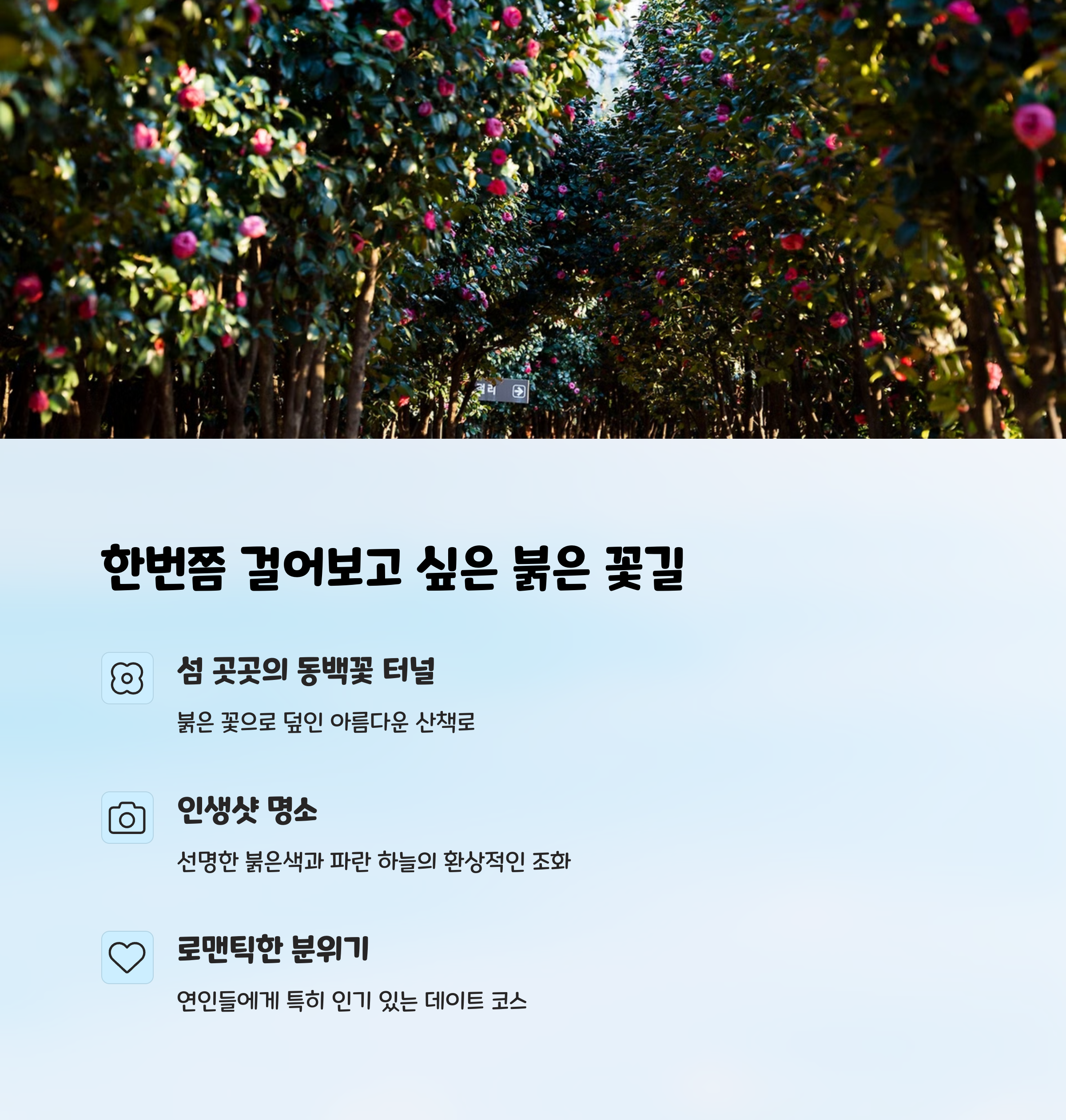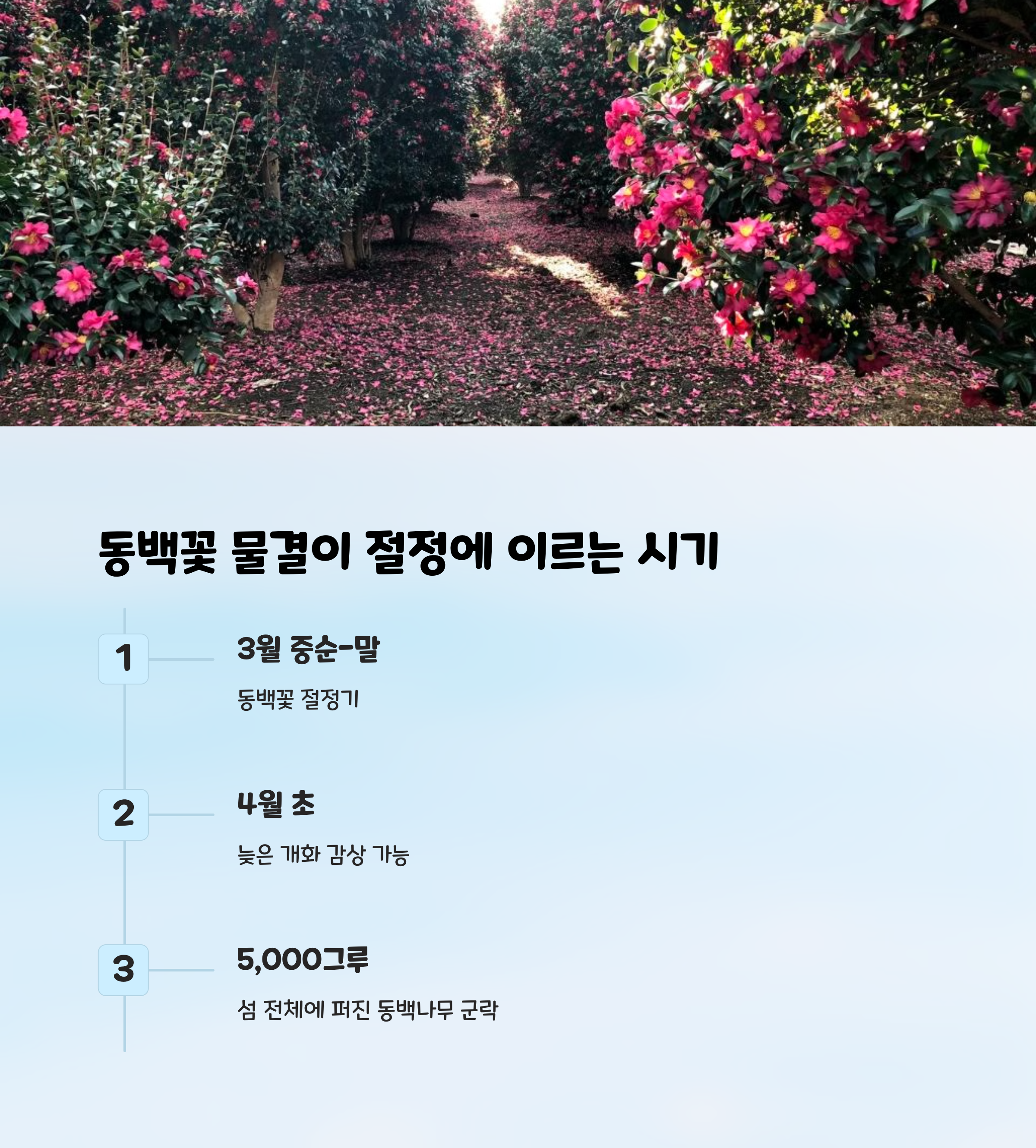 | 약 5,000그루 동백 군락 | 3월 중순~말 절정 | 동백열차로 편리한 이동 |