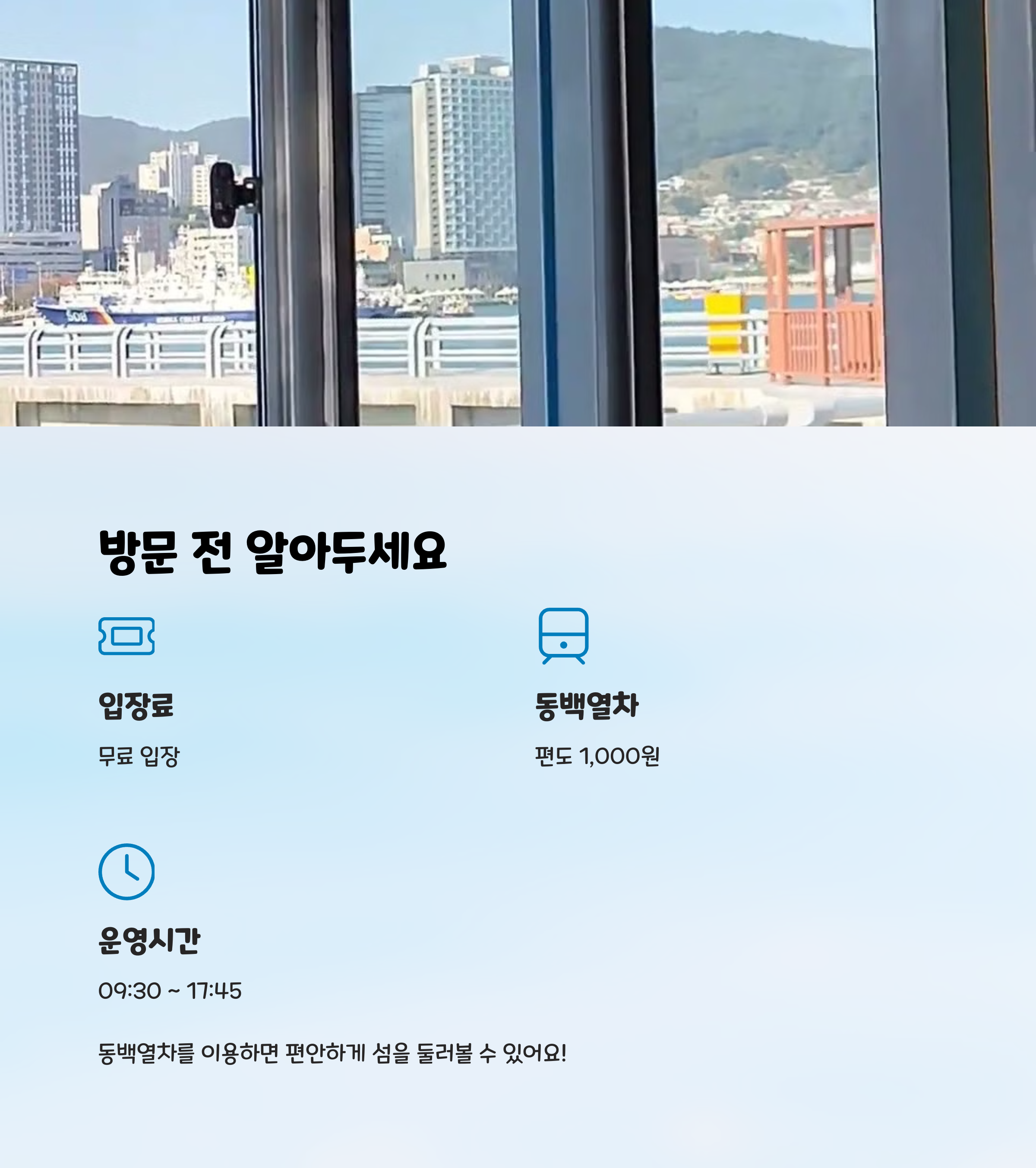| 관람 정보 | 입장 무료 / 동백열차 이용 가능 (편도 1,000원) |