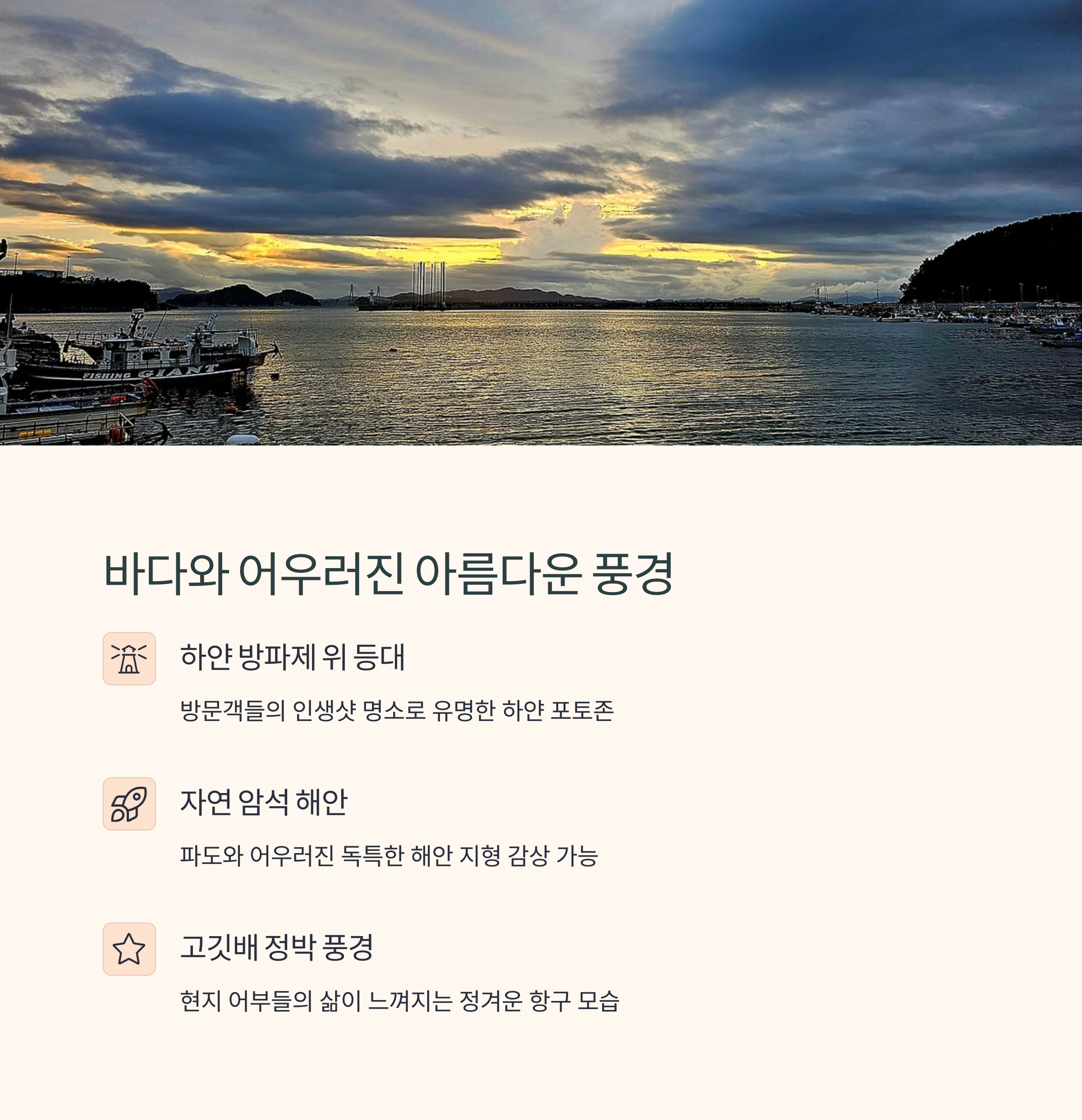 부산 가덕도 새바지항은 군사 유적지와 아름다운 자연이 공존하는 특별한 장소입니다. 바다와 바위, 등대, 동굴이 어우러진 이곳은 소소하지만 감성 가득한 여행을 원하는 분들에게 안성맞춤입니다. 갈맷길 산책로, 항구 풍경, 바다 전망 카페까지 두루 갖춘 덕분에 당일치기 드라이브 코스로도 인기이며, 노을 지는 시간의 장관은 오랫동안 기억에 남을 추억이 되어줍니다. 이번 주말, 도심에서 벗어나 진정한 힐링을 원하신다면 새바지항으로의 여정을 추천드립니다.