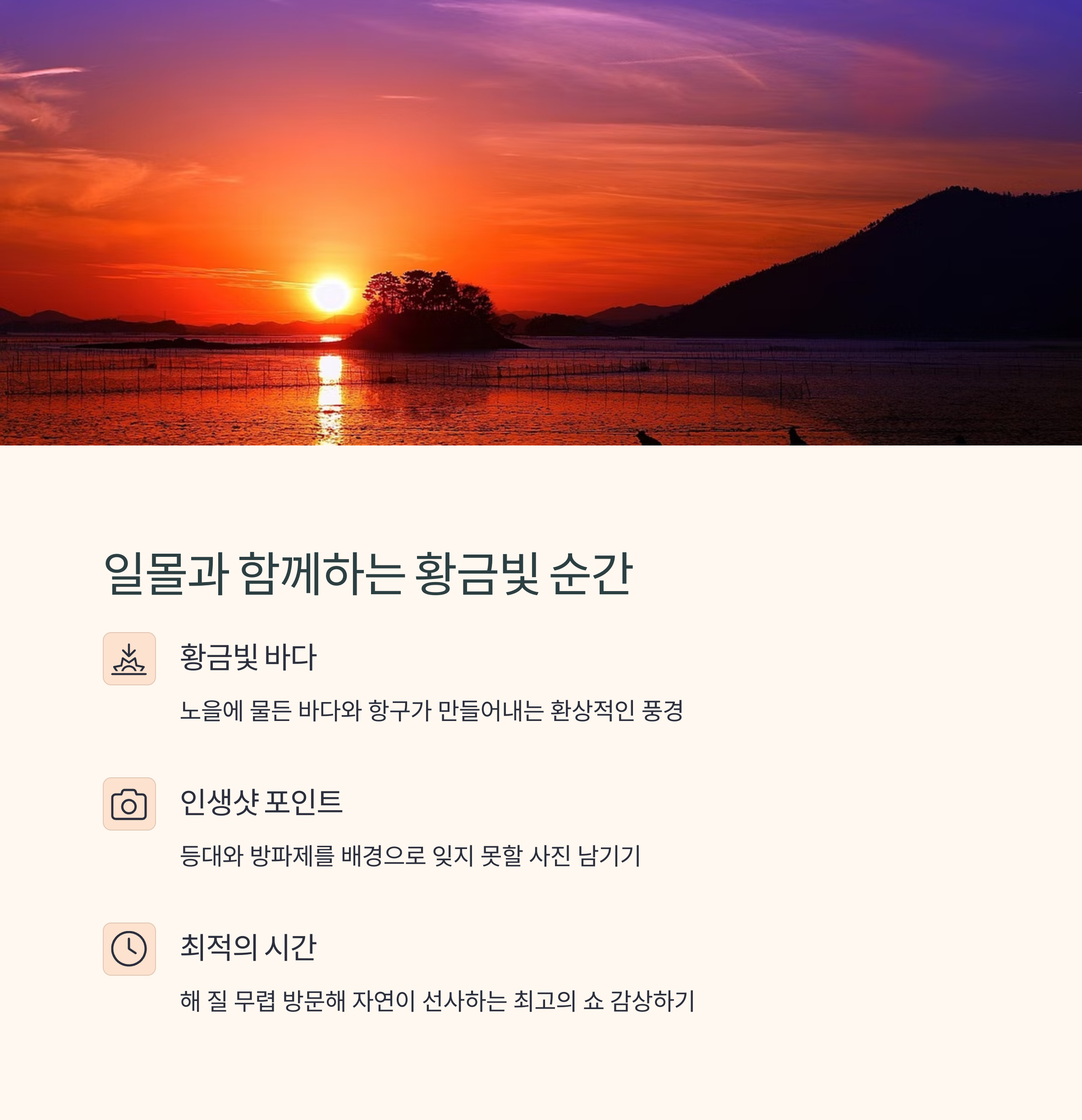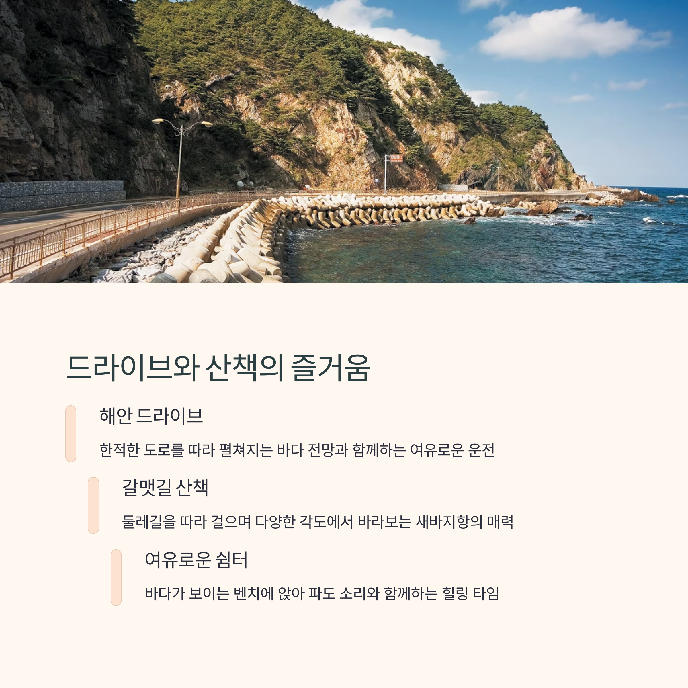 | 드라이브 포인트 | 일몰과 바다 풍경, 전망 좋은 카페와 산책길 |