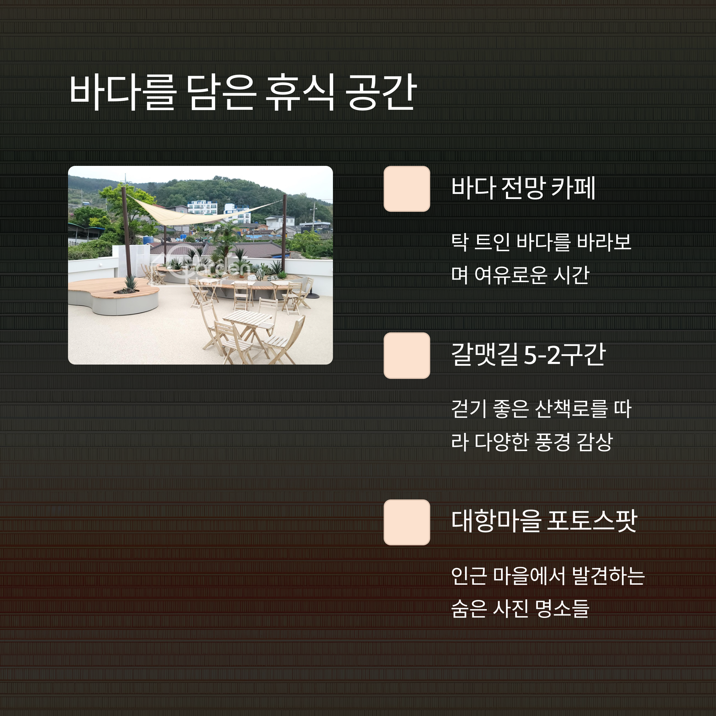 | 드라이브 포인트 | 일몰과 바다 풍경, 전망 좋은 카페와 산책길 |
