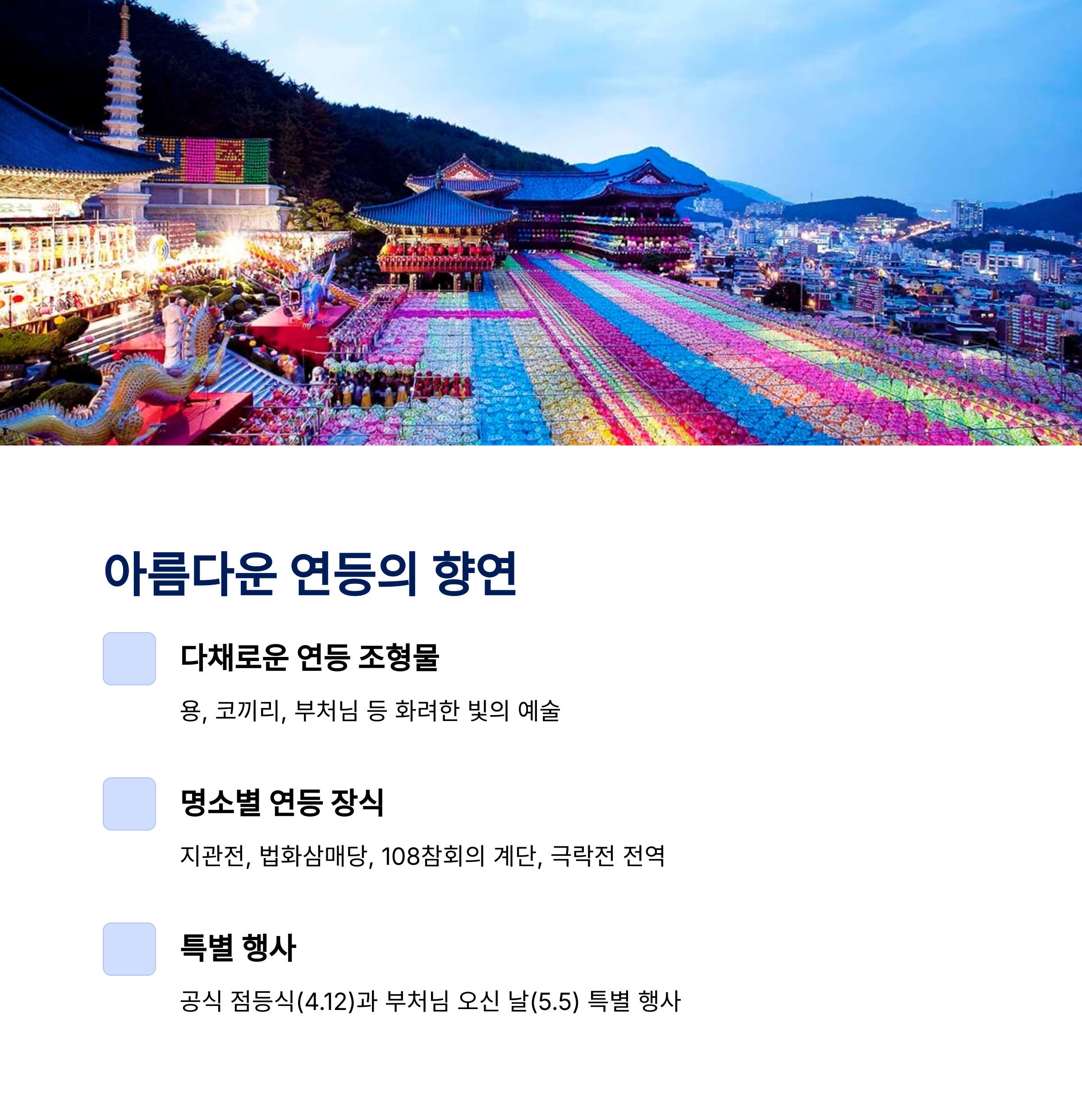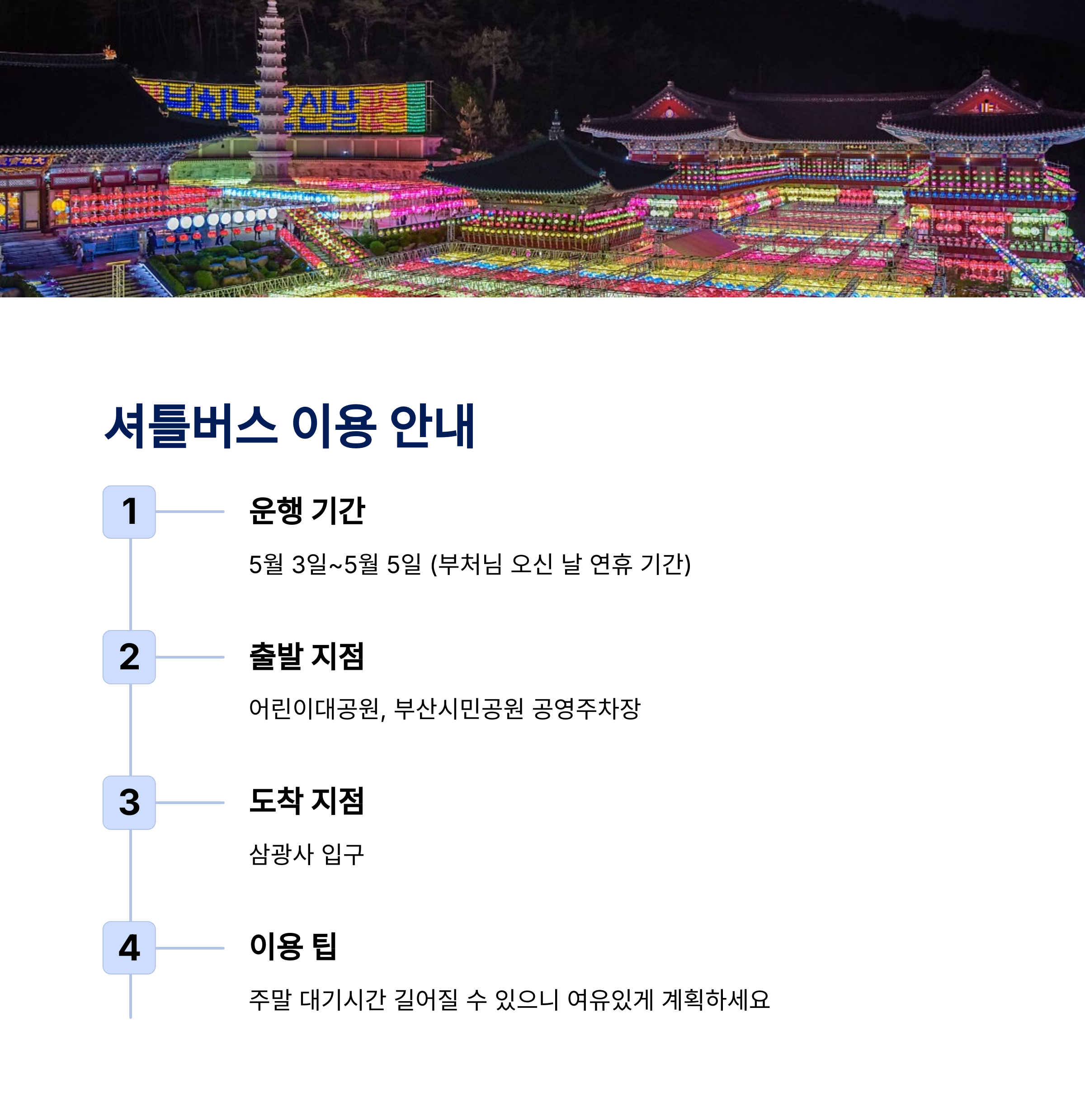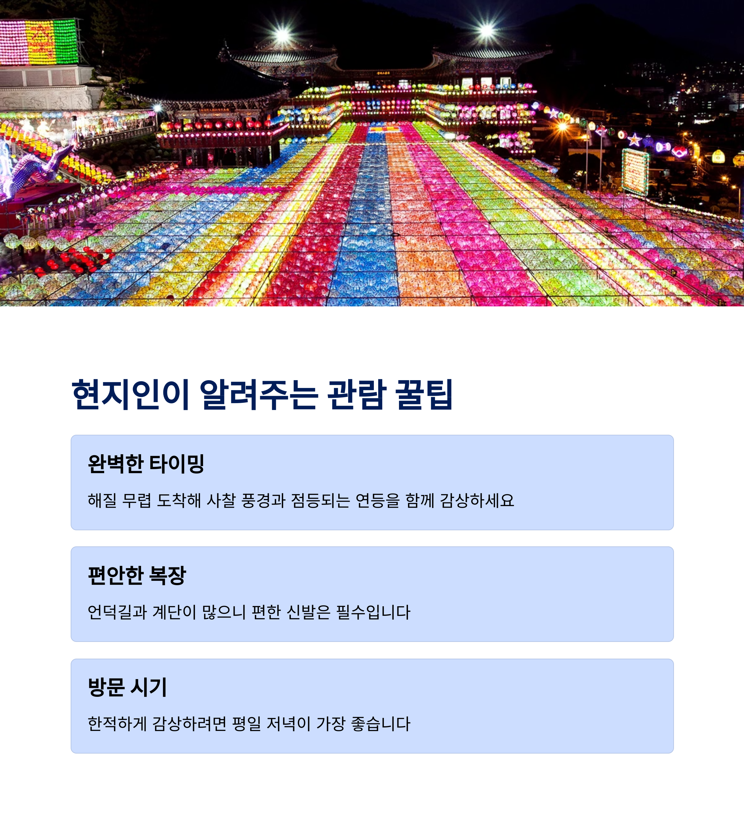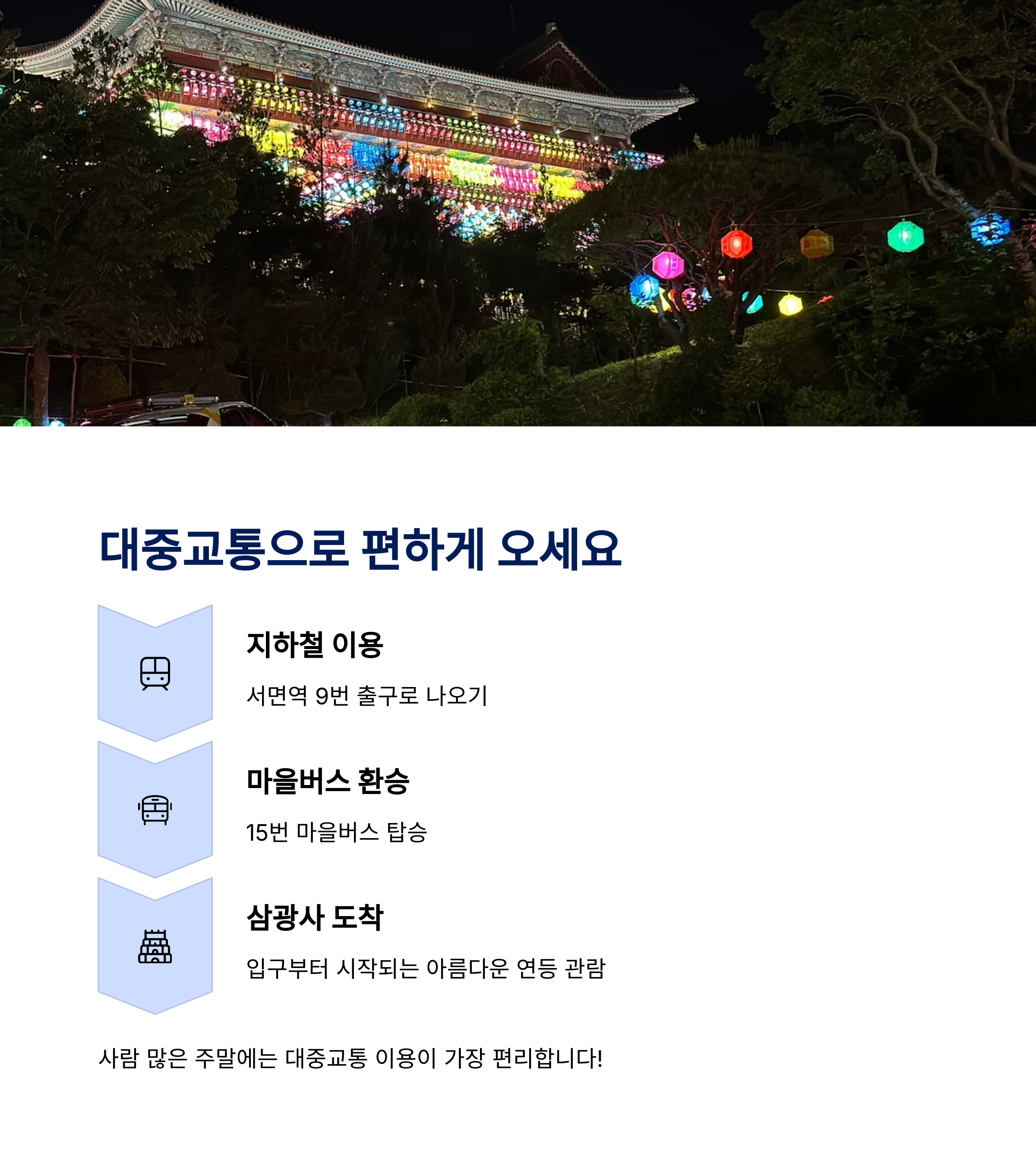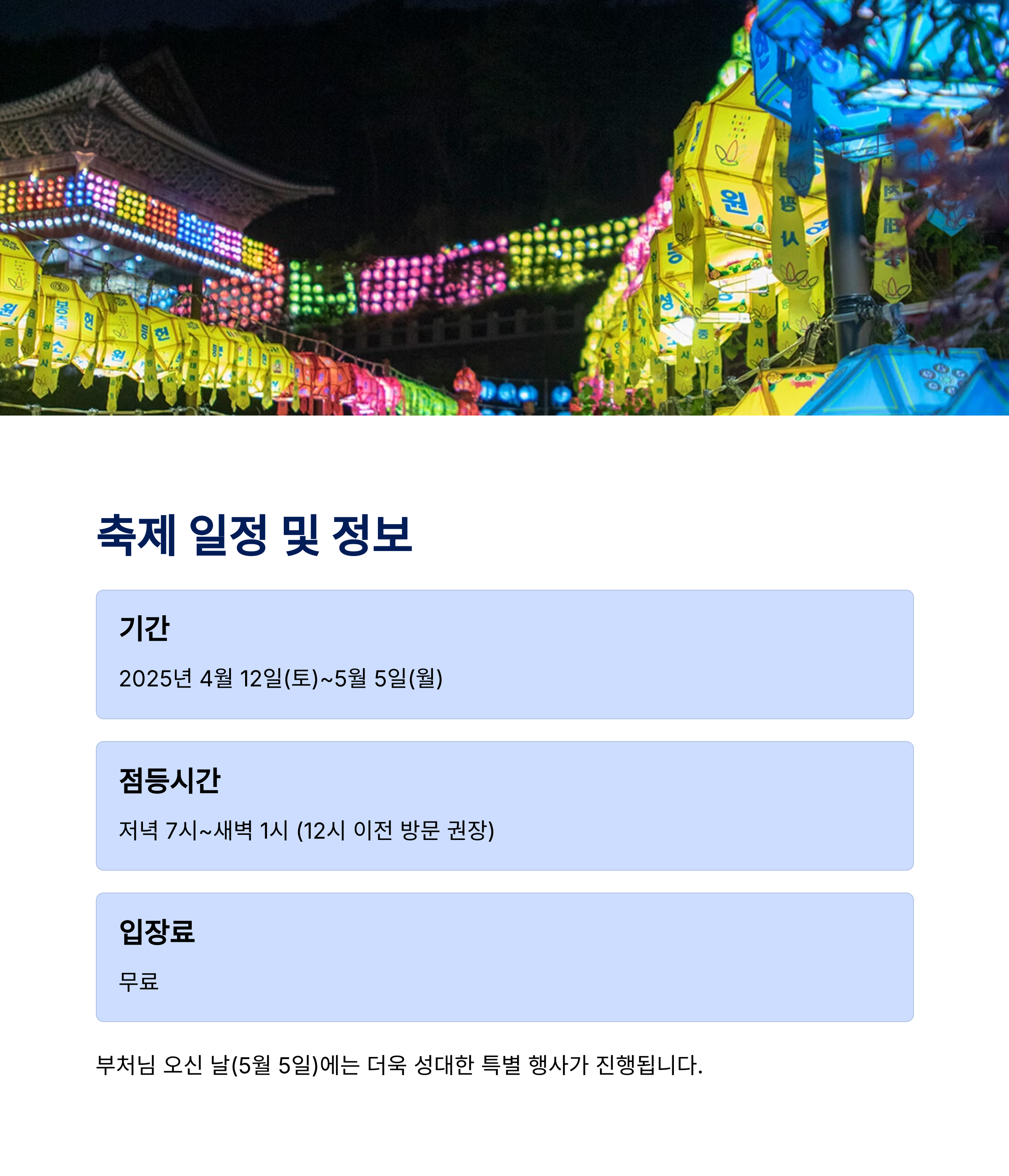 | 연등축제 일정 | 주차장 정보 | 대중교통 팁 |