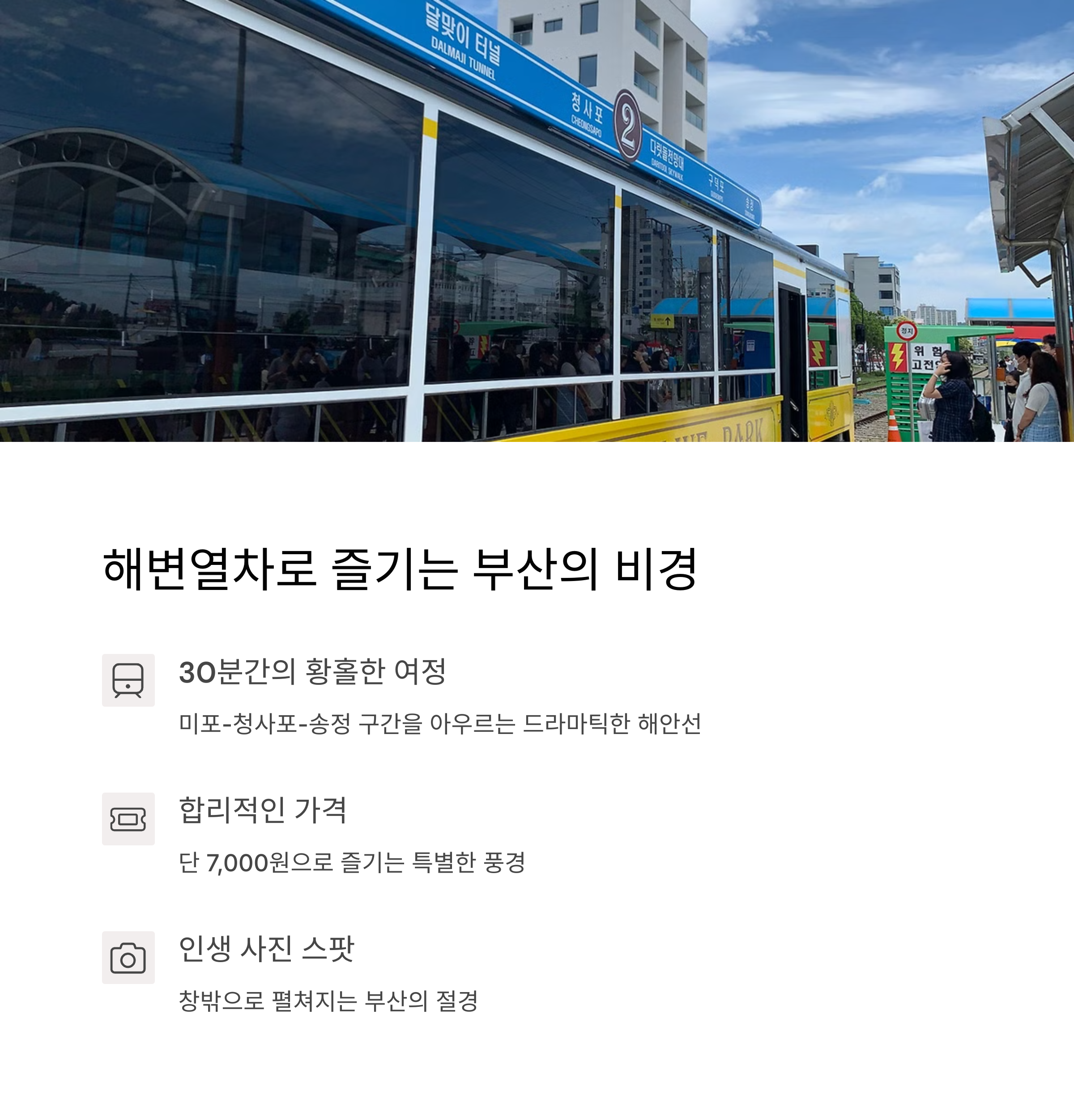 해운대 미포, 청사포, 송정 연결 | 요금 7,000원, 정차 가능 지점 있음 | 요금 35,000원, 가족, 커플 인기 체험 |