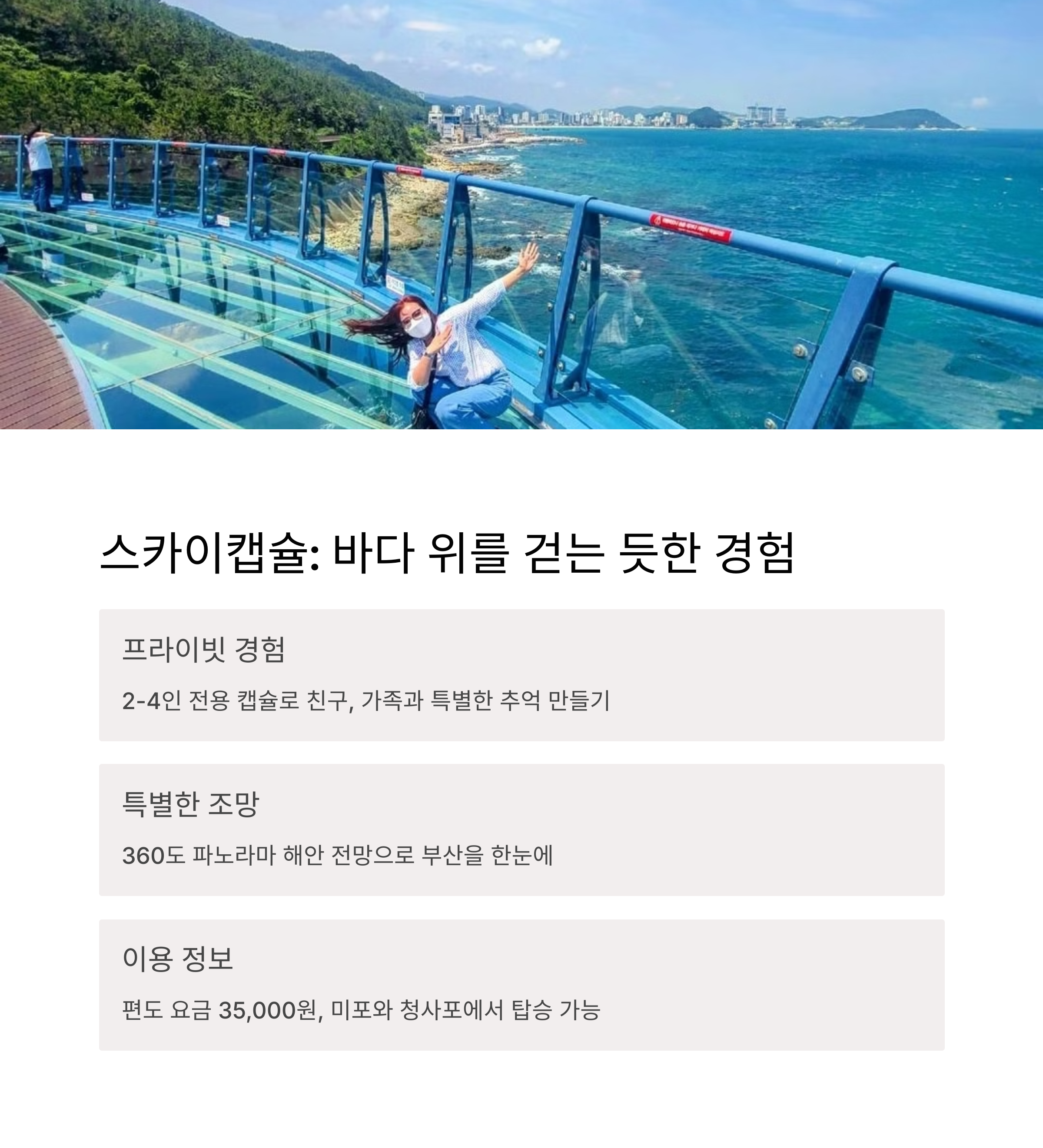 부산은 항상 매력적인 여행지이지만, 해운대 블루라인파크는 그 중에서도 특별한 추억을 만들 수 있는 핵심 코스입니다. 열차와 캡슐을 타며 바다를 따라 이어지는 풍경을 눈에 담고, 여유로운 걸음으로 주변 관광지도 함께 둘러보면 하루가 금방 지나갑니다. 가족, 연인, 친구 누구와 함께해도 만족도가 높은 코스이니 이번 여행에 꼭 포함해보시길 바랍니다. 특히, 노을 시간대의 감성은 여러분의 사진 속에서 더욱 빛을 발할 거예요.