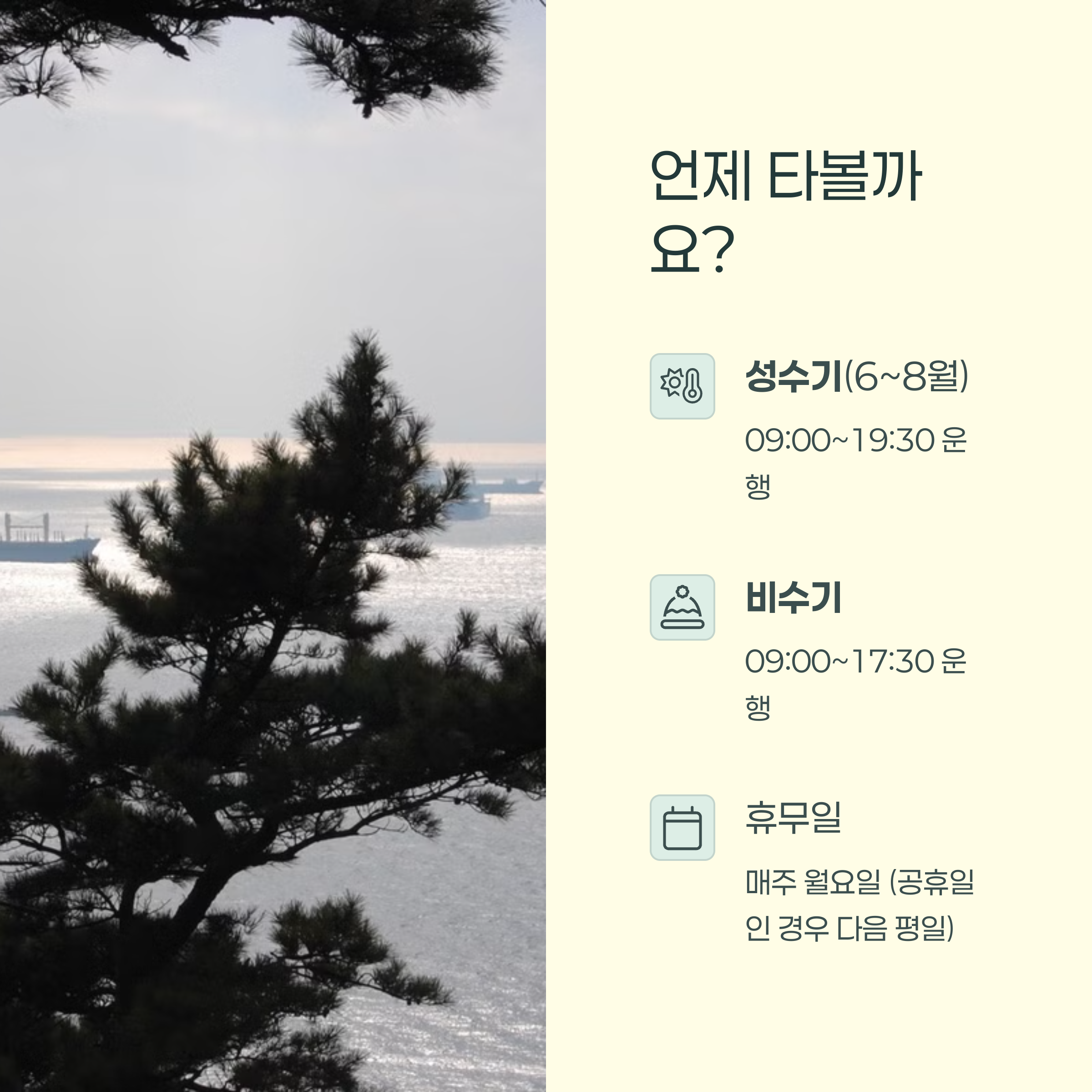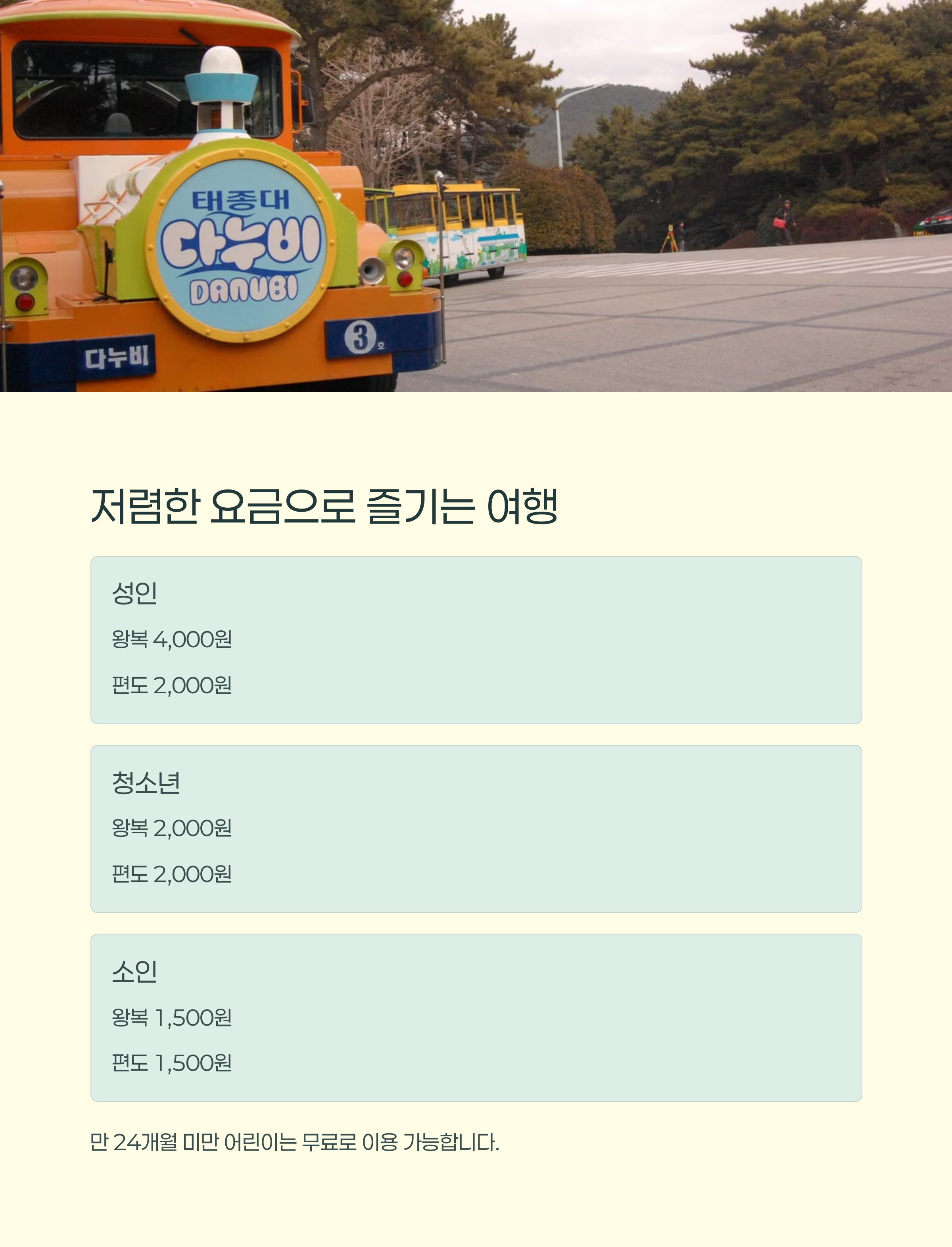 공휴일이 월요일일 경우 다음 평일로 대체 휴무 | 각 정류장에서 자유롭게 승하차 가능 | 현장 매표소에서 구매 가능, 카드 결제 가능 |