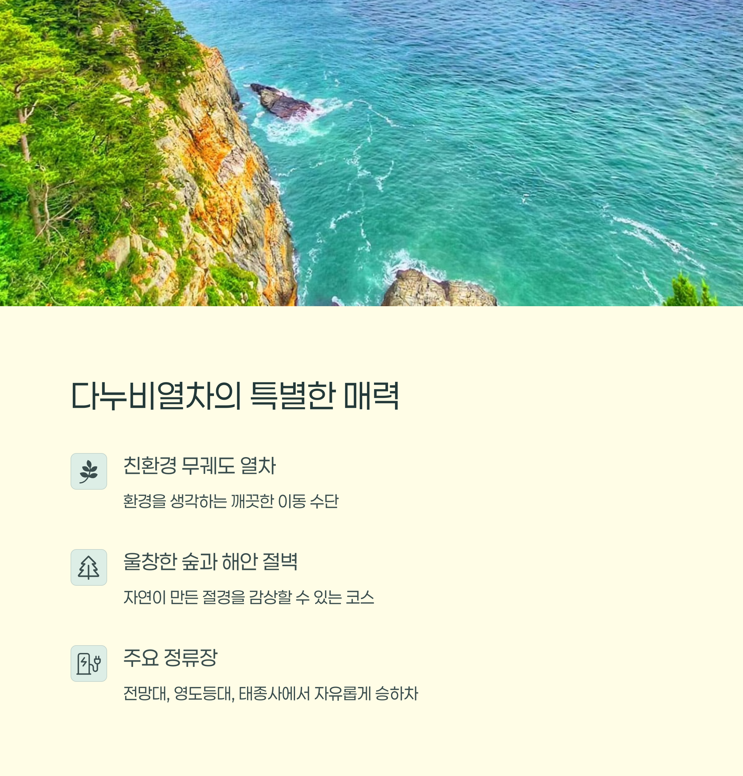 부산 영도에 위치한 태종대 유원지는 해안 절벽과 숲길이 어우러진 대표적인 관광 명소입니다. 이 멋진 풍경을 보다 편하고 효율적으로 감상하고 싶다면 다누비열차를 이용해보세요. 주요 명소를 순환하는 관광열차로, 가족 단위 여행객은 물론, 걷는 것이 부담스러운 분들에게도 최적의 교통 수단입니다. 특히 각 정류장에서 자유롭게 승하차가 가능하기 때문에 시간과 체력을 아끼며 태종대의 포인트만 콕콕 짚어 둘러볼 수 있는 것이 큰 장점입니다. 오늘은 태종대 다누비열차의 운행 시간표와 코스 정보를 한눈에 보기 쉽게 정리해드립니다.