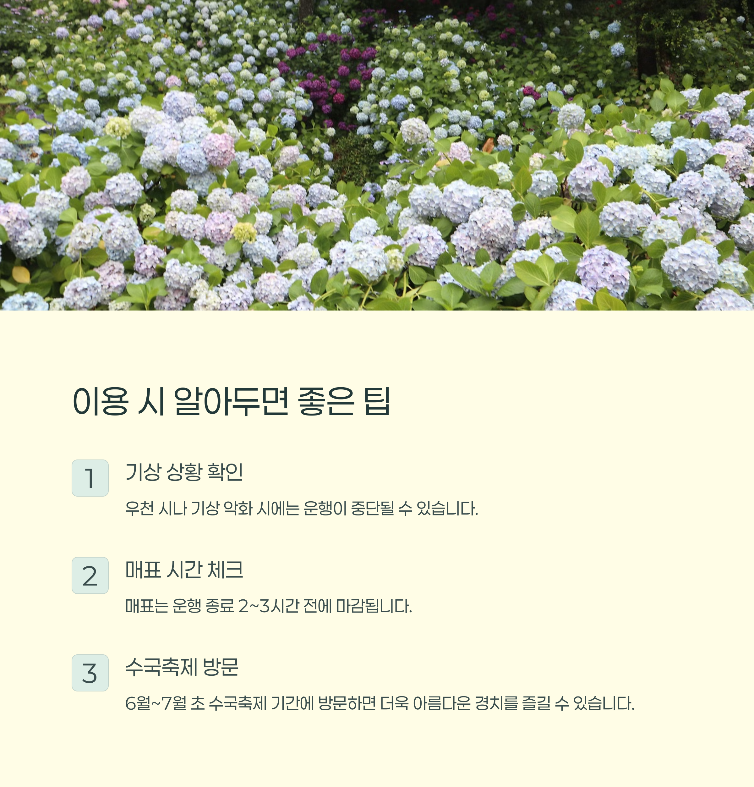 | 공휴일이 월요일일 경우 다음 평일로 대체 휴무 | 각 정류장에서 자유롭게 승하차 가능 | 현장 매표소에서 구매 가능, 카드 결제 가능 |