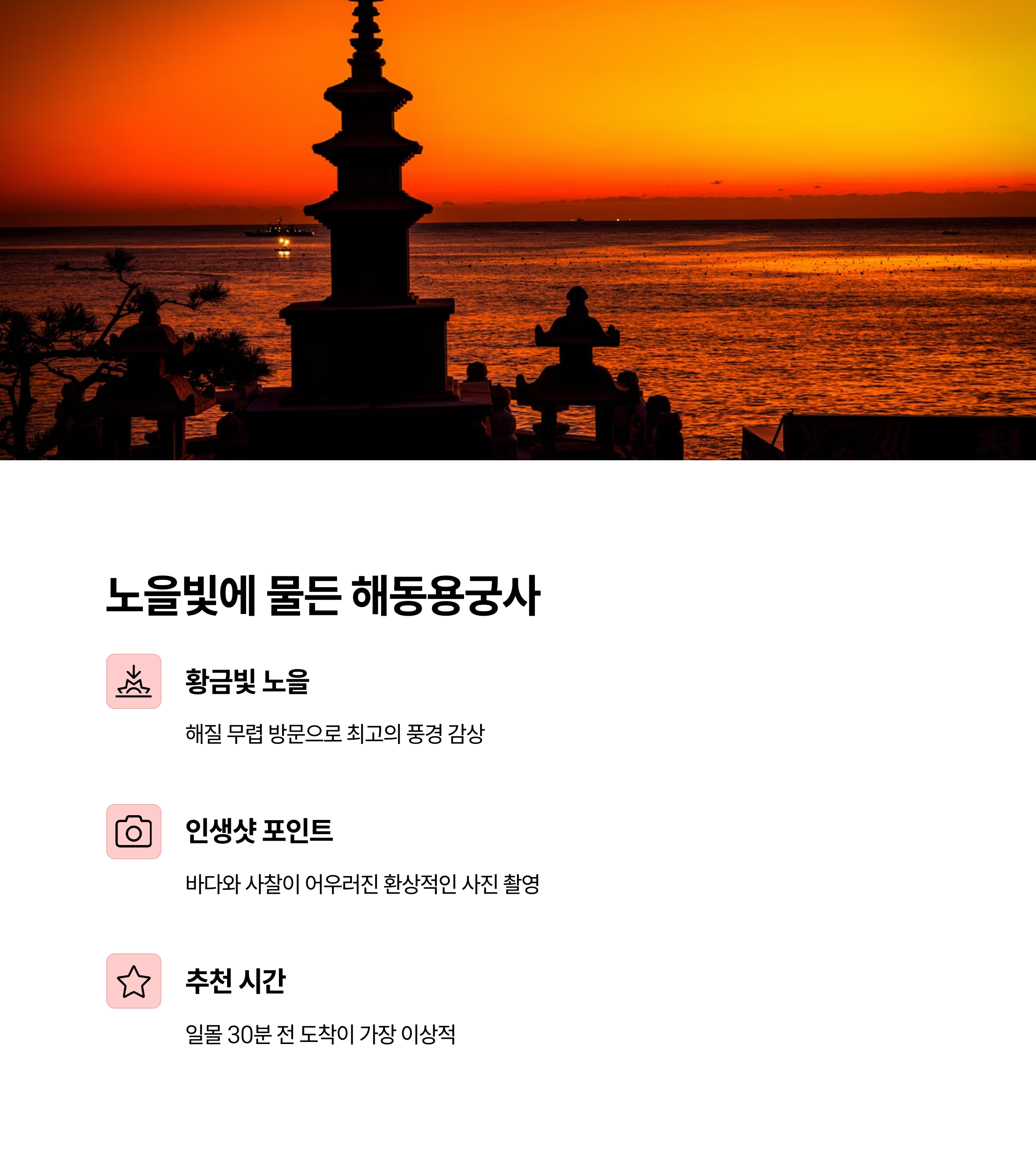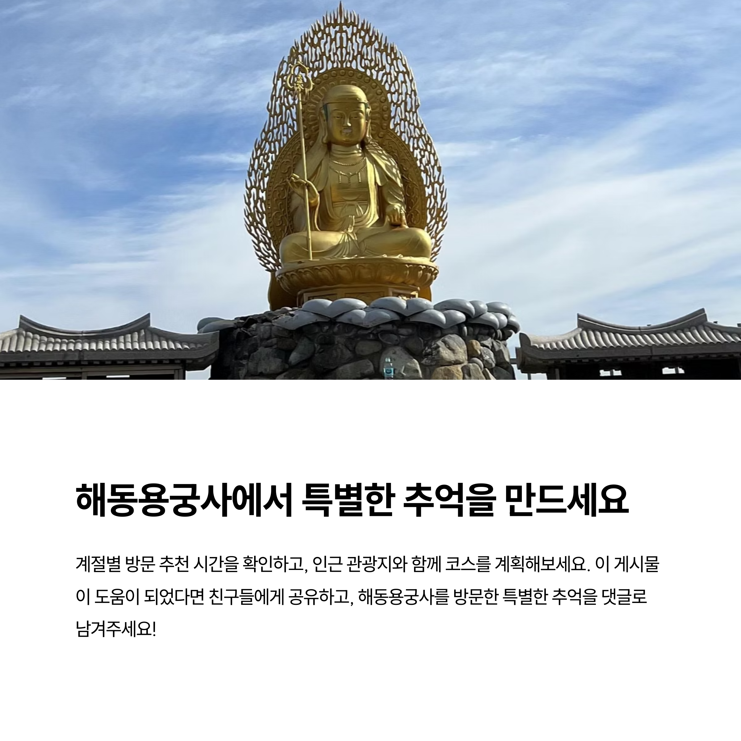 일출, 야경, 한가로운 오후 등 해동용궁사의 다양한 순간 중 가장 기억에 남는 시간대를 댓글로 나눠주세요. 다른 여행자들에게도 큰 도움이 될 거예요!