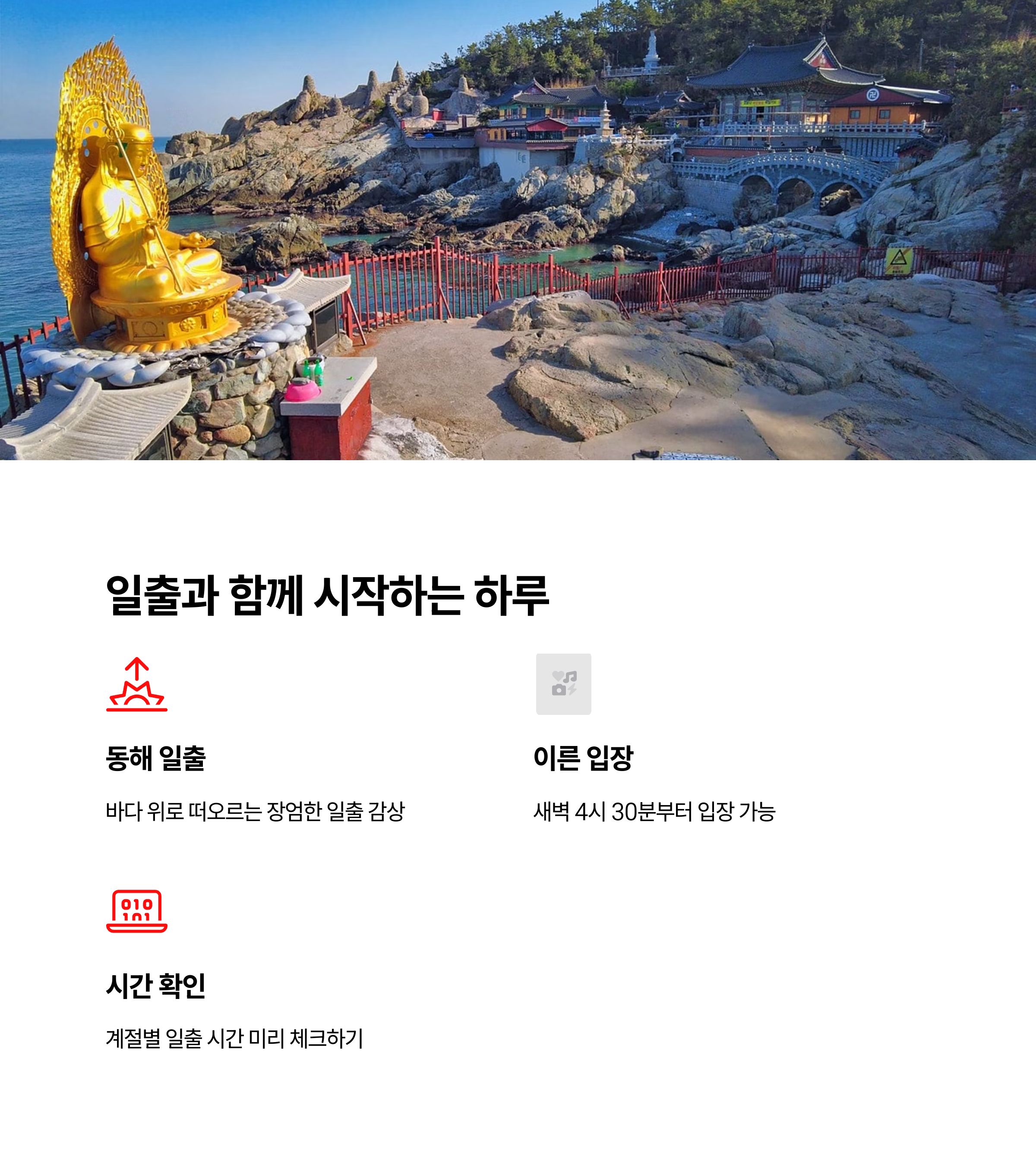 부산 해동용궁사는 바다 위 암반에 지어진 독특한 구조로 도심 속에서 쉽게 접하기 어려운 환상적인 오션뷰 사찰입니다. 새벽 4시 30분부터 운영되며, 일출을 보려는 방문객들에게 부산 대표 일출 명소로 손꼽히고 있습니다. 바다에서 떠오르는 해와 고즈넉한 사찰의 실루엣이 겹쳐지면 자연과 신앙, 감성이 한데 어우러지는 풍경이 펼쳐집니다.