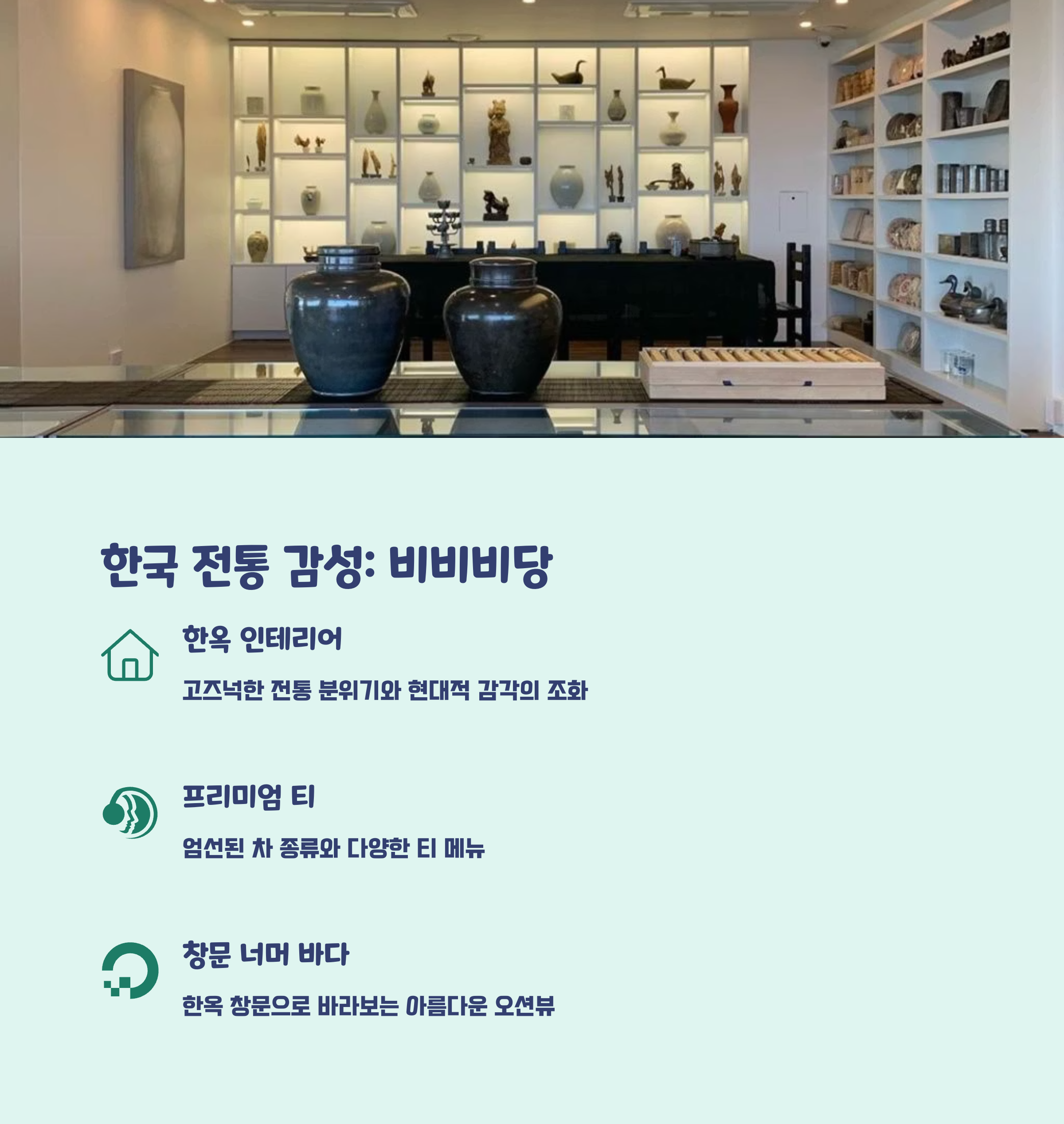 | 추천 포인트 | 통창 오션뷰, 감성 루프탑, 특색 디저트, LP음악 감성, 전통찻집·모던카페 조화 |