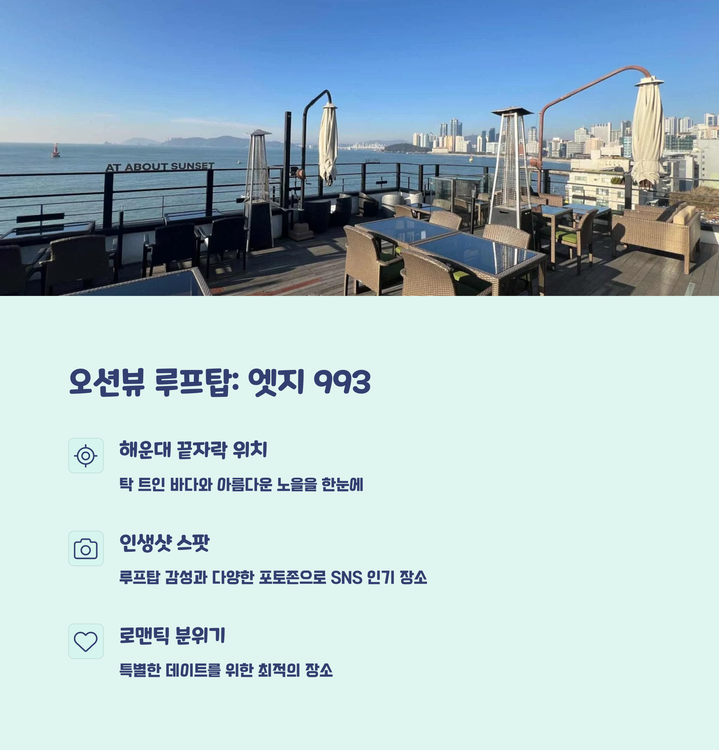 해운대 끝자락 루프탑 오션뷰를 즐기고 싶다면 ‘엣지 993’과 ‘랑데자뷰 해운대점’을 추천합니다. 엣지 993은 탁 트인 바다와 노을이 어우러지는 전망 맛집으로 루프탑 좌석과 넓은 실내, 모던한 인테리어가 인상적이에요. 랑데자뷰는 감성적인 포토존과 연출된 분위기로 커플 데이트나 여행 인증샷을 남기기 좋은 곳입니다.