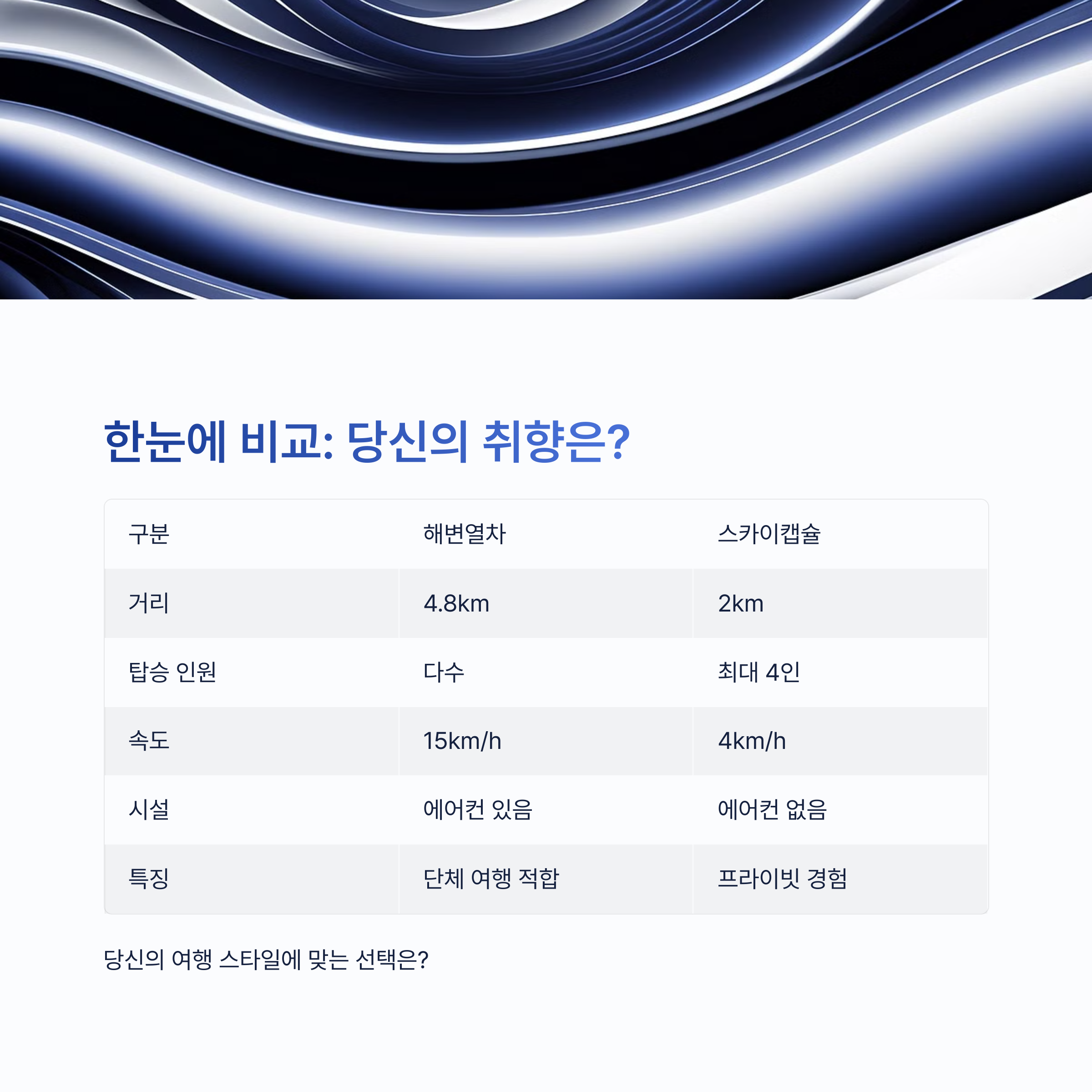해변열차 vs 스카이캡슐! 실제 탑승 후기나 추천 시간대를 댓글로 공유해 주세요. 다음 여행자의 결정에 큰 도움이 됩니다 :)