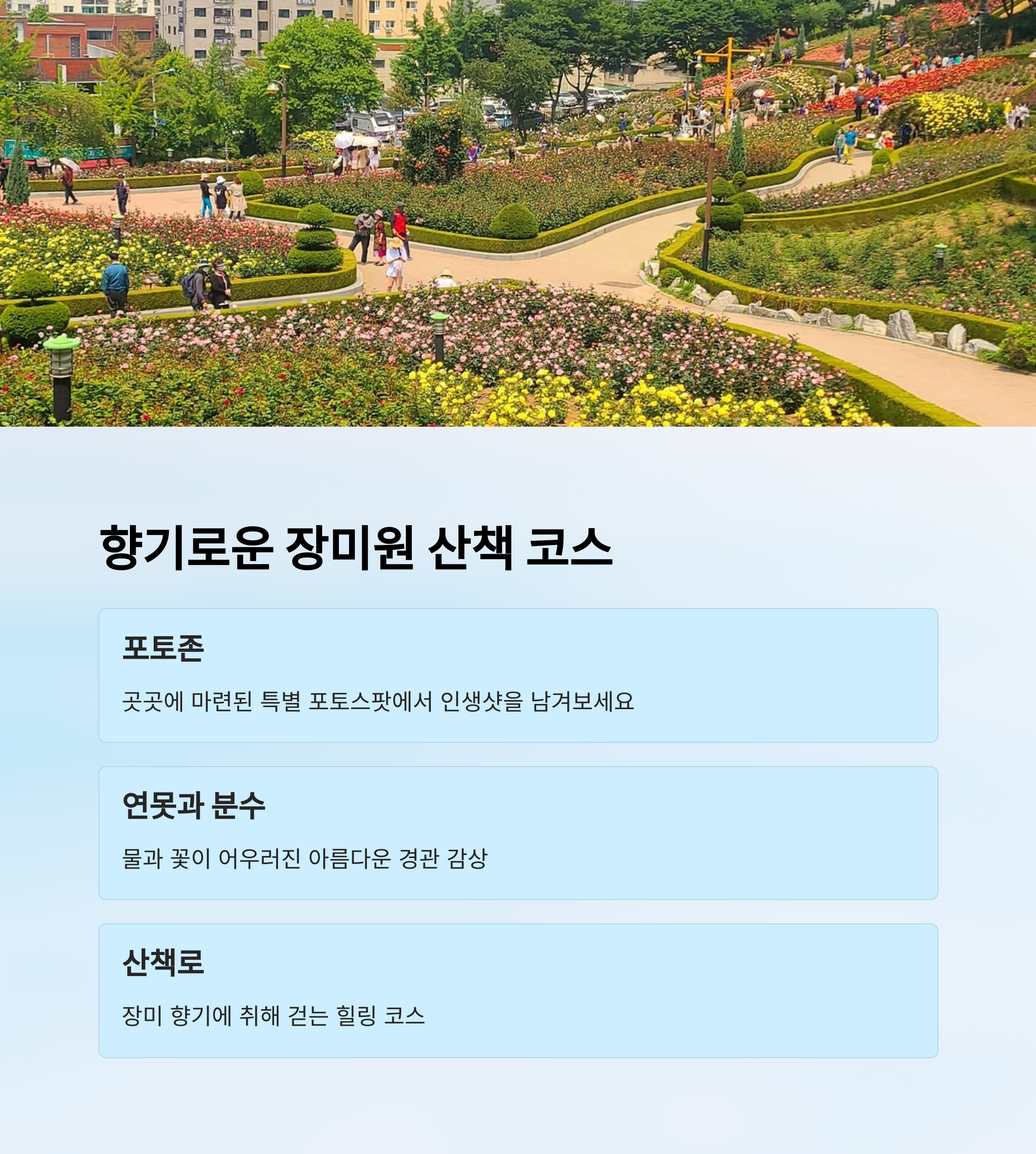 특히 5월 중순부터 6월 초까지는 장미가 절정을 이루는 시기로, 축제와 함께 다양한 프로그램이 펼쳐집니다. 포토존은 물론, 분수와 연못 주변은 인생샷 명소로 알려져 있어 SNS에서도 화제를 모으고 있습니다. 입장료가 없는 공원이기에 누구나 부담 없이 방문할 수 있고, 주말이나 평일 모두 여유롭게 꽃을 감상할 수 있다는 점도 장점입니다. 산책하다 보면 자연스레 마음까지 힐링되는 느낌을 받을 수 있습니다.