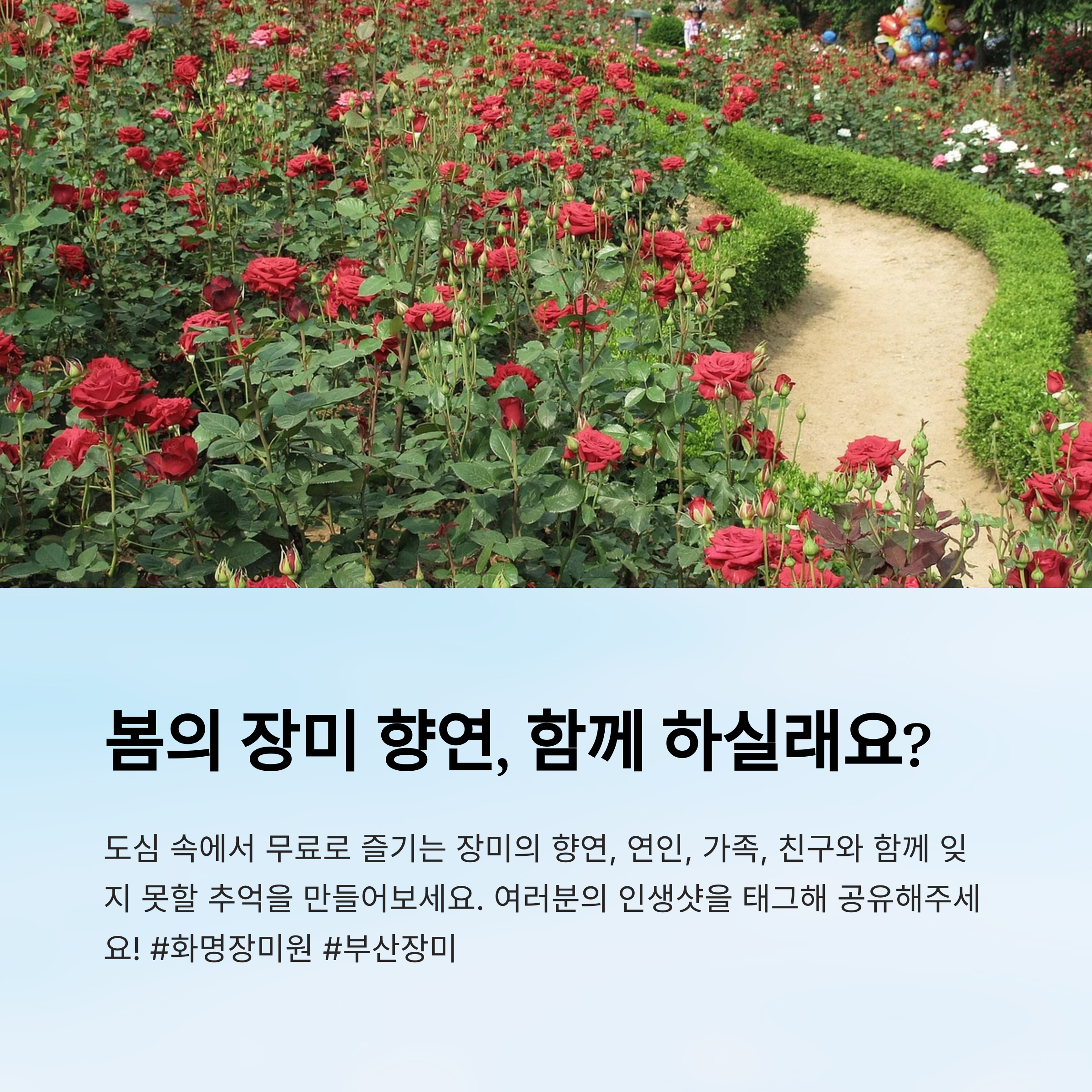 부산 화명 장미원은 계절의 향기와 자연의 아름다움을 가까이에서 느낄 수 있는 도심 속 힐링 명소입니다. 다양한 품종의 장미가 펼쳐지는 산책로를 따라 걷다 보면, 바쁜 일상에서 벗어나 여유로운 시간을 보낼 수 있습니다. 축제 기간에는 풍성한 장미꽃뿐 아니라 다양한 포토존과 프로그램까지 함께 즐길 수 있어 가족, 연인, 친구와 함께하기에 더없이 좋습니다. 봄과 초여름, 특별한 꽃구경을 원한다면 화명 장미원으로 향해보세요.