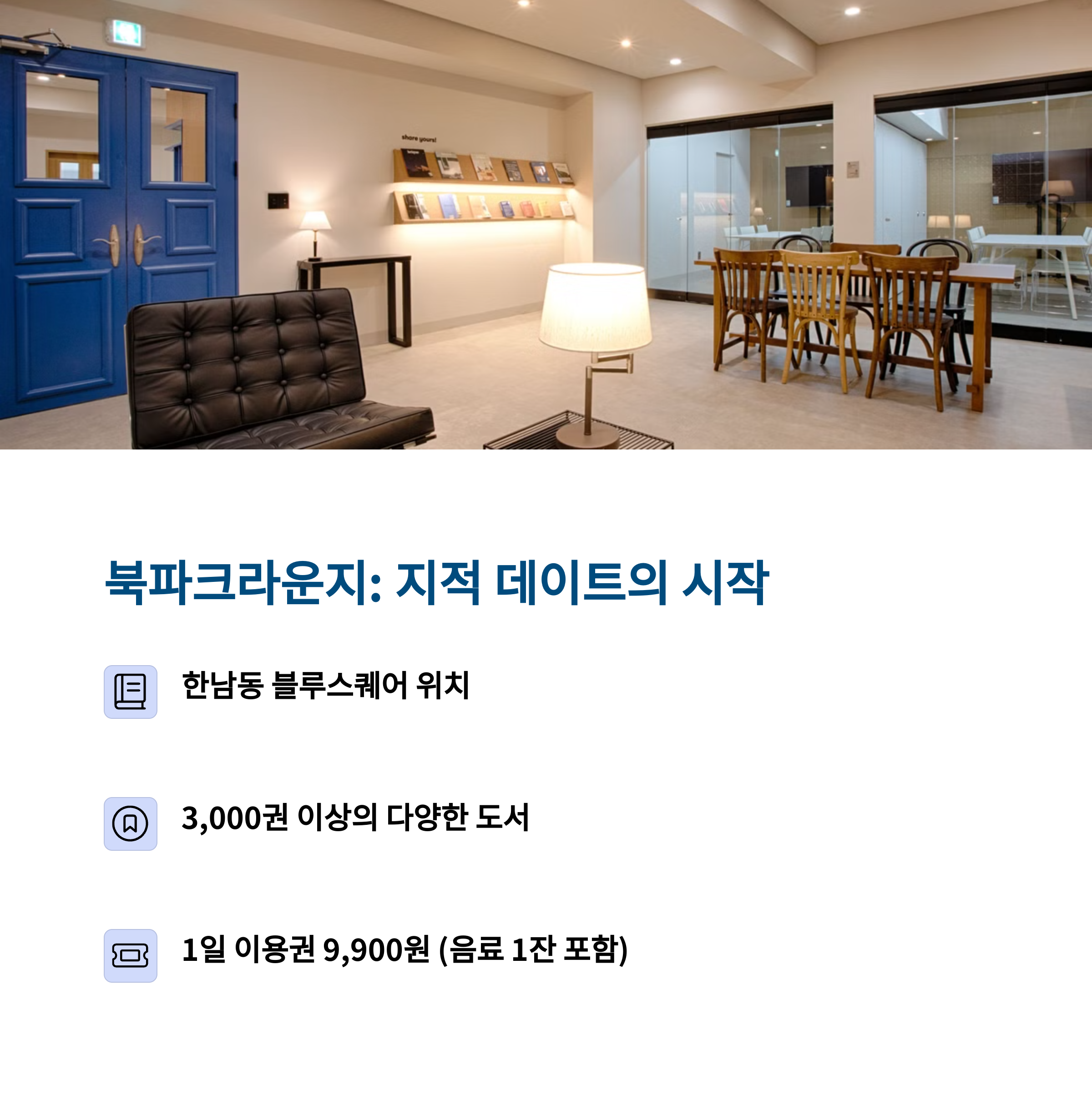 | 지적인 분위기 속 감성적인 하루를 보내는 데이트 | 한남동 위치, 3천 권 도서 보유, 하루 이용권 제공 | 한강뷰, 일몰명소, 조용한 독서와 휴식공간 |