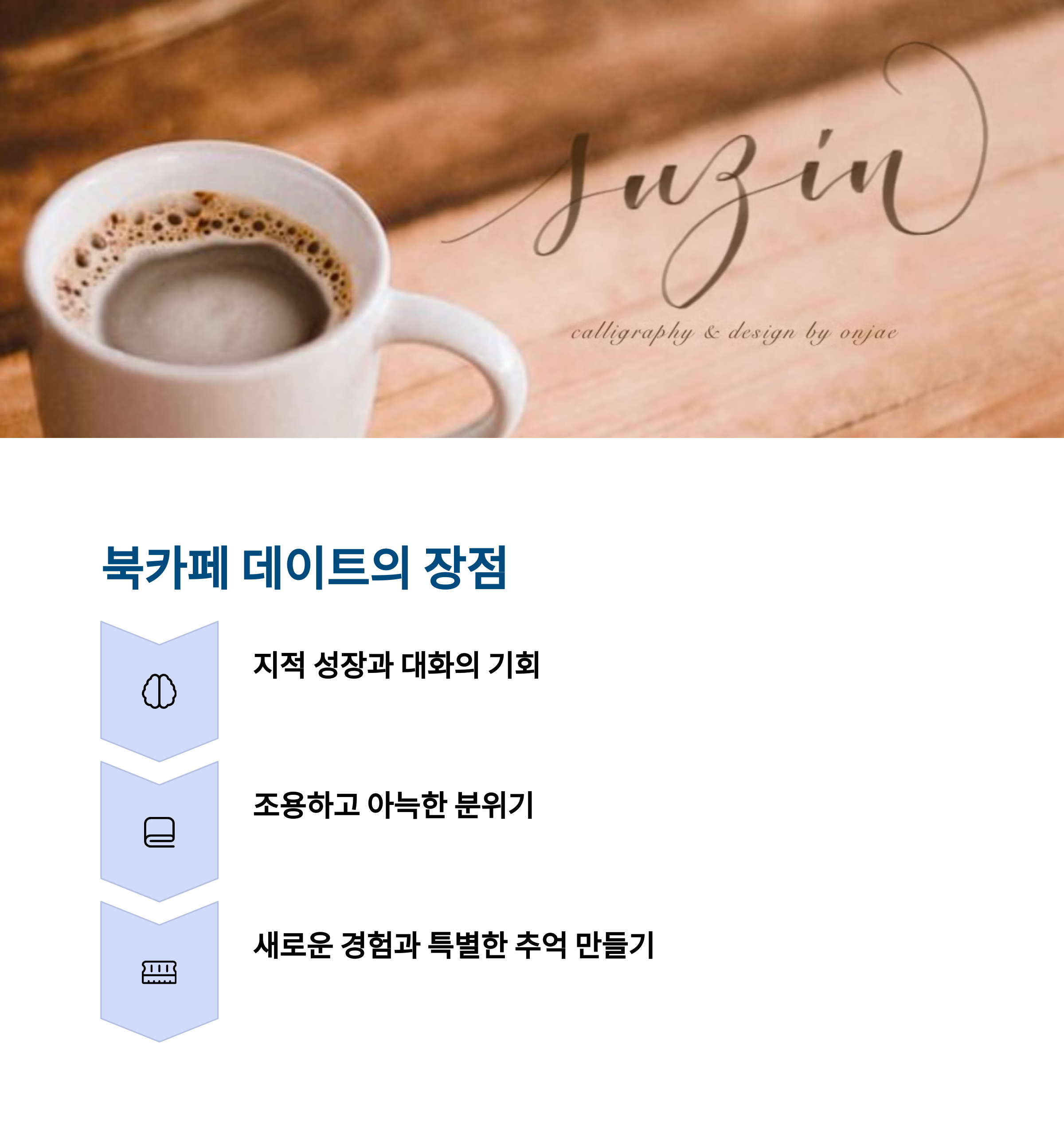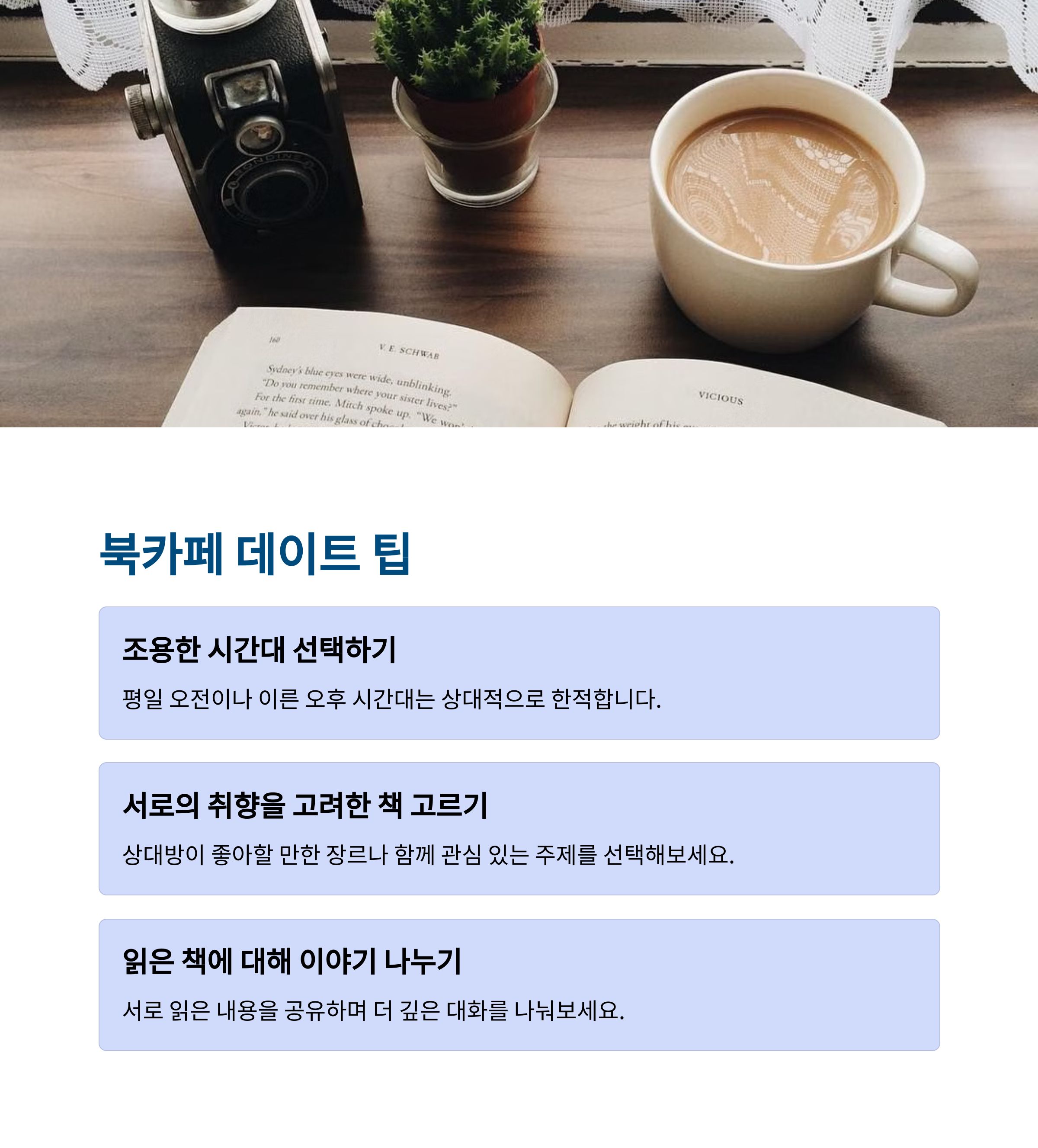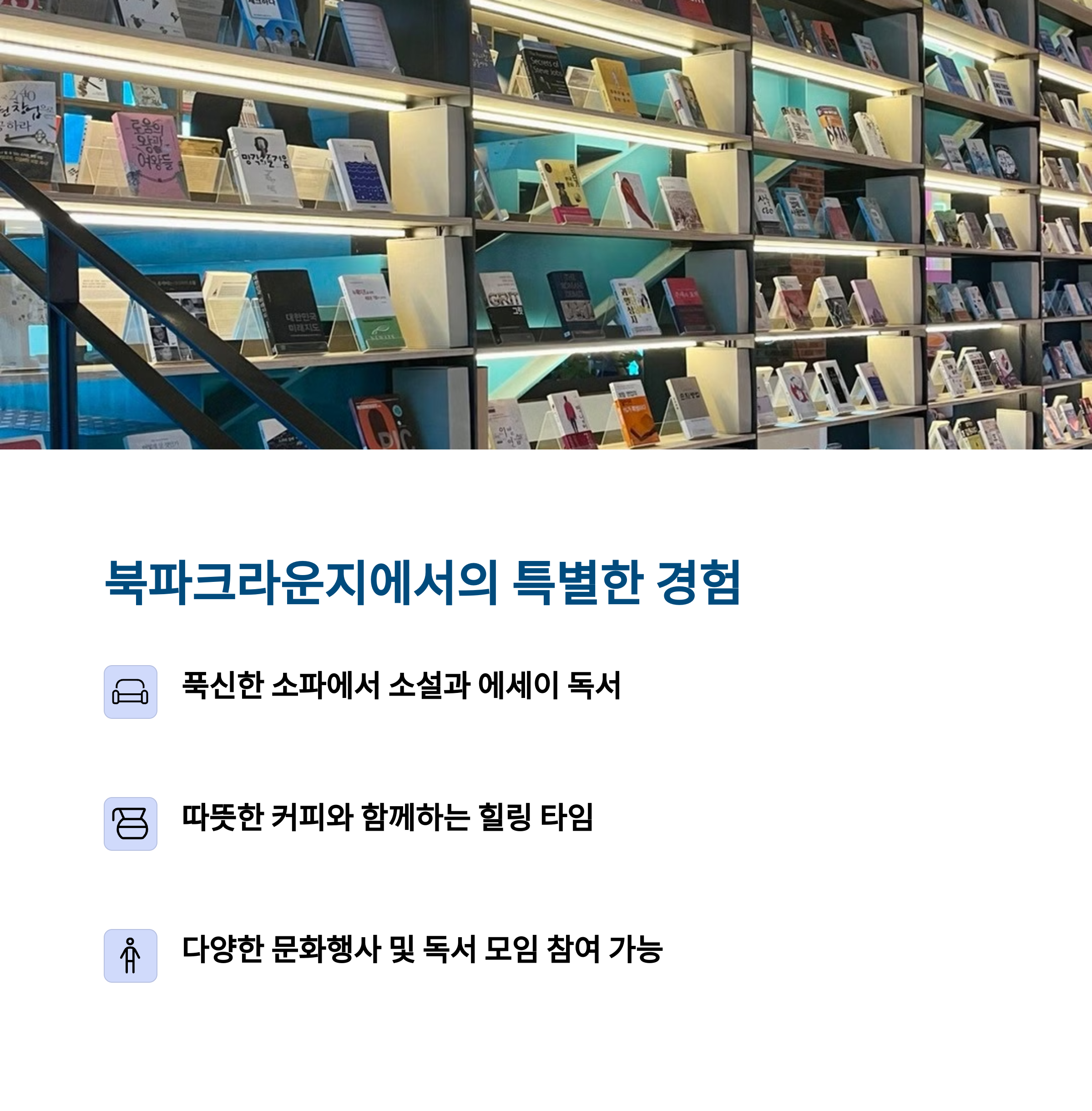 | 독서와 커피가 어우러진 힐링 데이트 | 독서 모임, 문화 행사도 함께 즐길 수 있음 | 도심 속 자연과 감성이 공존하는 명소 |