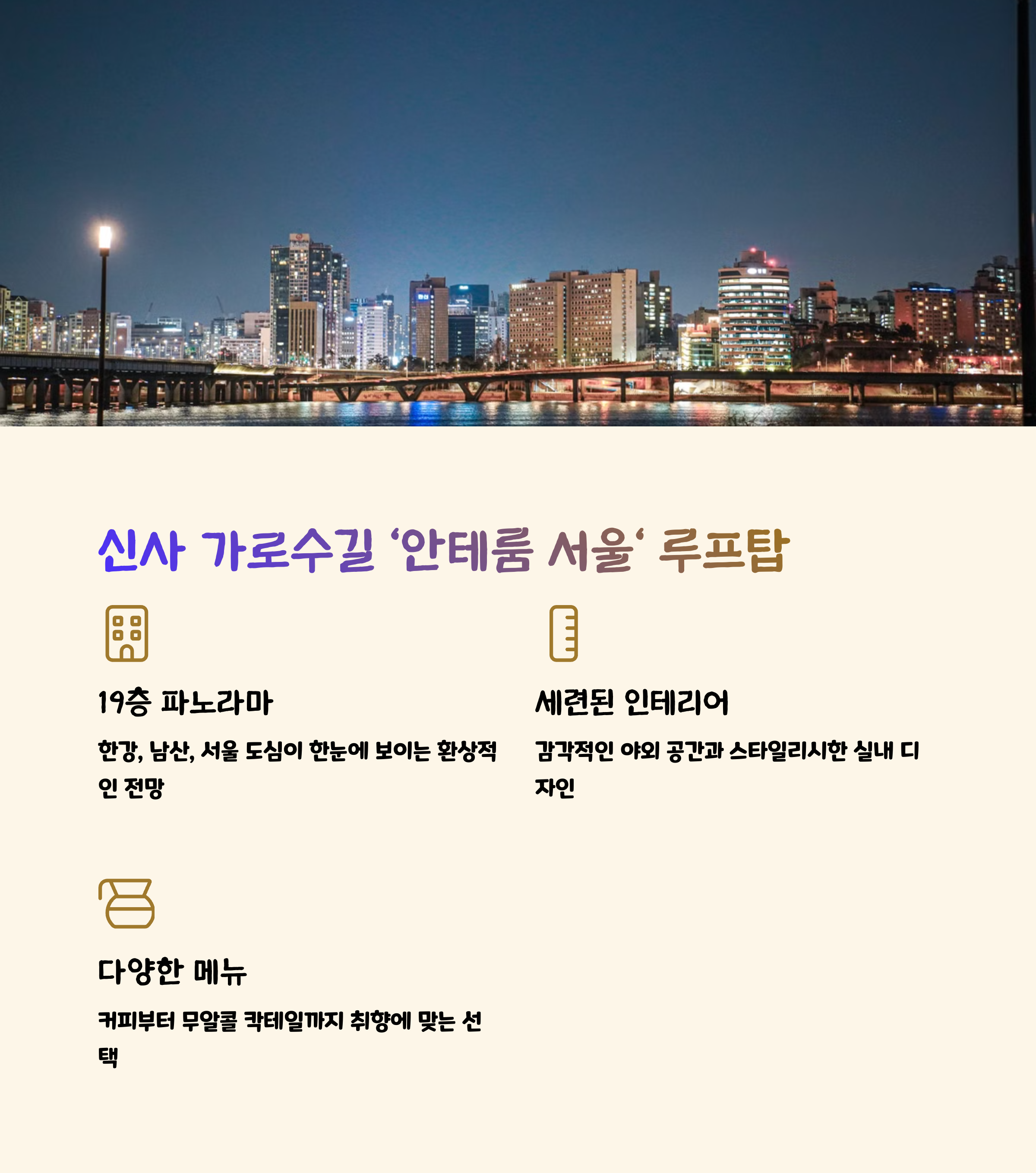 한강 뷰를 찾는다면 신사 가로수길 ‘안테룸 서울’ 루프탑이 제격이에요. 19층 고층 루프탑에서 한강과 남산이 한눈에 들어오는 파노라마 뷰가 펼쳐지며, 세련된 인테리어와 감각적인 분위기로 낮과 밤 모두 만족스러운 공간이에요. 일몰 타이밍엔 특히 로맨틱한 분위기를 느낄 수 있답니다.