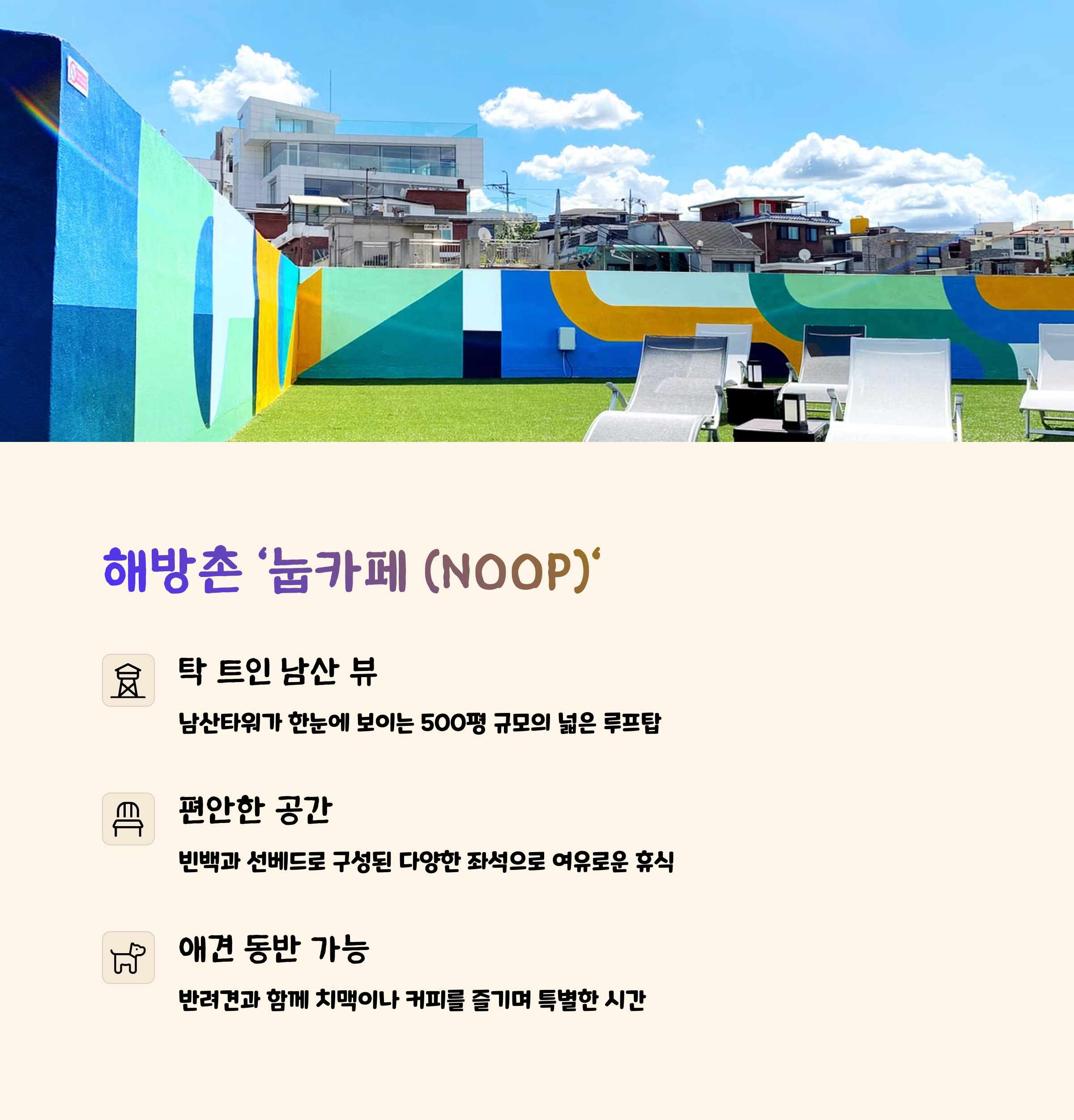 서울에서 남산 뷰 루프탑을 찾는다면 해방촌의 ‘눕카페(NOOP)’를 추천해요. 남산타워가 가까이 보이는 탁 트인 전망과 500평 규모의 넓은 루프탑, 빈백·선베드 좌석이 있어 여유롭게 쉬며 커피나 맥주를 즐기기 좋아요. 프라이빗한 분위기, 애견 동반 가능한 점도 매력 포인트랍니다.