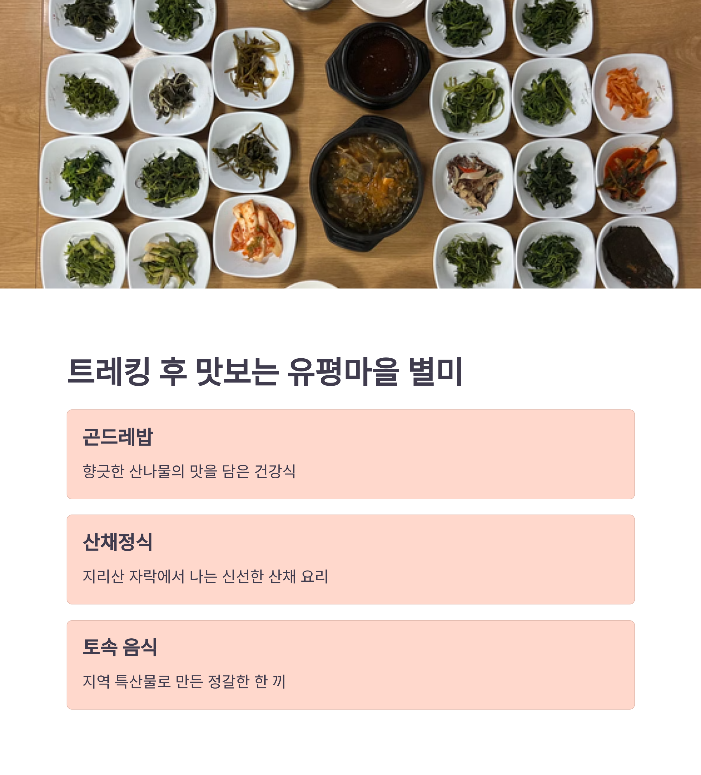 트레킹 코스 중간에는 ‘용소’라 불리는 맑고 깊은 소(沼)가 있으며, 이곳은 물빛이 유난히 푸르고 고요하여 사진 촬영이나 잠시 휴식을 취하기에 안성맞춤입니다. 데크 위에 앉아 발을 담그며 쉬거나, 나무 아래에 놓인 벤치에서 책을 읽으며 여유를 즐길 수도 있습니다. 또한 종점인 유평마을에 도착하면 토속음식점에서 직접 만든 산채비빔밥, 청국장, 도토리묵 등을 맛볼 수 있어 트레킹의 마무리를 더욱 특별하게 만들어줍니다. 이처럼 산청 대원사 계곡길은 오감을 만족시키는 여정입니다.