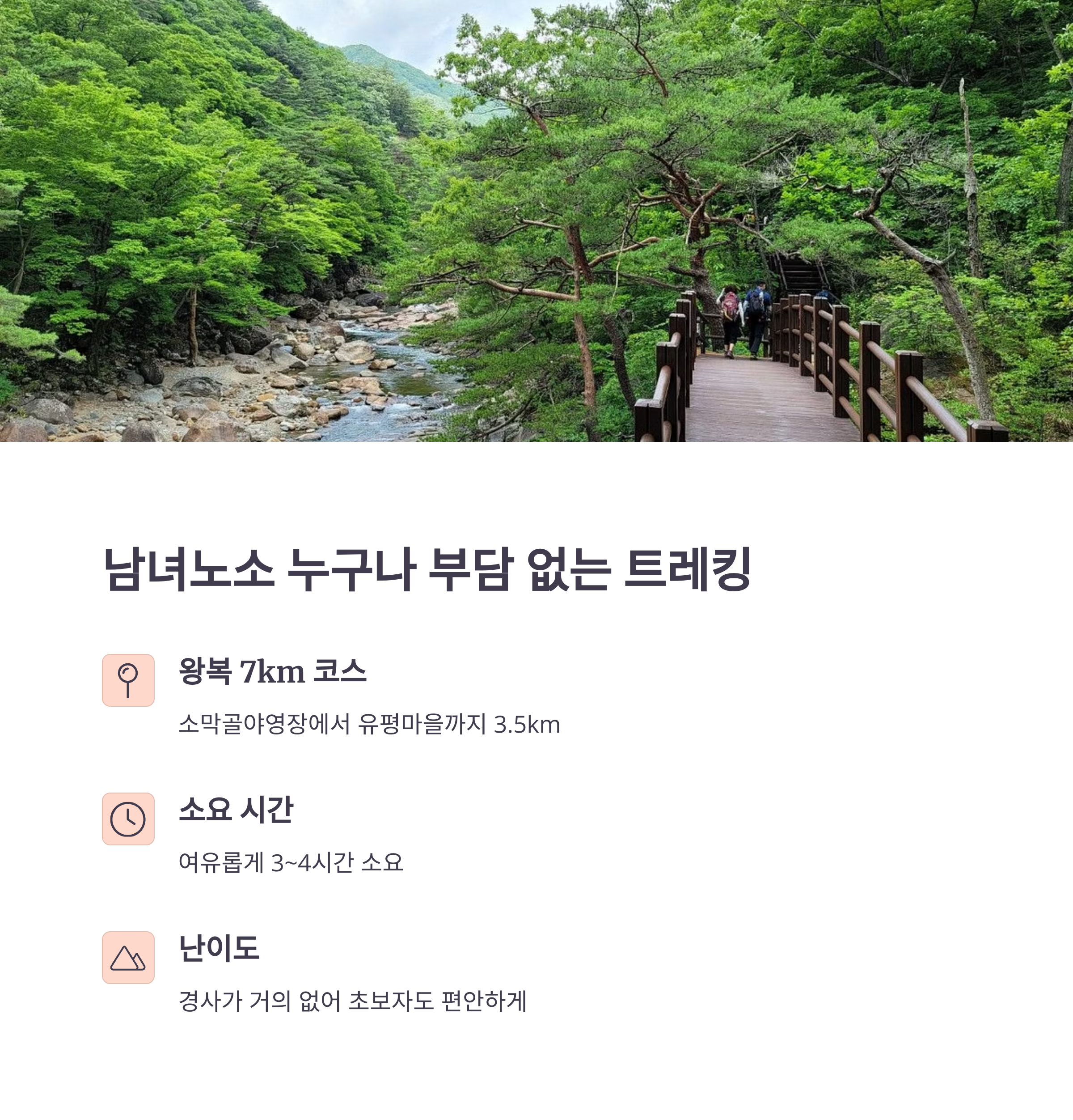 | 데크길, 숲길, 용소 절경, 쉼터 | 부담 없는 난이도와 다양한 체험 포인트 | 가족, 연인 모두에게 추천하는 힐링 여행지 |
