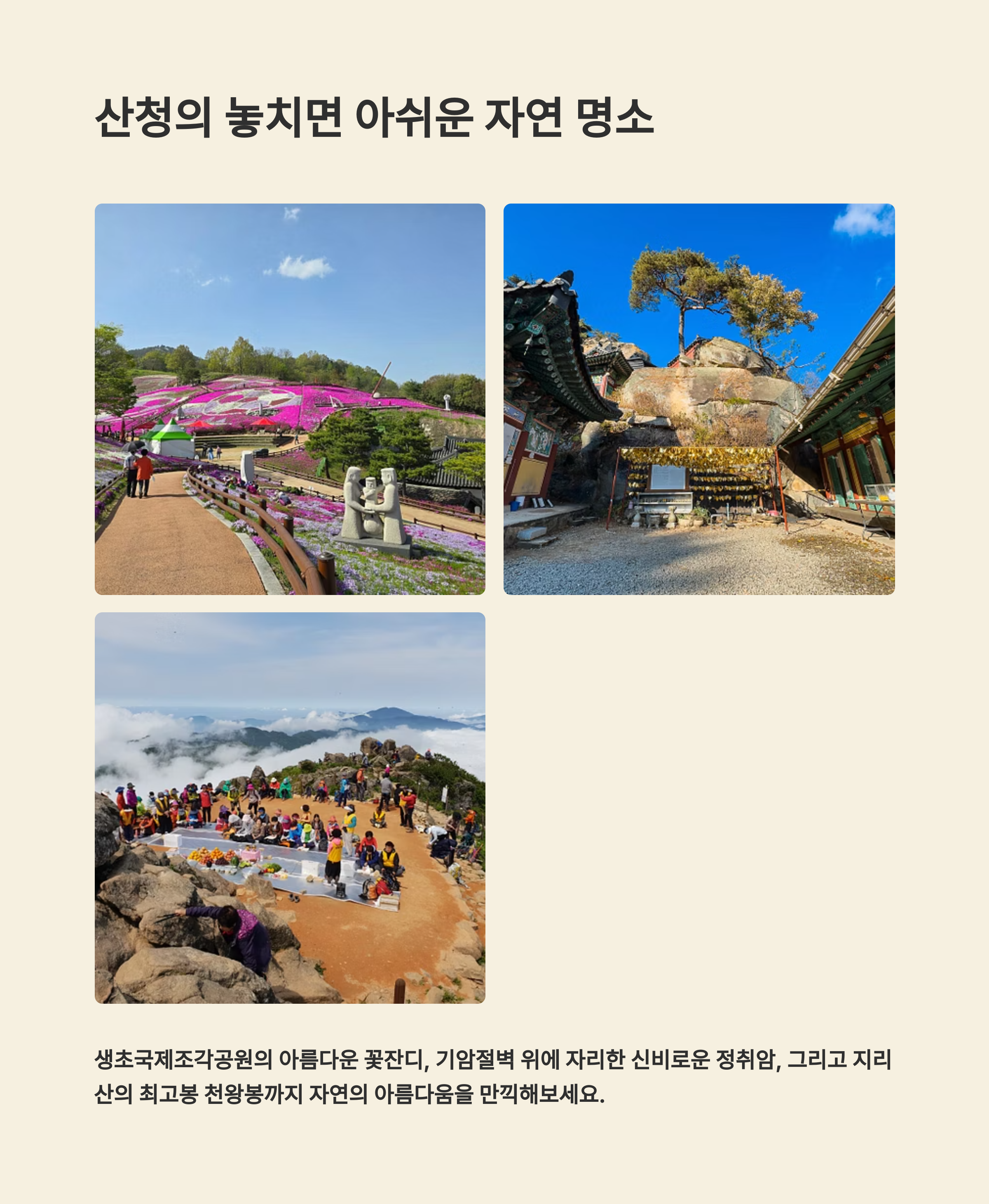트레킹 후에는 한방 힐링 테마파크 동의보감촌에 들러 산책로, 족욕 체험, 한방 전시관 등을 둘러보며 여유로운 시간을 보내는 것도 좋습니다. 황매산 철쭉과 남사예담촌은 계절마다 아름다움을 더하며, 정취암에서는 기암절벽의 장엄한 풍경과 함께 산청의 전통 사찰 문화까지 함께 접할 수 있습니다.