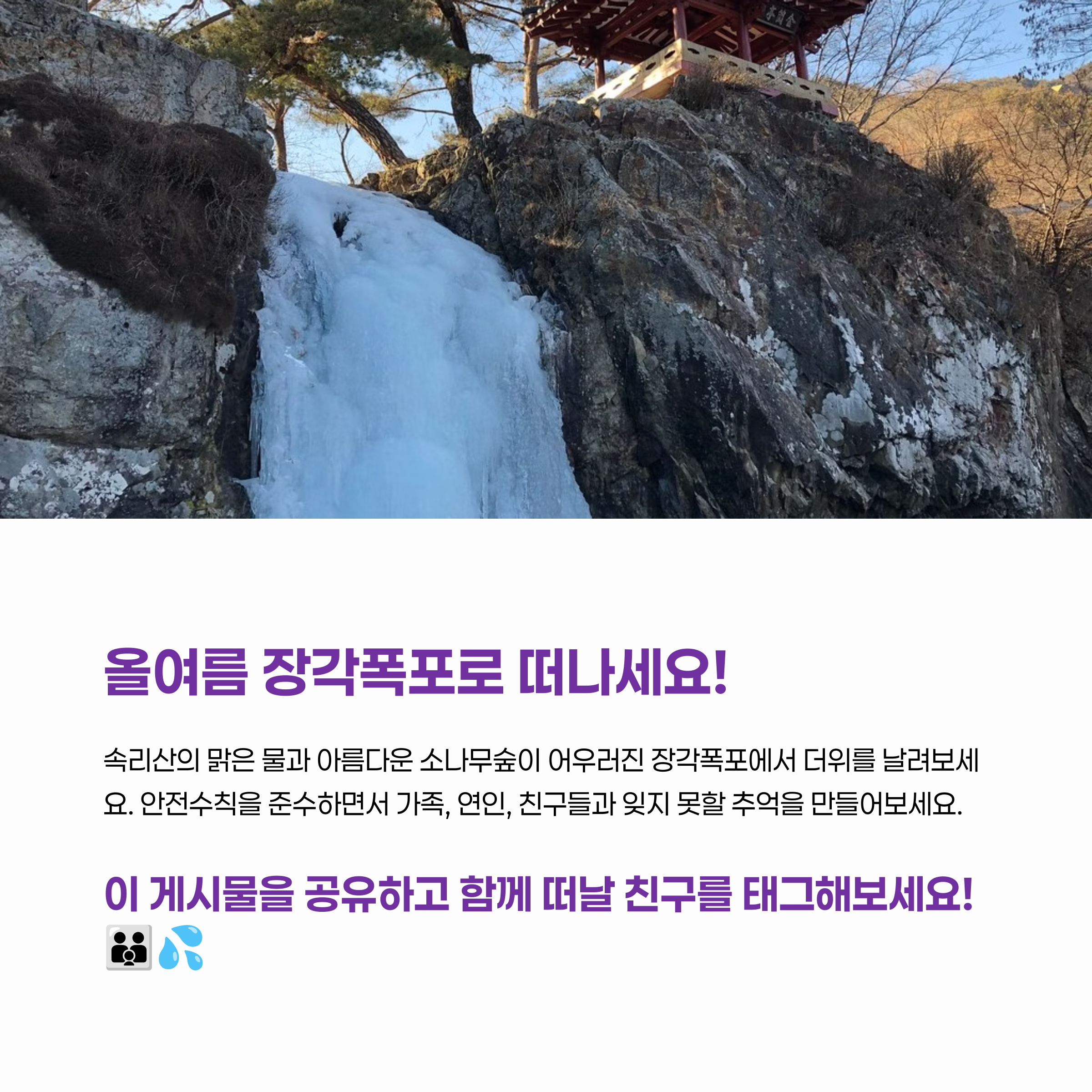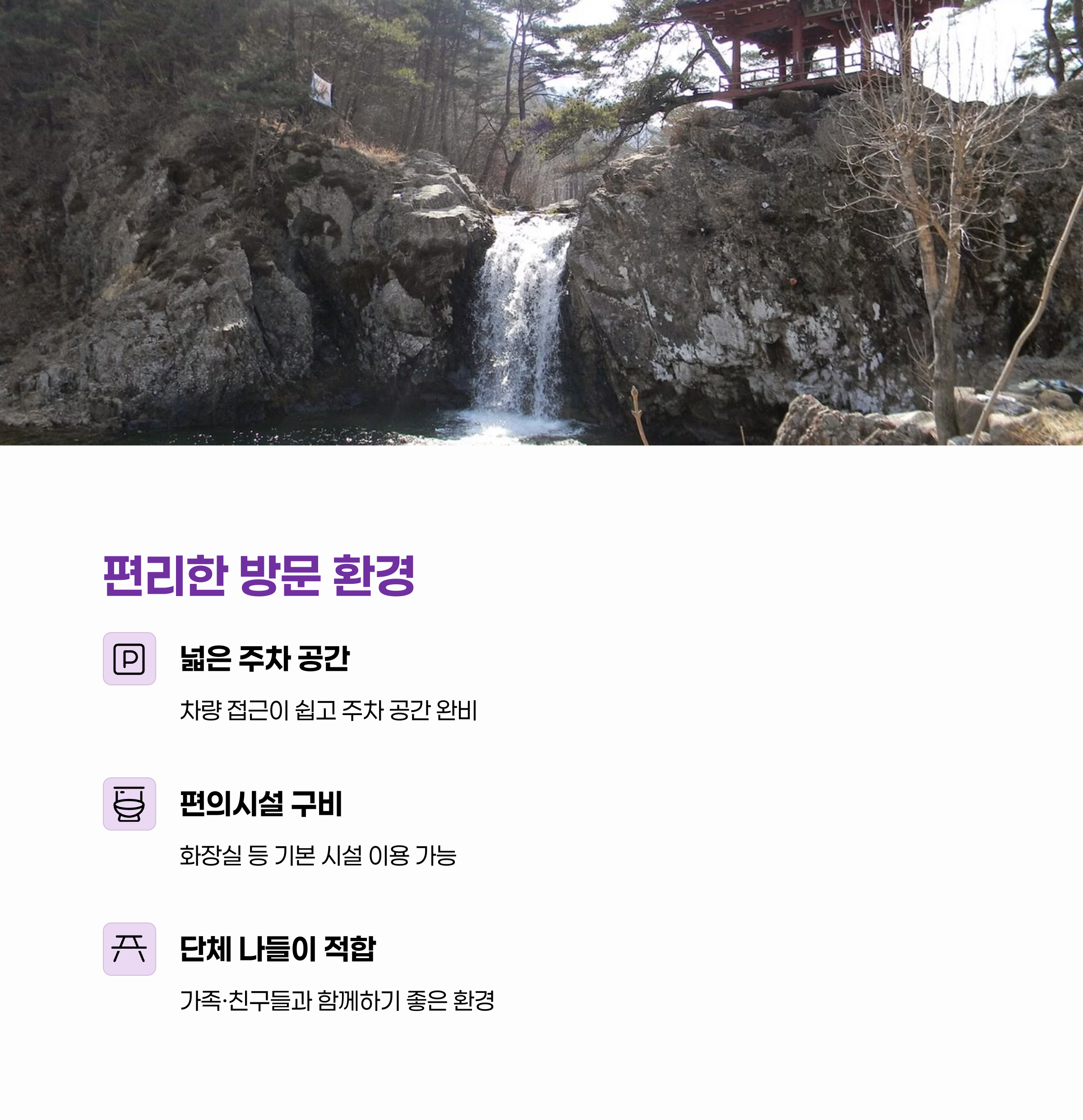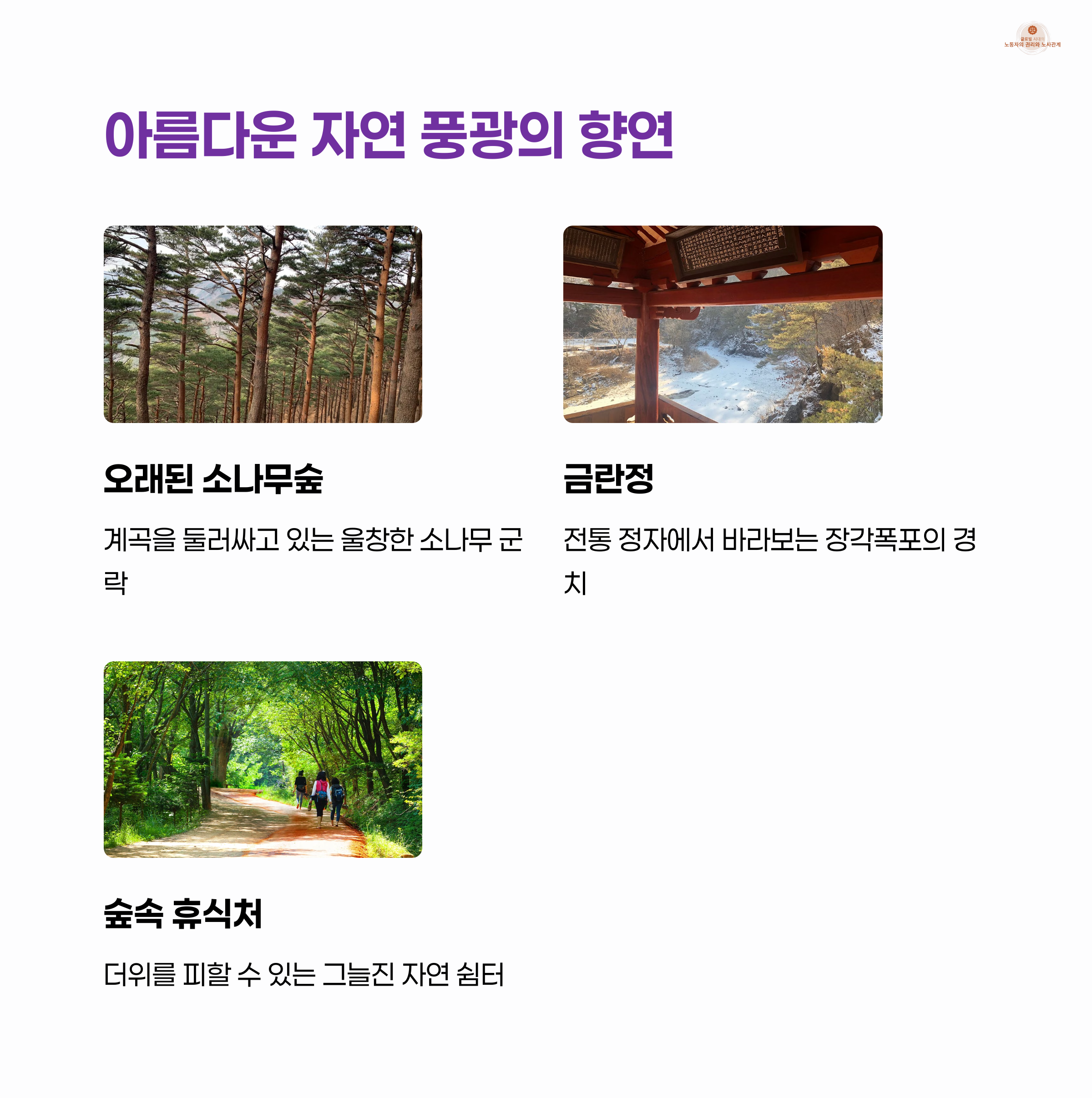 장각폭포는 6m 높이에서 쏟아지는 물줄기와 시원한 물소리 덕분에 마음까지 정화되는 기분을 선사합니다. 주변에 펼쳐진 오래된 소나무숲은 그늘을 제공하여 뜨거운 햇살을 피하기 좋으며, 중간중간 설치된 벤치나 금란정 같은 쉼터는 자연을 감상하며 휴식을 취하기에 최적의 장소입니다. 주차장에서 폭포까지의 접근성도 좋아 아이를 동반한 가족이나 어르신도 부담 없이 즐길 수 있습니다. 단, 매년 이곳에서 사고가 발생하고 있는 만큼 물놀이 시에는 반드시 구명조끼 착용과 깊이 확인 등 기본적인 안전수칙을 준수해야 합니다. 안전이 곧 힐링이라는 점을 기억하세요.