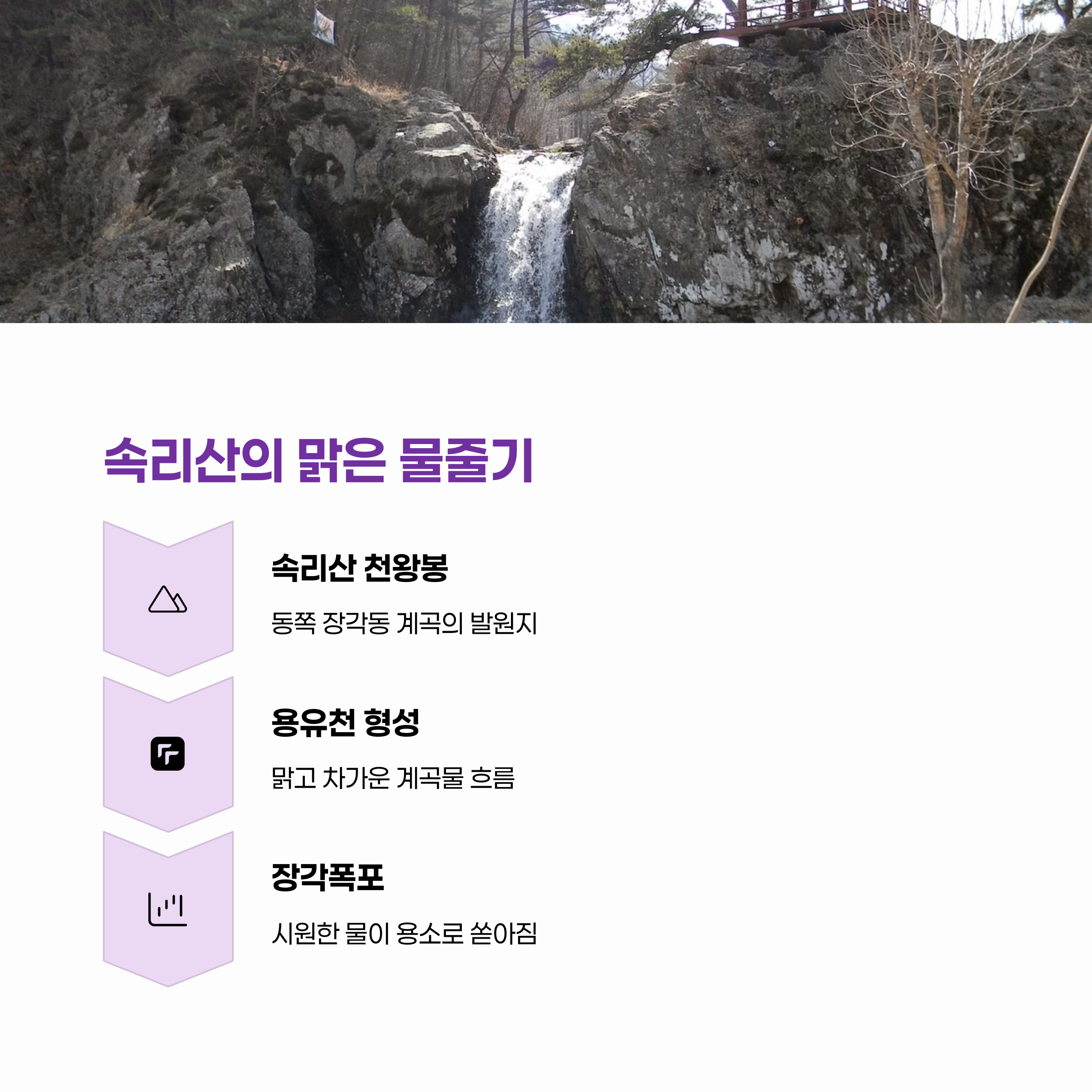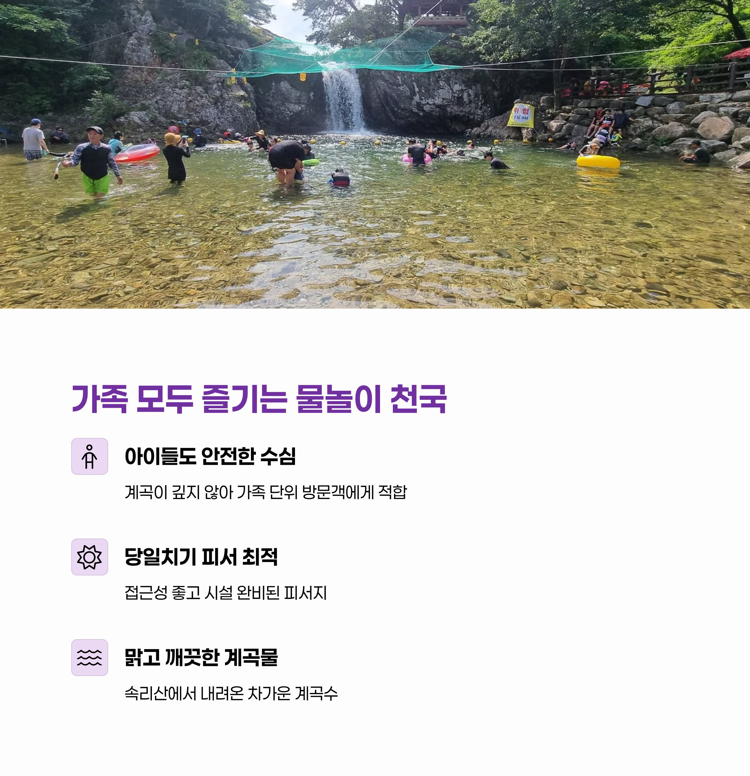 | 속리산 계곡에서 흐르는 청량한 폭포 | 아이들도 안전하게 즐길 수 있는 계곡 | 짧은 거리로 떠나는 여름 피서지 |