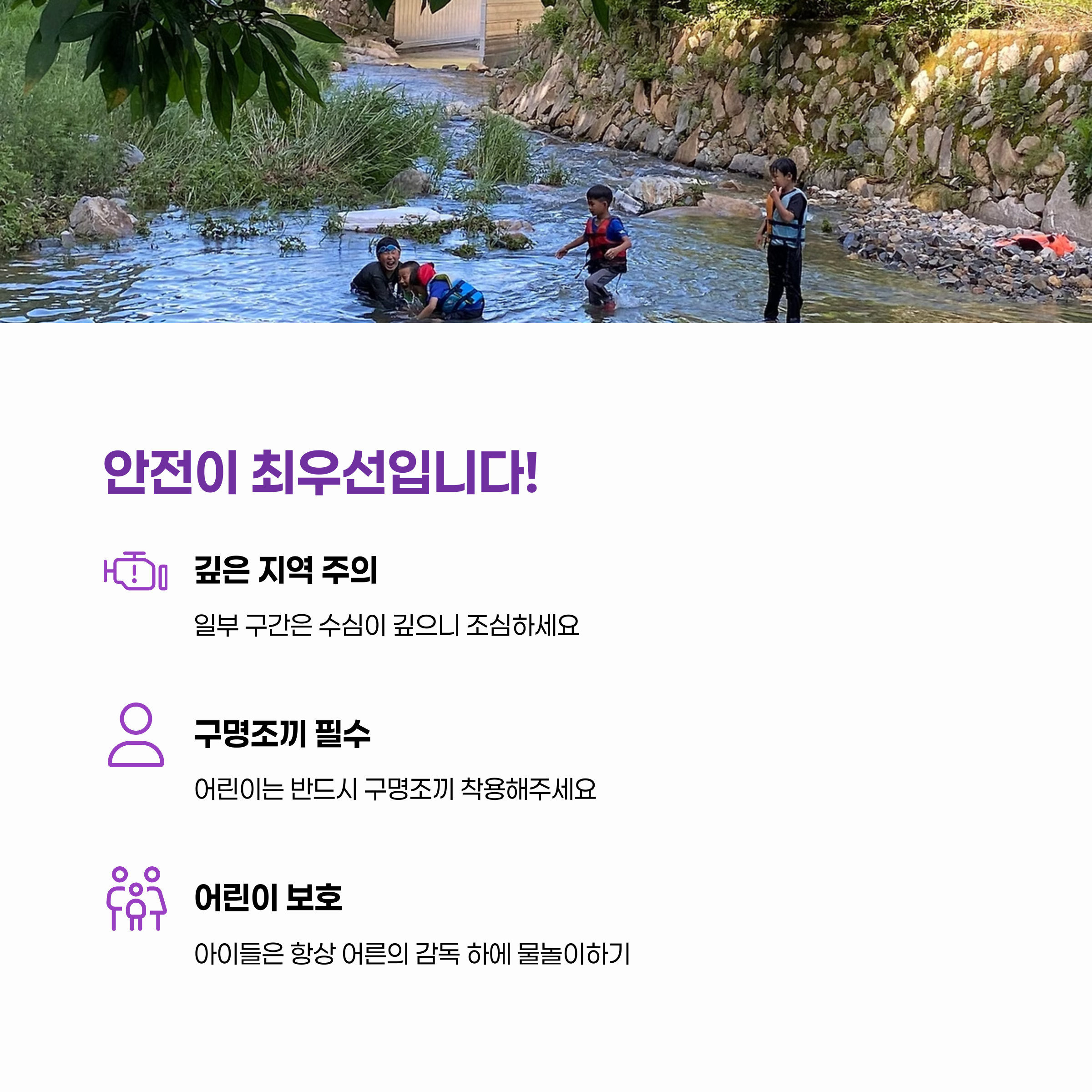| 안전 주의 사항 | 구명조끼 착용 및 수심 확인 필수 |