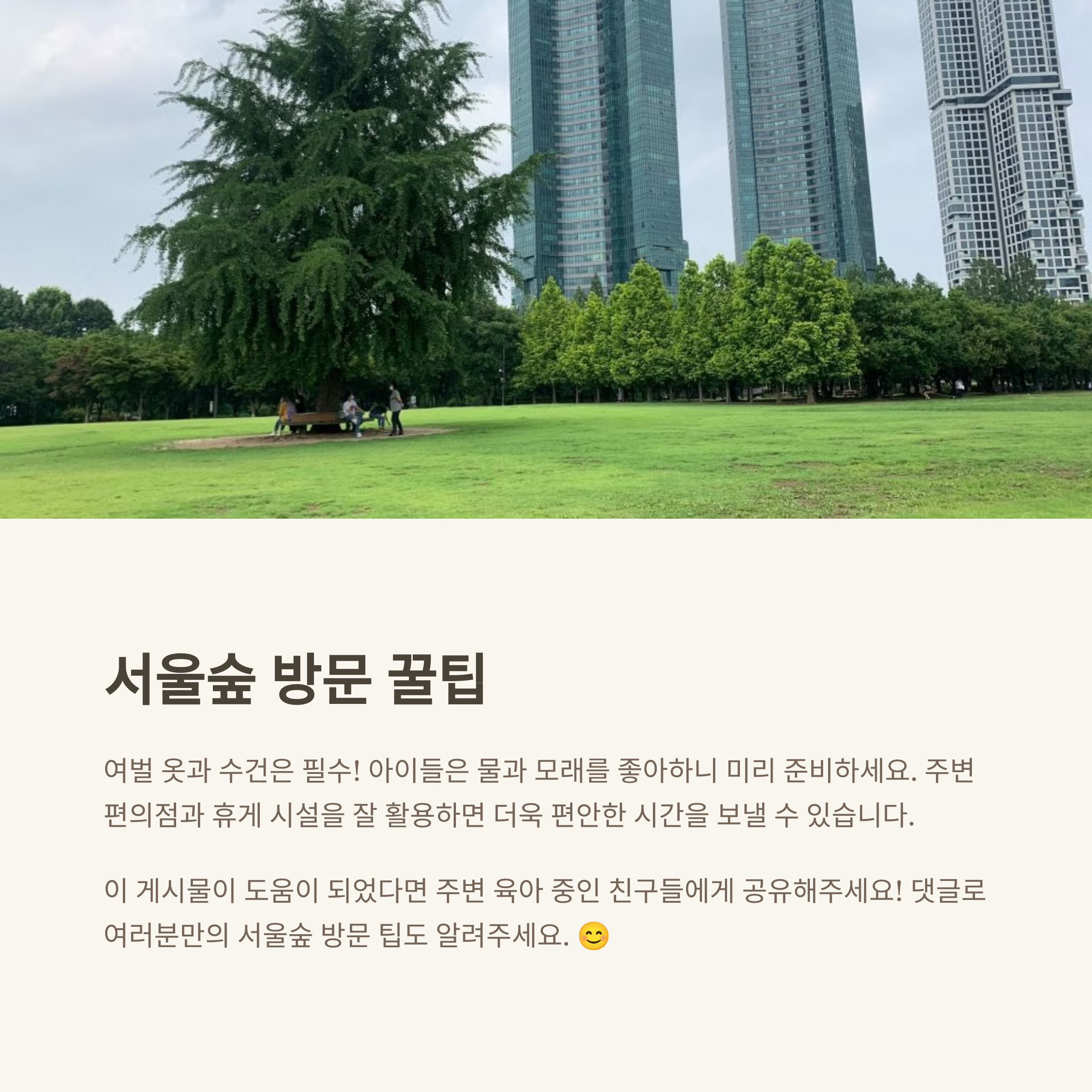아이와 함께한 서울숲 나들이, 가장 좋았던 순간은 언제였나요? 놀이기구 후기나 피크닉 팁을 댓글로 나눠주세요!