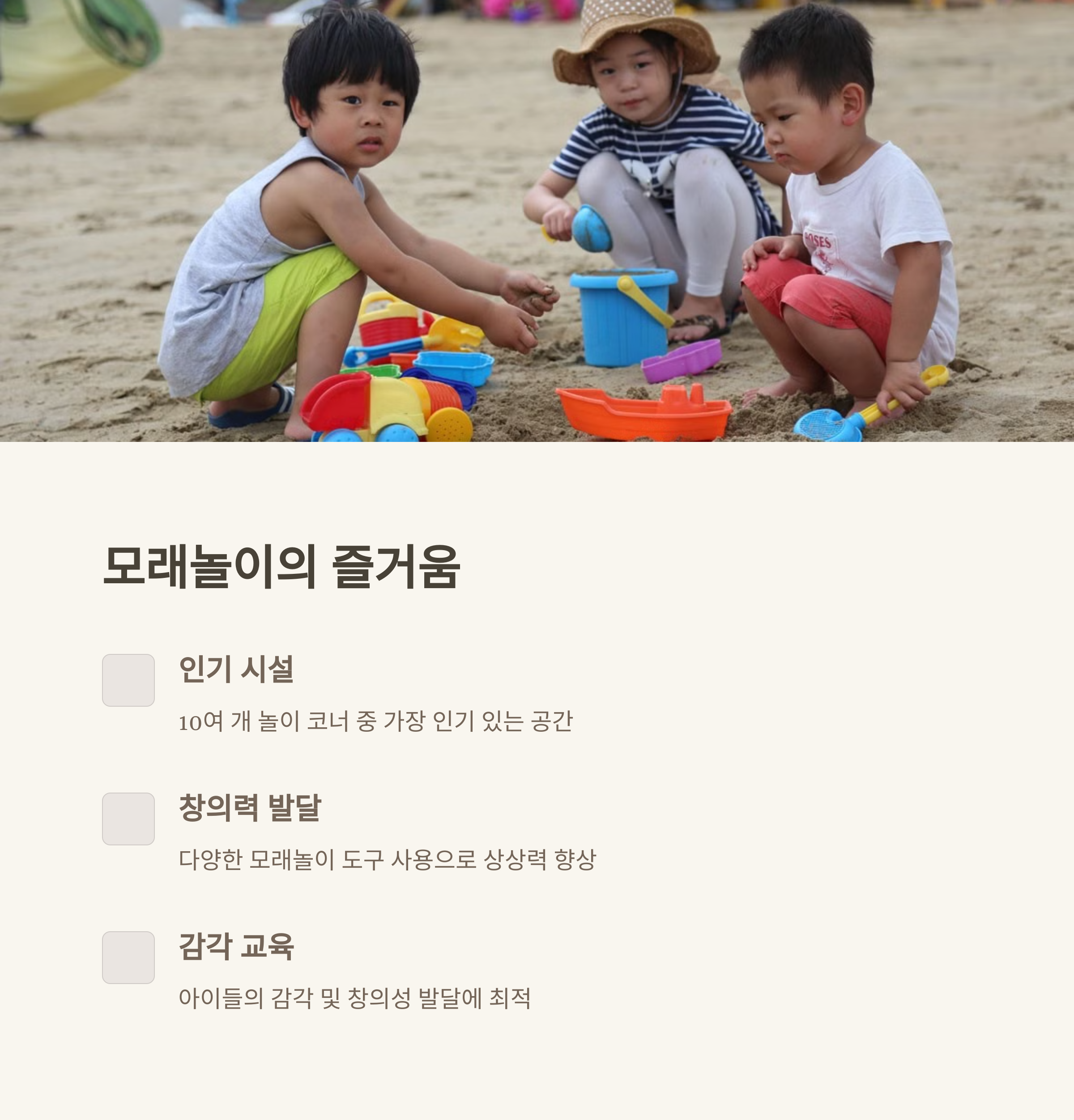 | 창의력 놀이에 도움, 부모 동반 체험 가능 | 서울숲공원과 연계 산책 가능 | 사계절 내내 무료 이용 가능 |